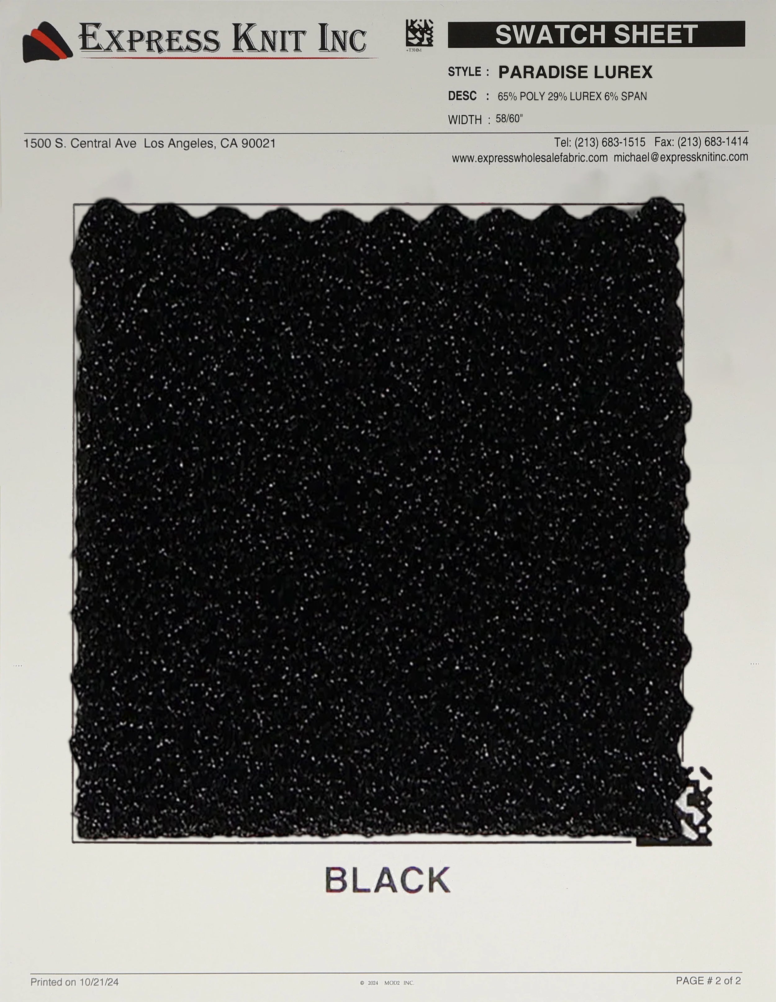 Add sparkle and sophistication to your fabric collection with our Paradise Lurex Fabric. This stunning fabric features a luxurious blend of 65% polyester, 29% lurex, and 6% spandex, creating a fabric with a metallic shimmer and a comfortable stretch. Its eye-catching glitter finish makes it perfect for statement pieces and special occasion designs. With a width of 58/60 inches, this fabric is ideal for a range of garments that demand attention and style.