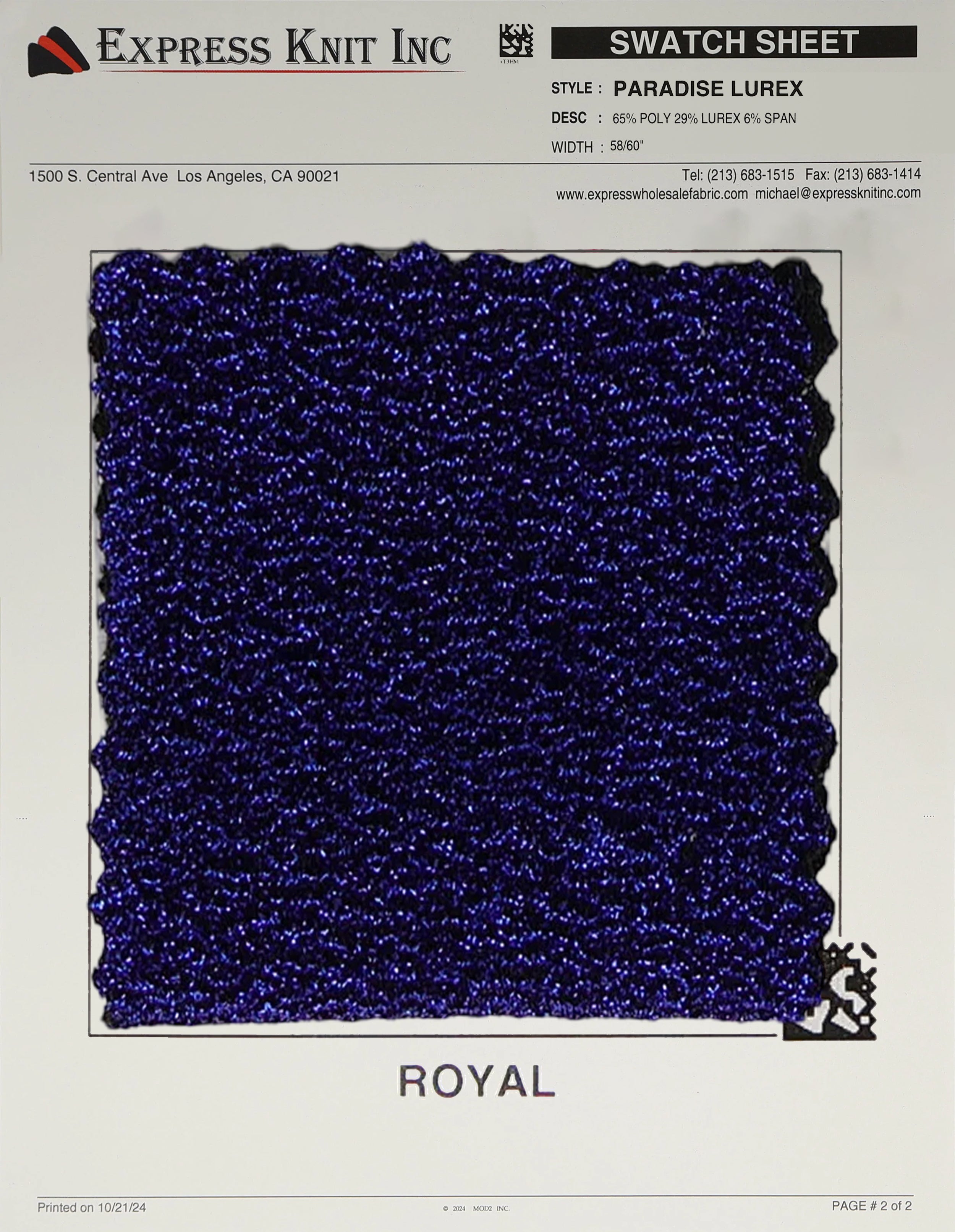 Our Paradise Lurex Fabric is a top choice among wholesale fabric suppliers, eveningwear designers, dancewear creators, and apparel brands looking for fabric with a touch of glam. The high lurex content provides a bold metallic shimmer, available in classic colors like Silver, Gold, Red, Royal, and Black, making it ideal for creating eye-catching dresses, tops, skirts, and performance wear. The polyester-spandex blend ensures durability, while the lurex adds elegance and a festive flair.