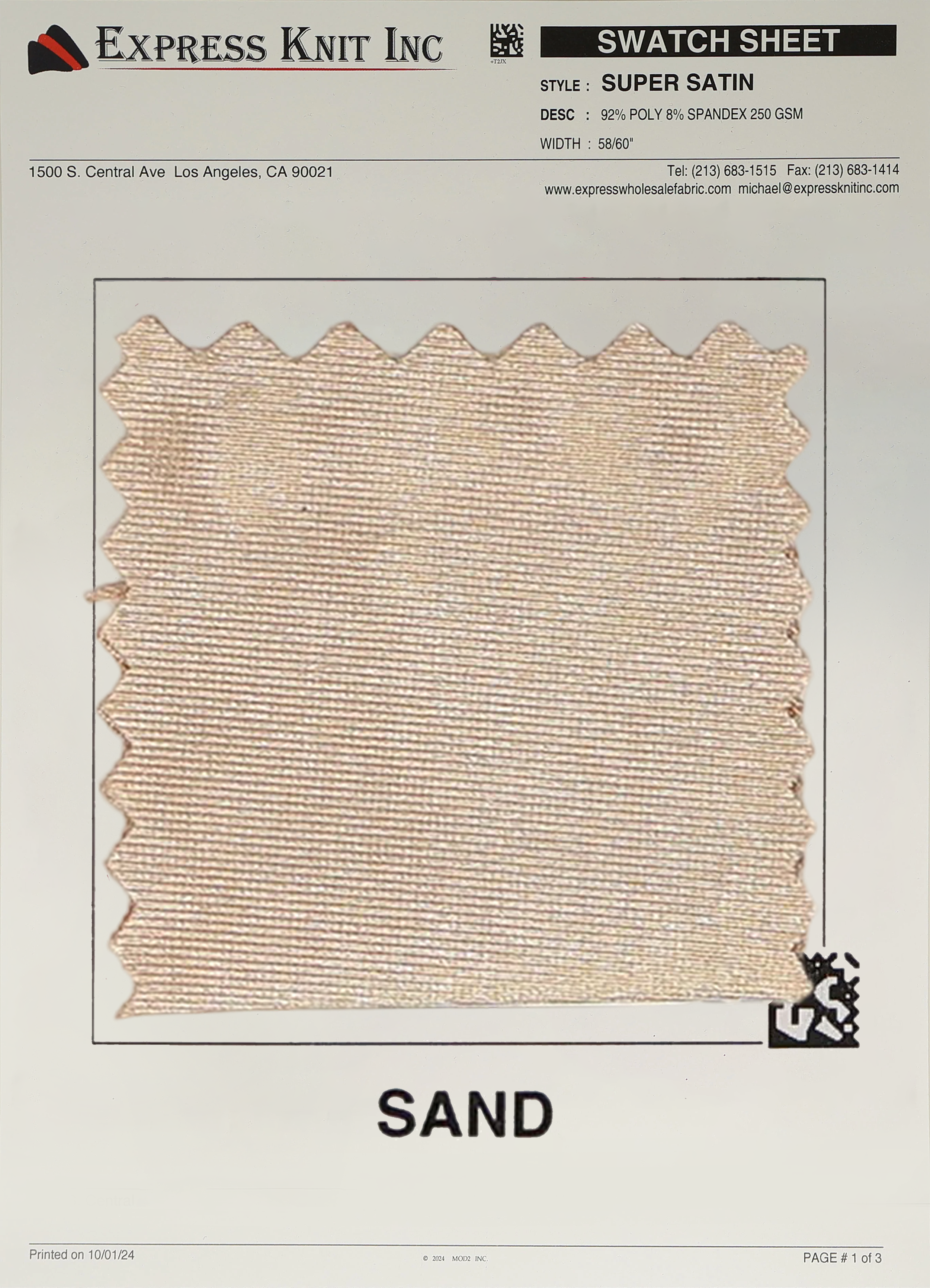 Elevate your collection with our Super Satin Fabric, a premium blend of 92% polyester and 8% spandex. With a weight of 250 GSM and a width of 58/60 inches, this fabric boasts a smooth, lustrous finish and a subtle stretch, making it ideal for high-end garments and accessories. Its satin sheen and soft hand feel make it a versatile choice for fashion-forward designs.