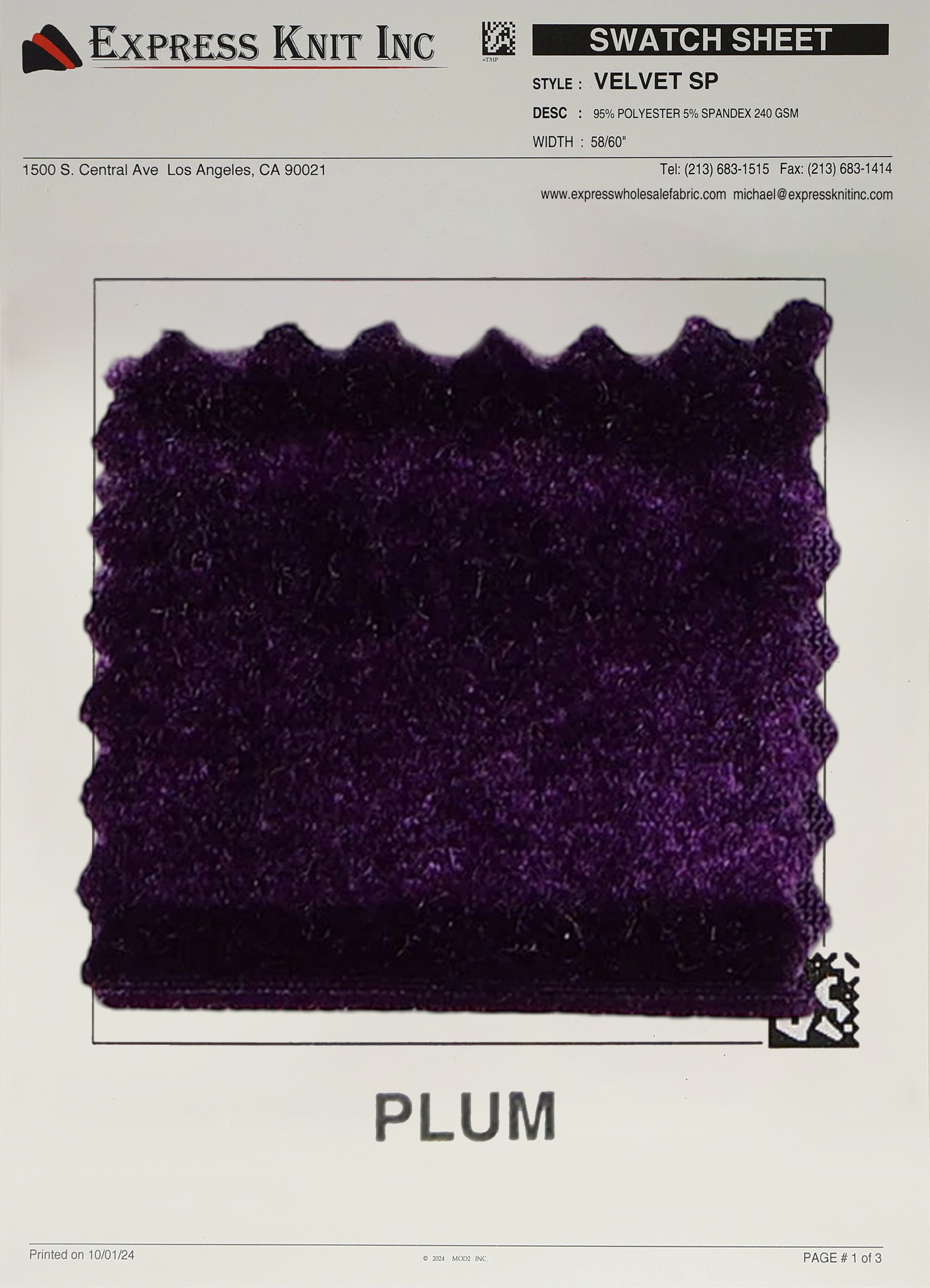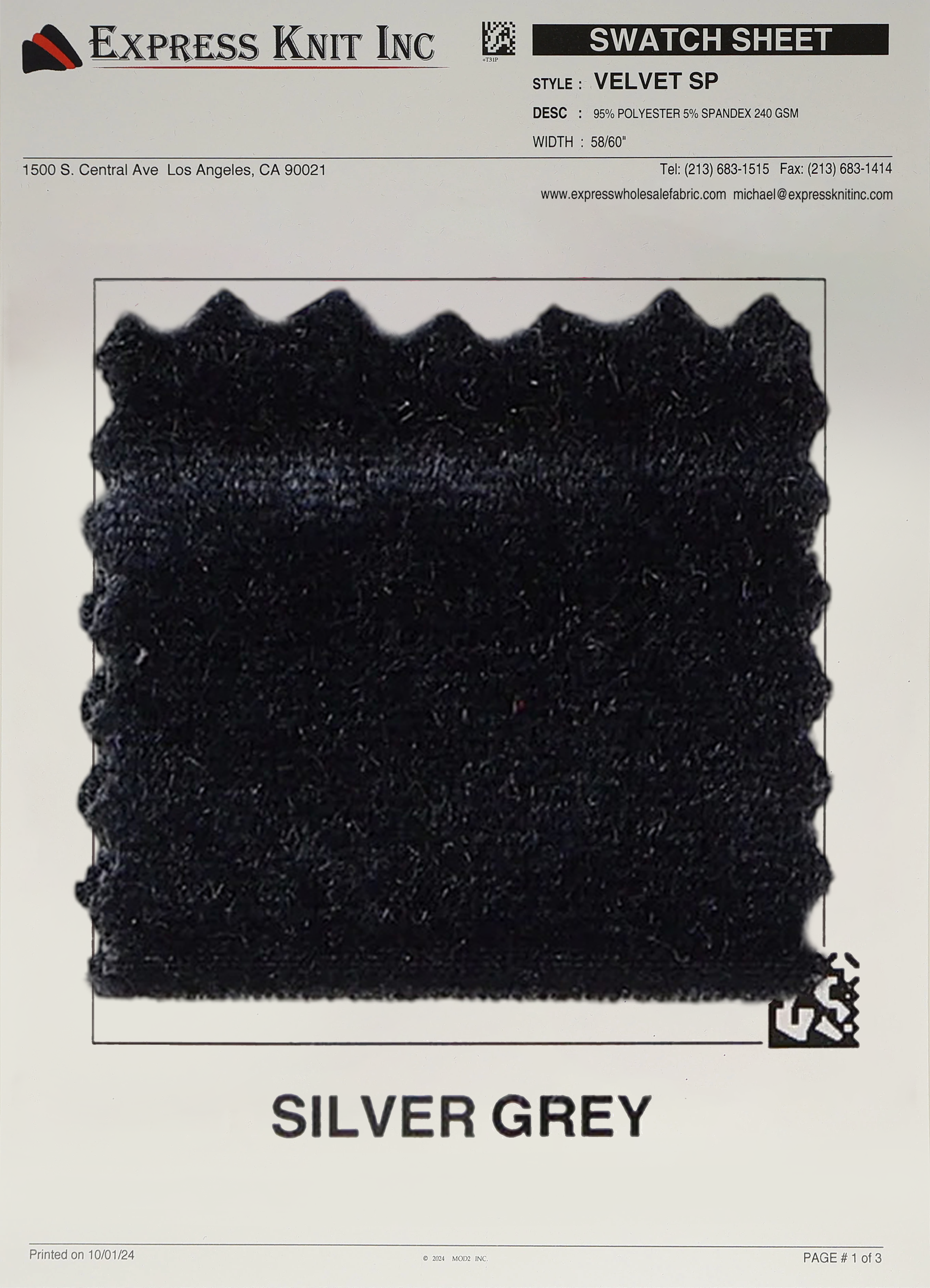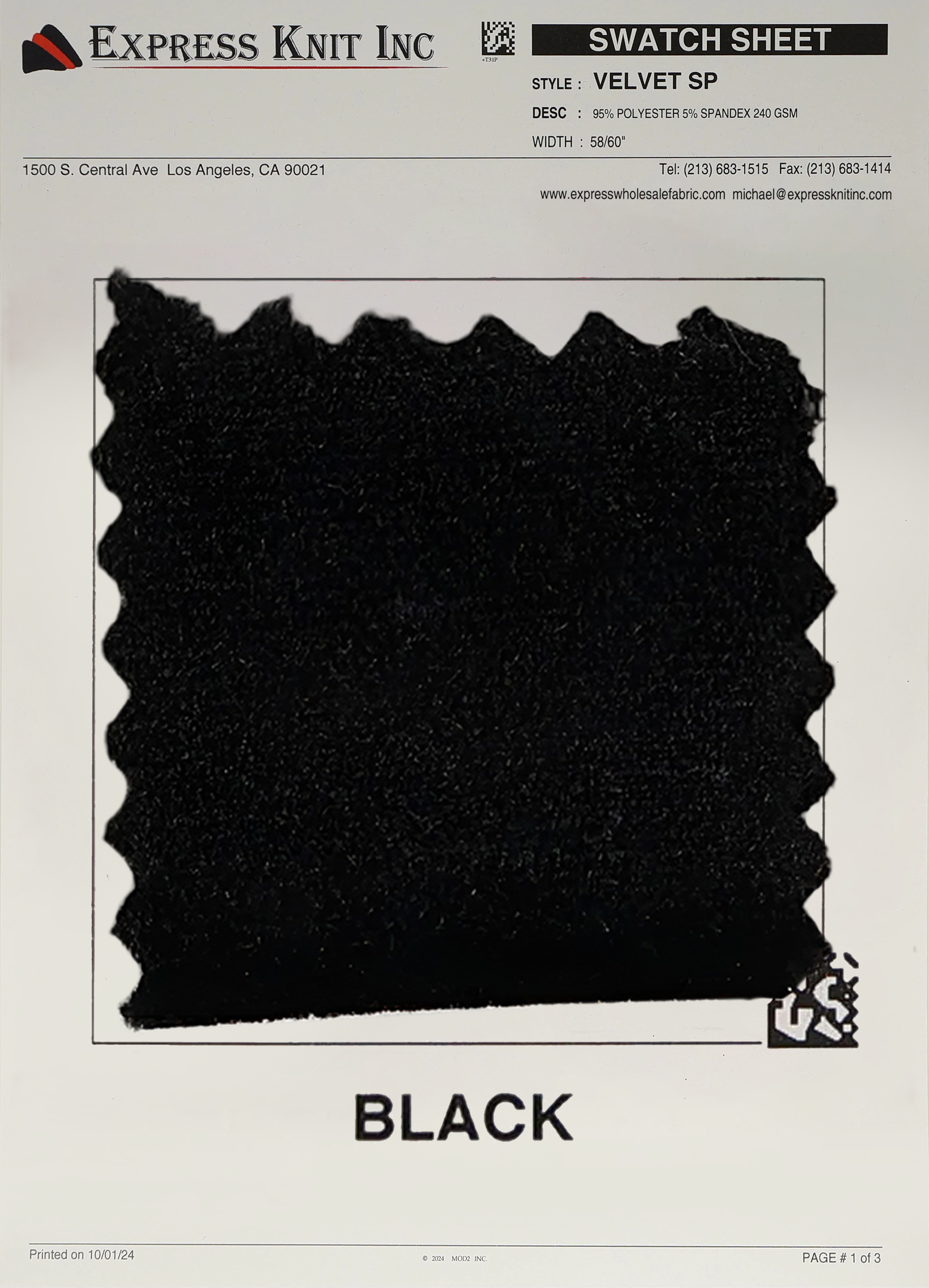 Add elegance and luxurious texture to your fabric collection with our Velvet SP Fabric. This fabric is crafted from a premium blend of 95% polyester and 5% spandex, providing a soft, plush feel with a subtle stretch for added comfort and flexibility. At 240 GSM, it’s the perfect medium-weight fabric, offering the right balance of drape and structure. With a width of 58/60 inches, Velvet SP is ideal for both high-end fashion and cozy, everyday wear.