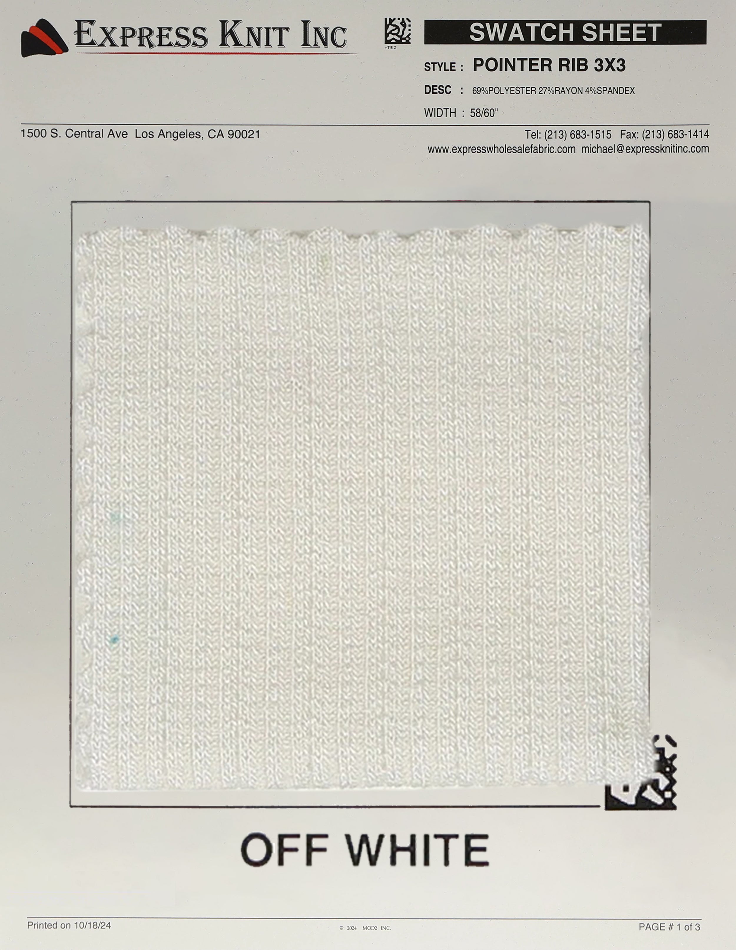 Wholesale Pointer Rib 3x3 Fabric - 69% Polyester, 27% Rayon, 4% Spandex, 180 GSM, 58/60 Inches Wide