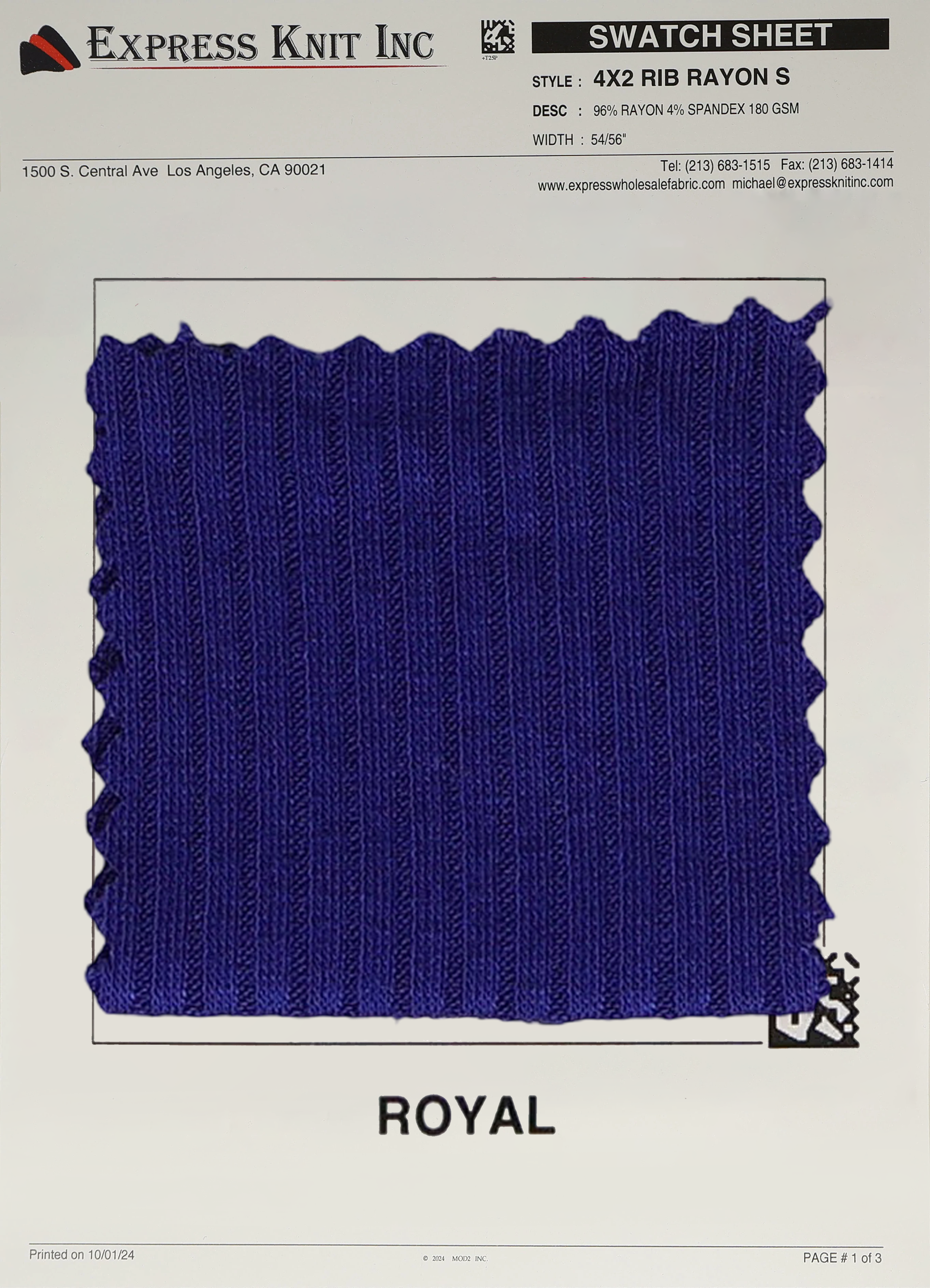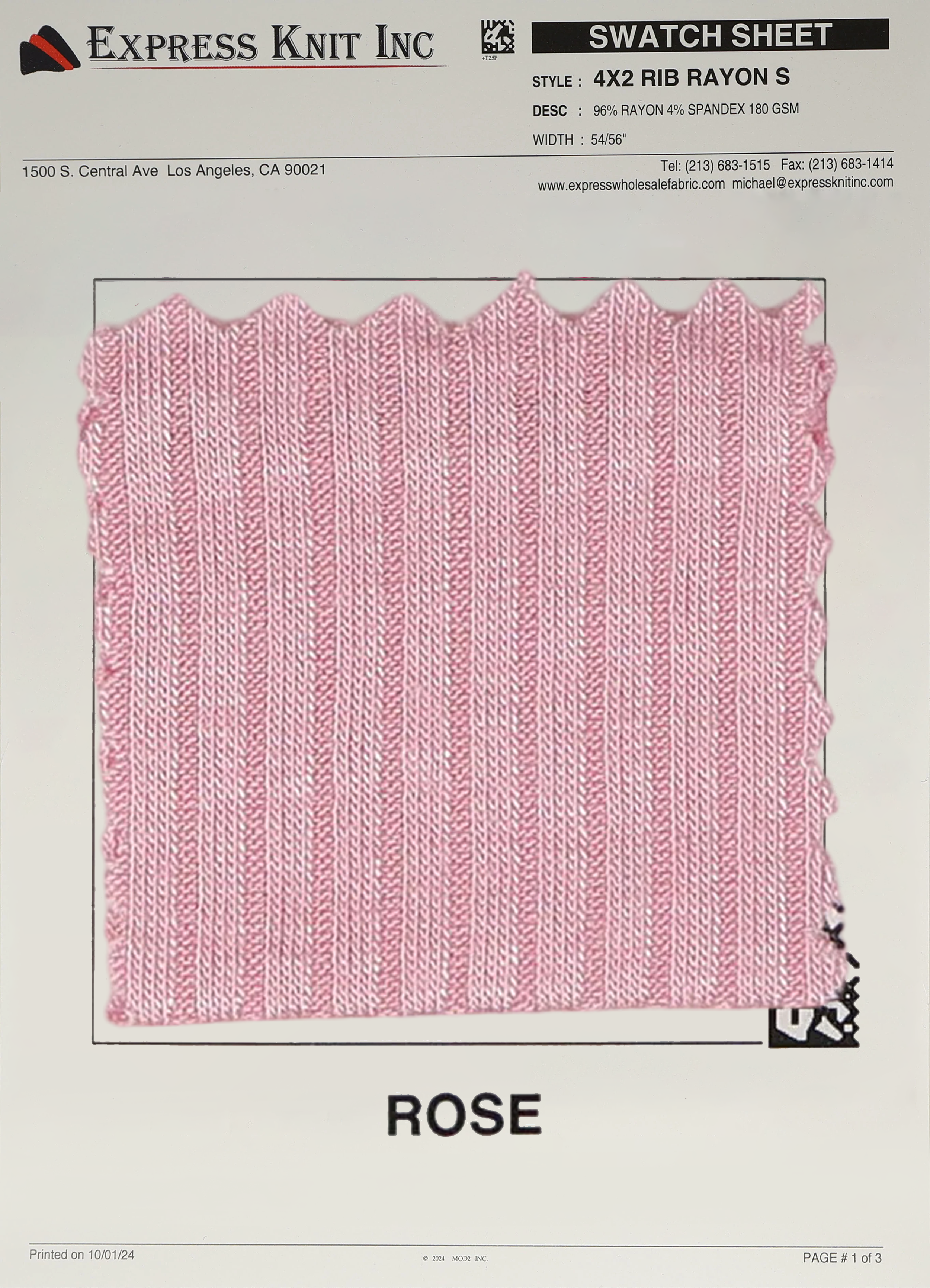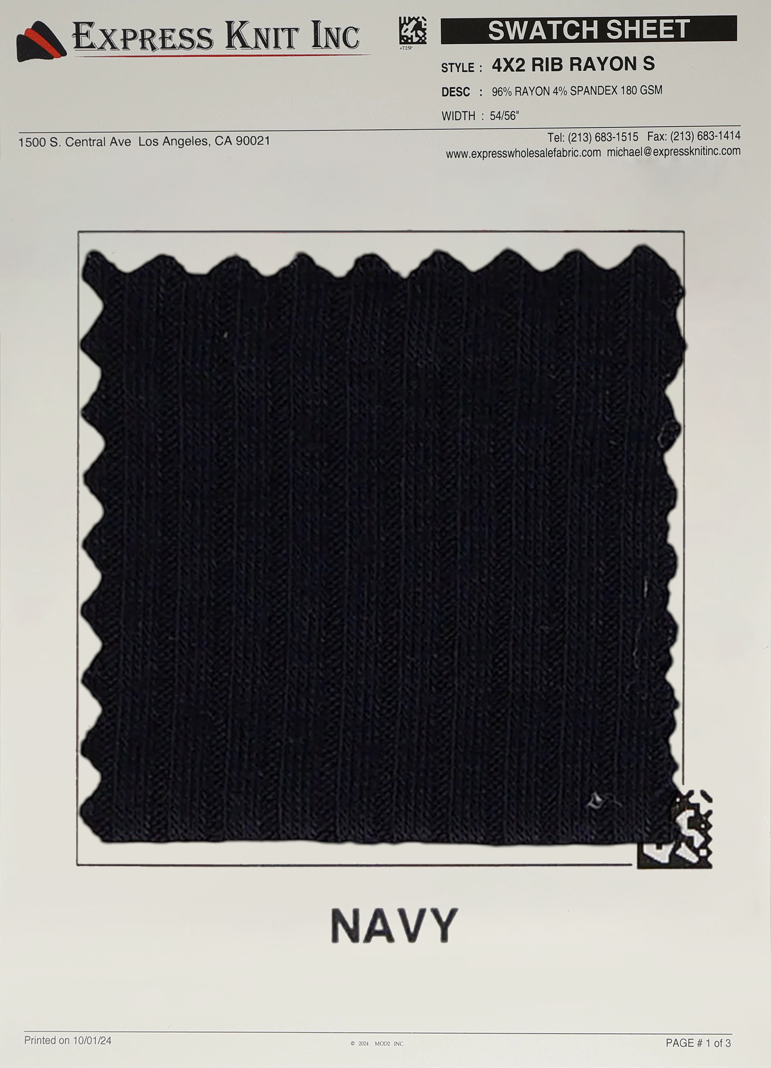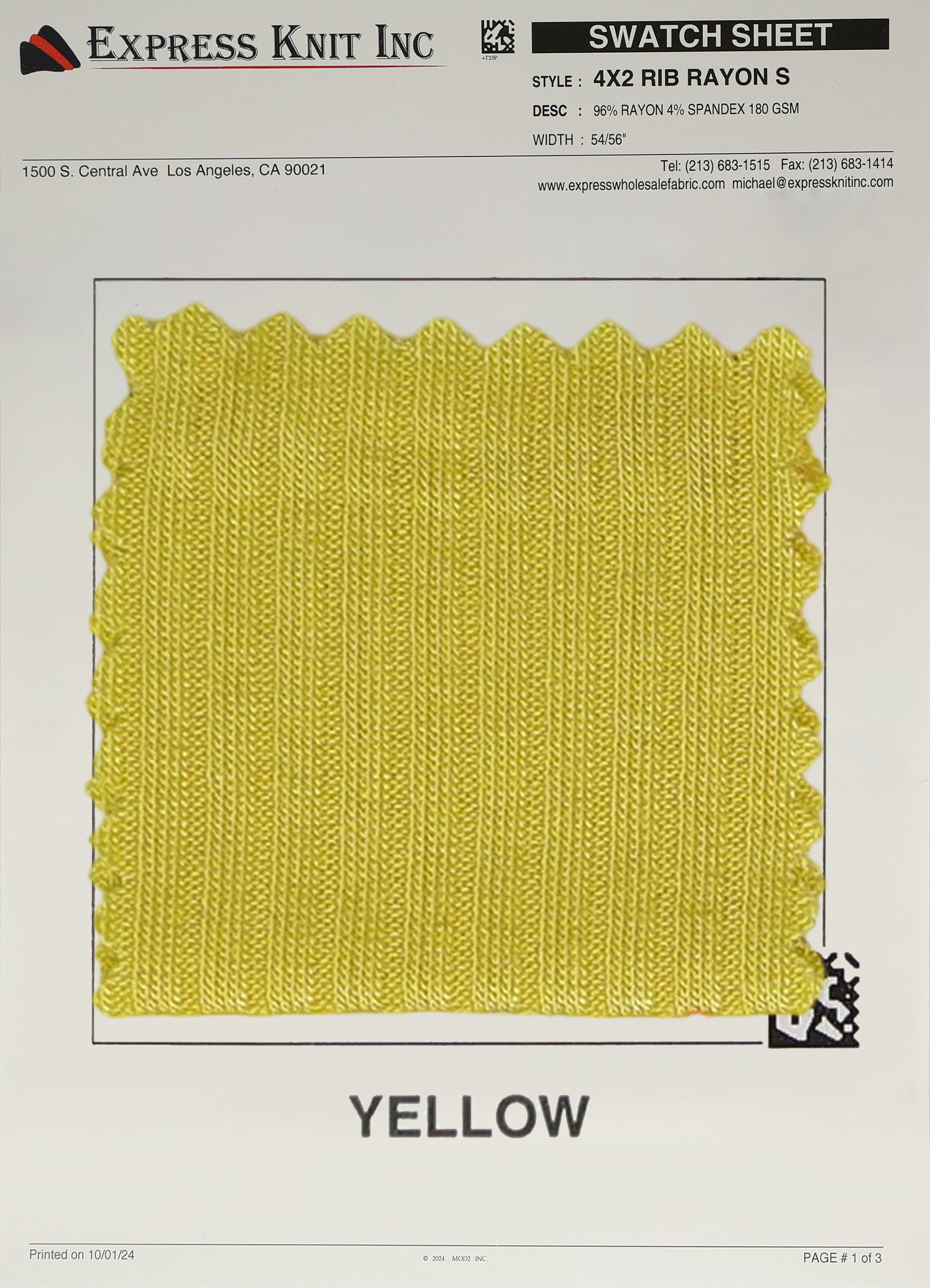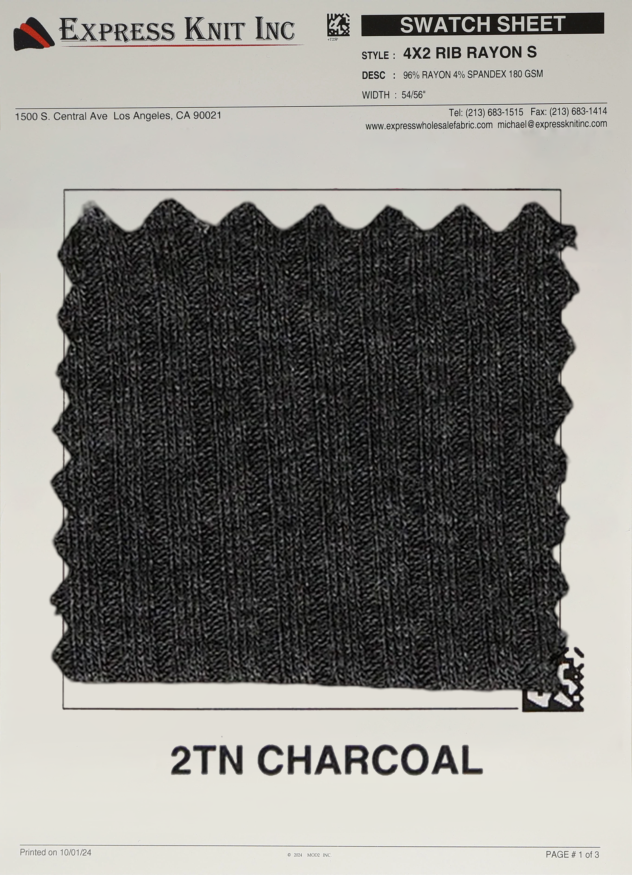 Elevate your inventory with our 4x2 Rib Rayon Spandex Knit Solid Fabric, crafted for luxurious softness, stretch, and style. With 96% Rayon and 4% Spandex, this fabric provides a lightweight, breathable feel at 180 GSM, ideal for creating comfortable and versatile garments. Its 4x2 rib texture adds depth and detail, while the 54-56 inch width makes it perfect for bulk orders and larger projects.
