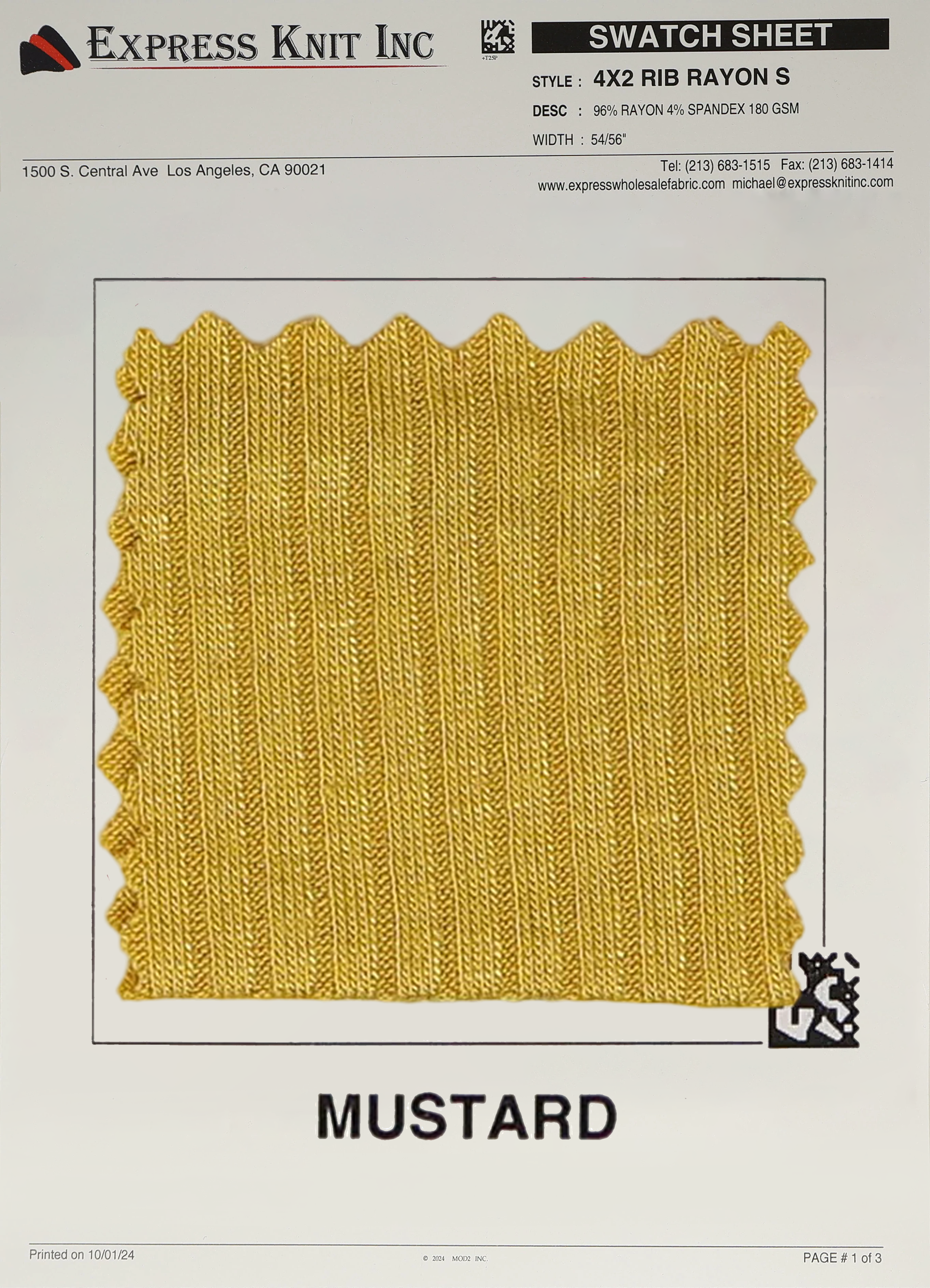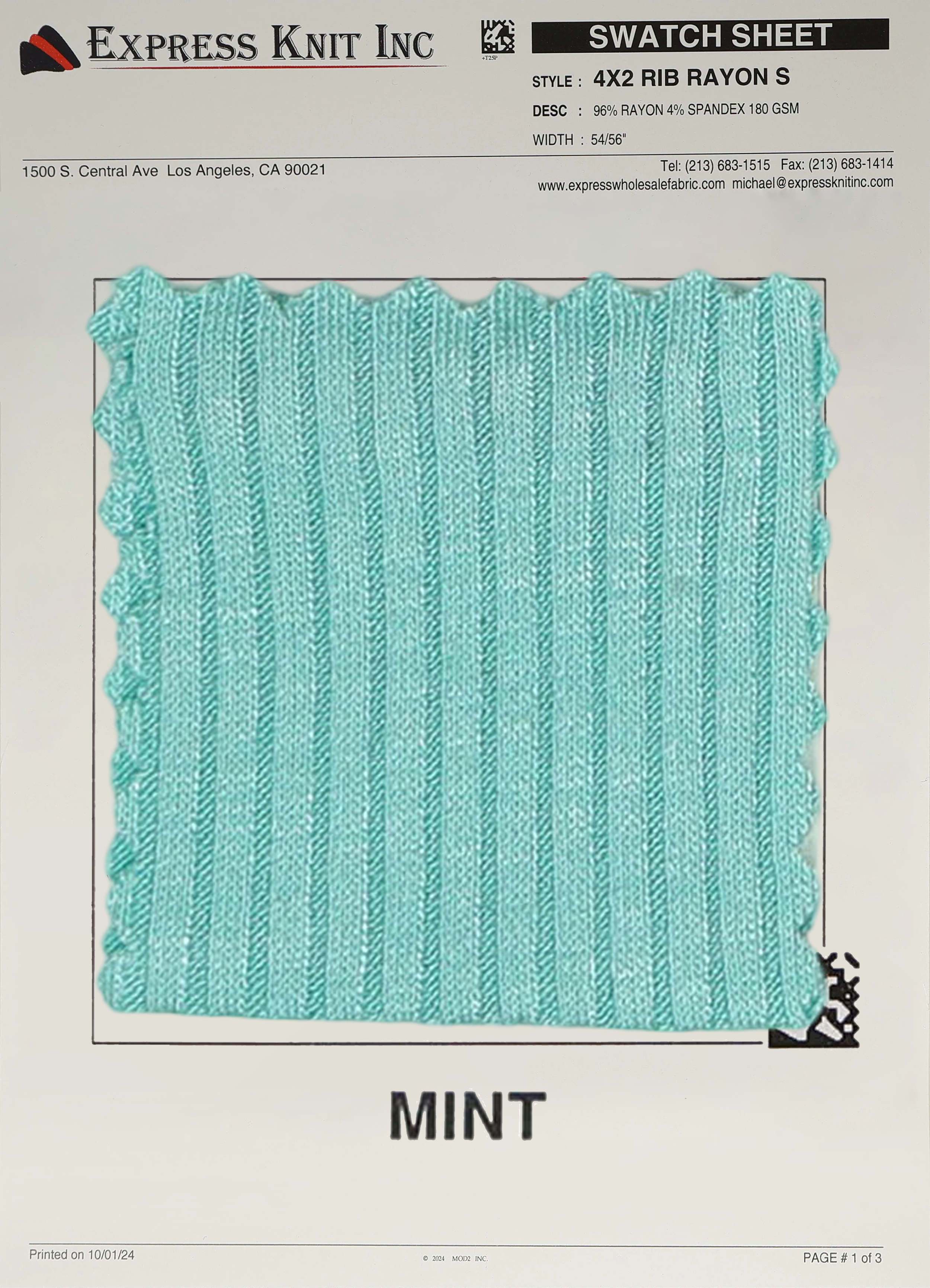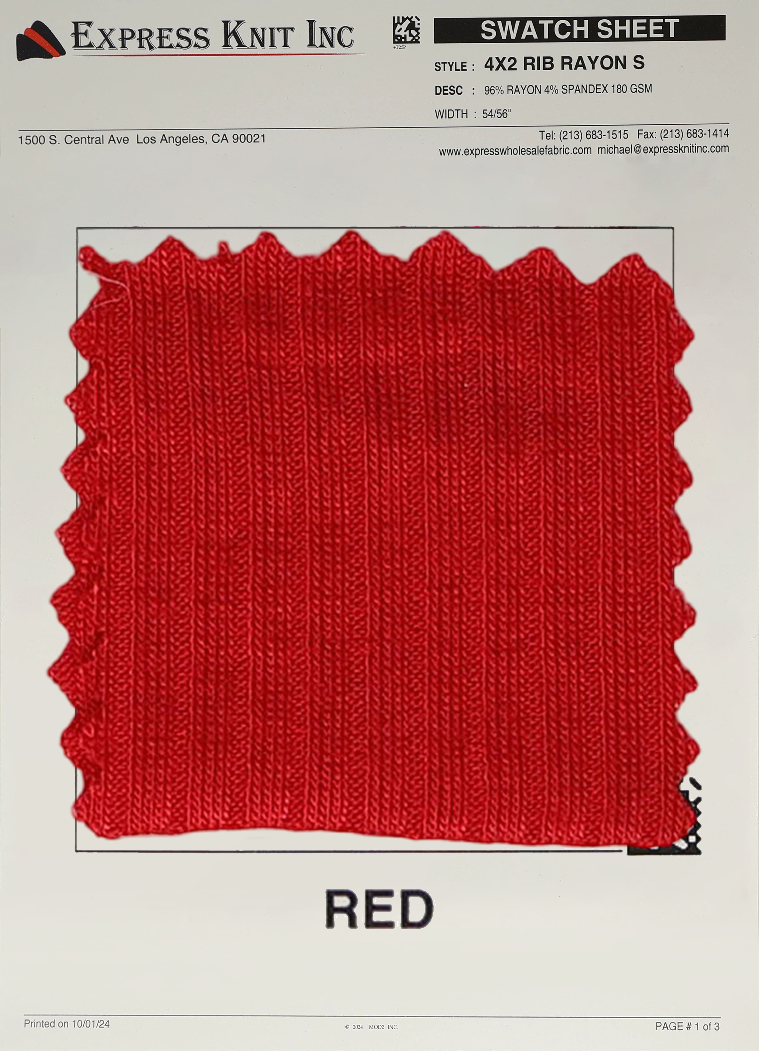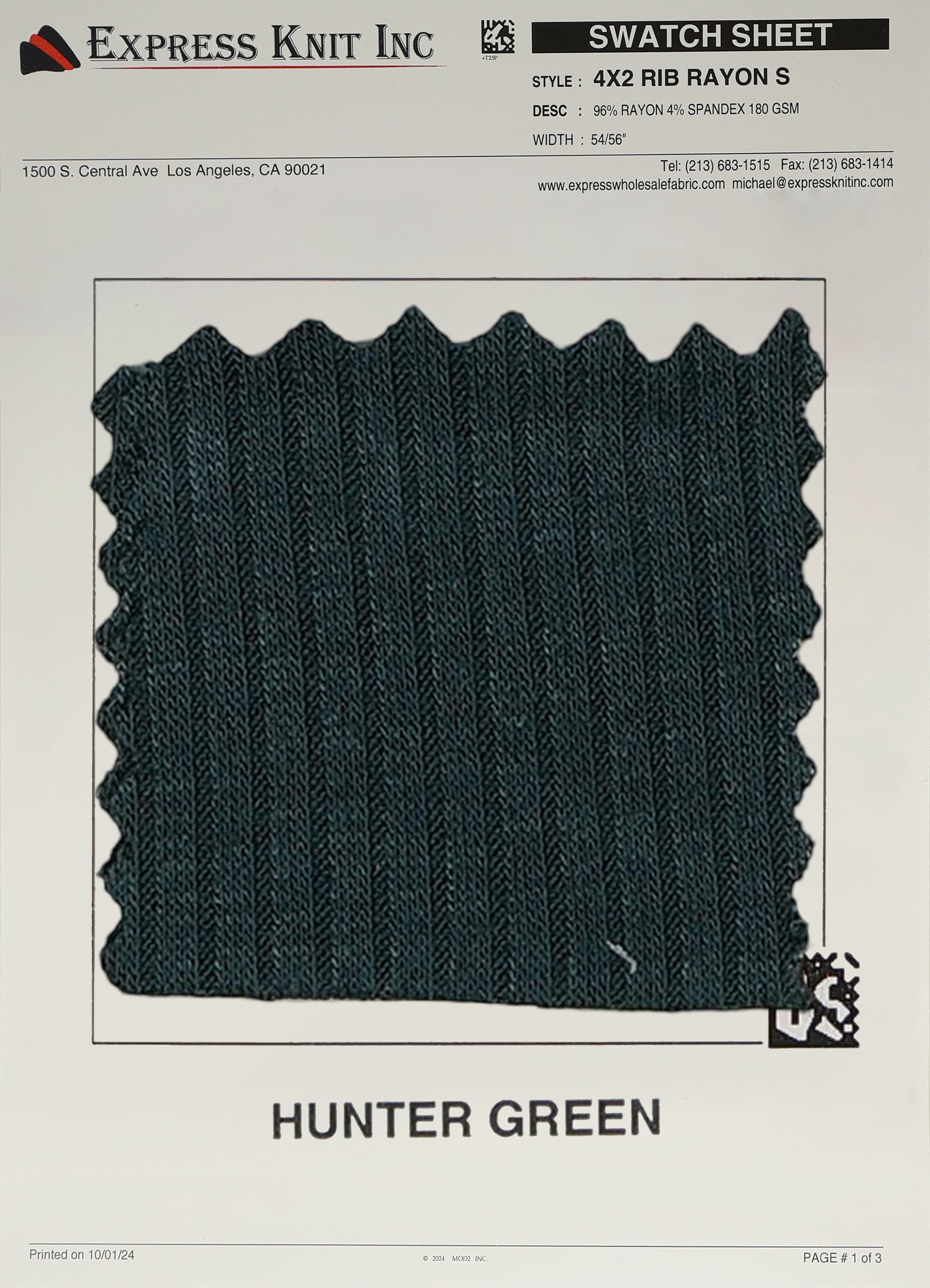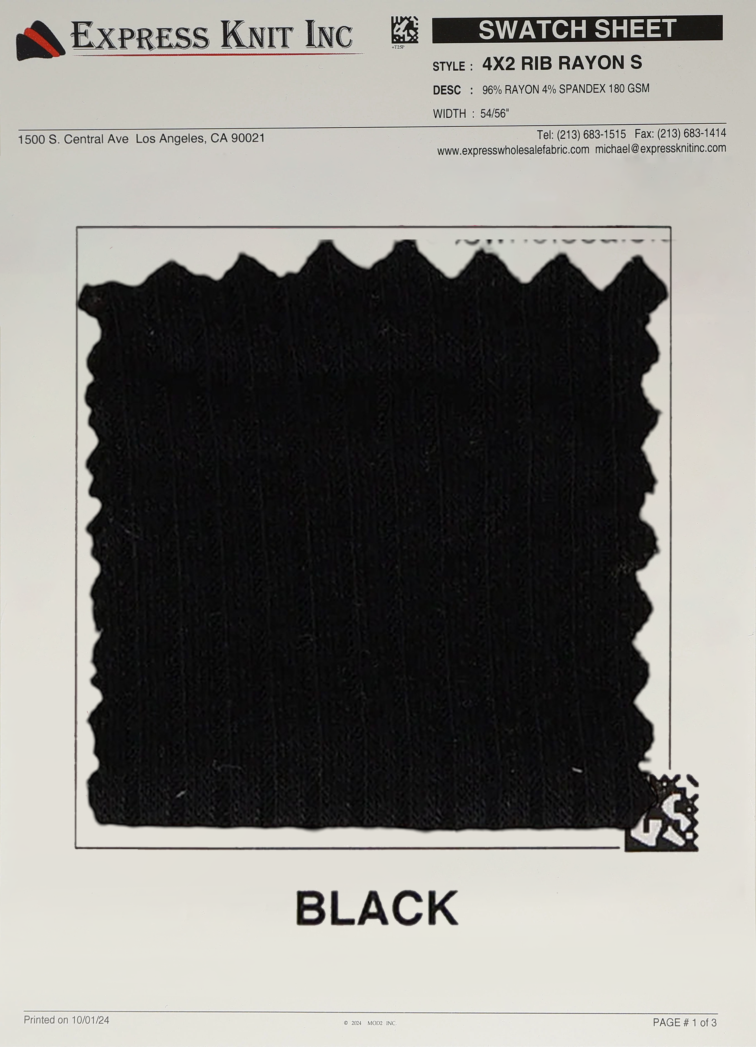 Elevate your inventory with our 4x2 Rib Rayon Spandex Knit Solid Fabric, crafted for luxurious softness, stretch, and style. With 96% Rayon and 4% Spandex, this fabric provides a lightweight, breathable feel at 180 GSM, ideal for creating comfortable and versatile garments. Its 4x2 rib texture adds depth and detail, while the 54-56 inch width makes it perfect for bulk orders and larger projects.