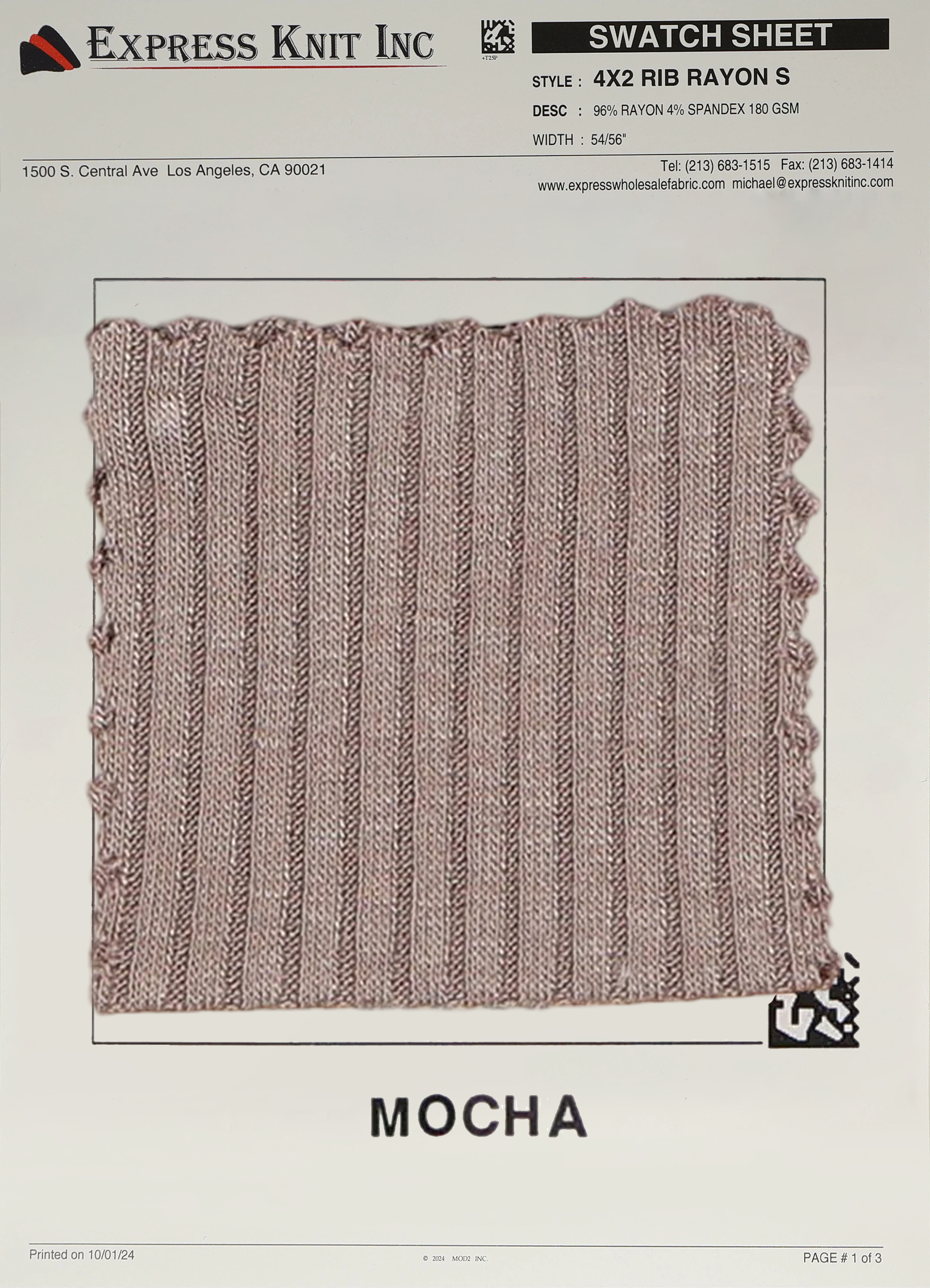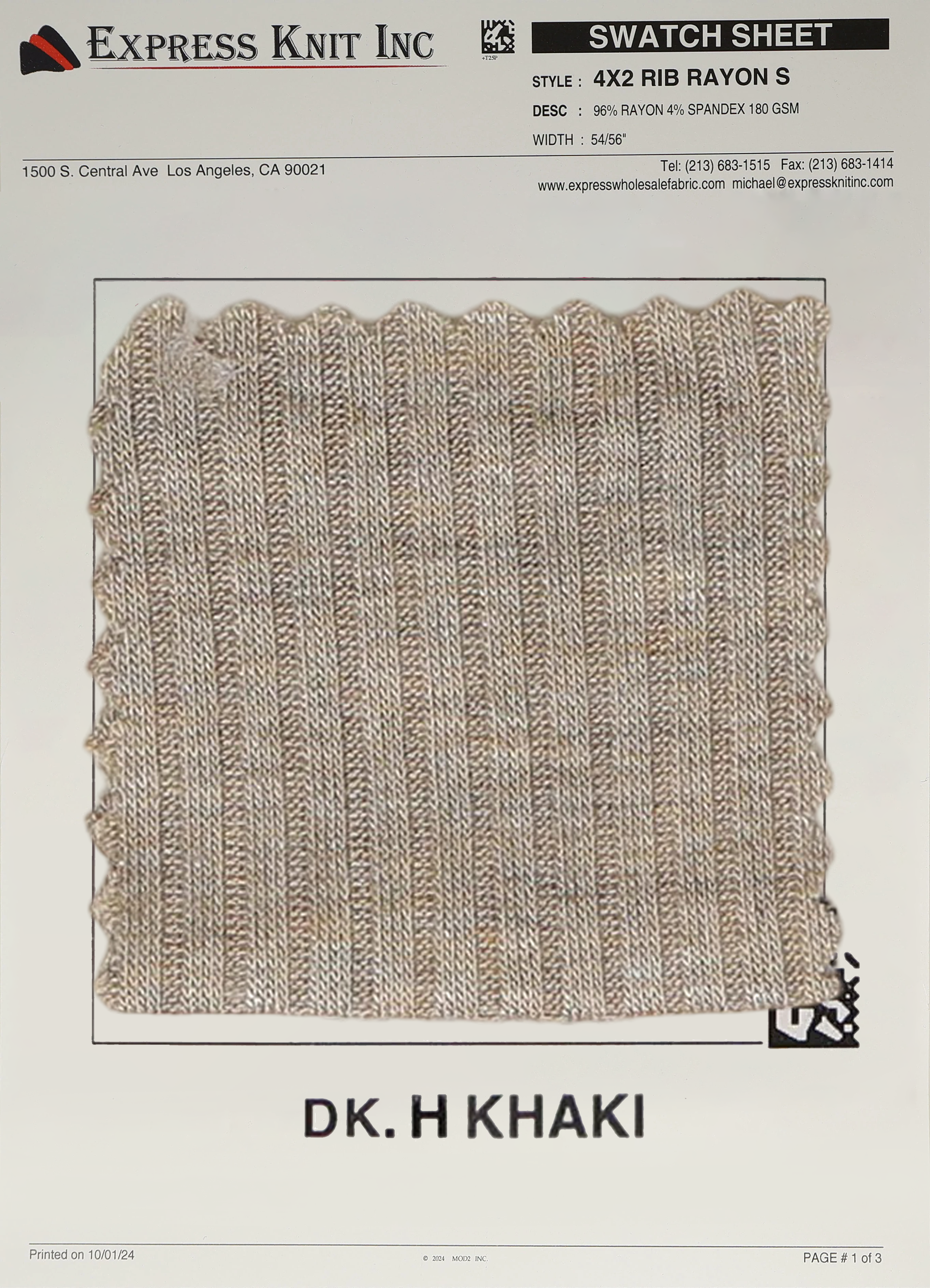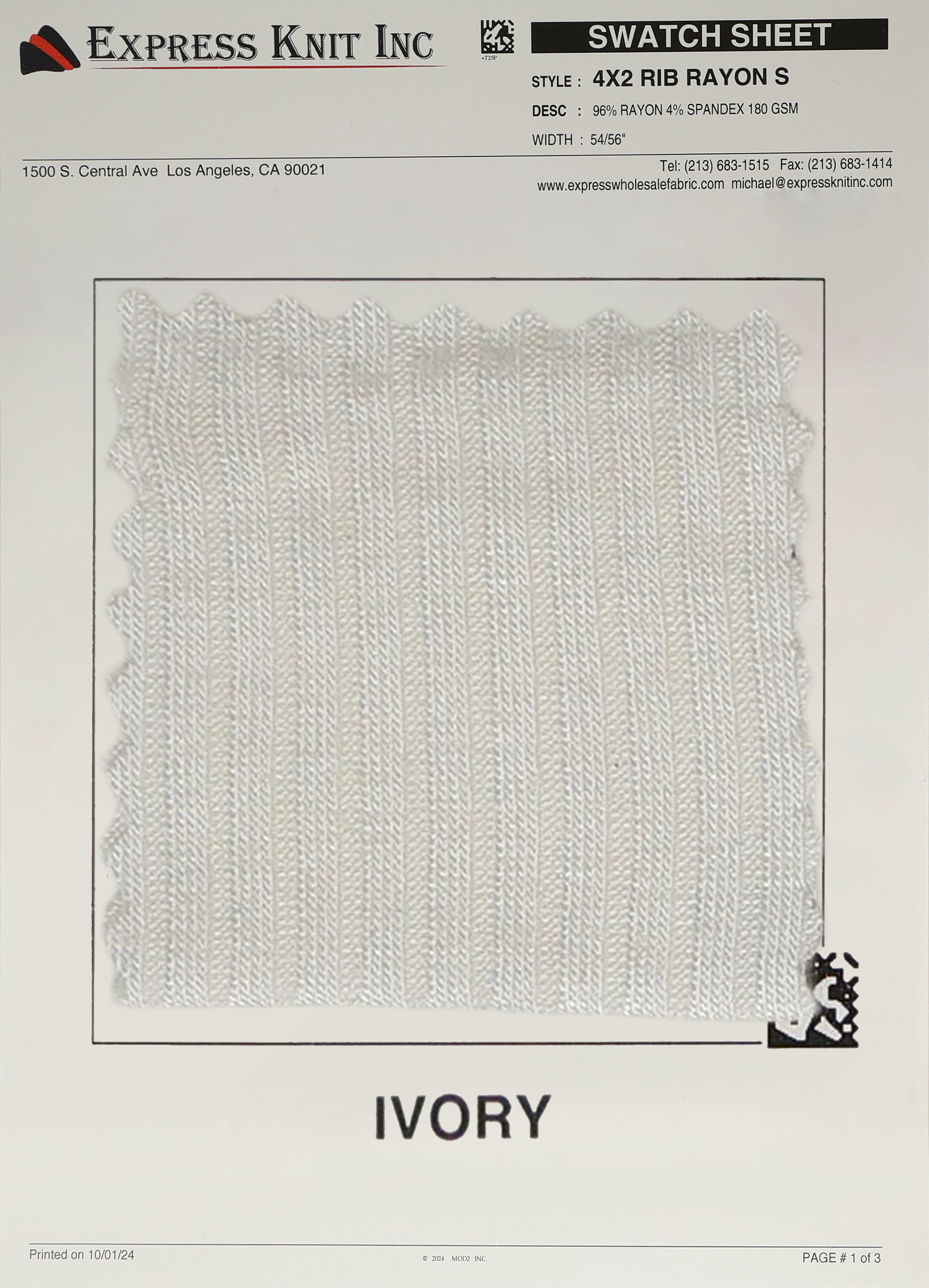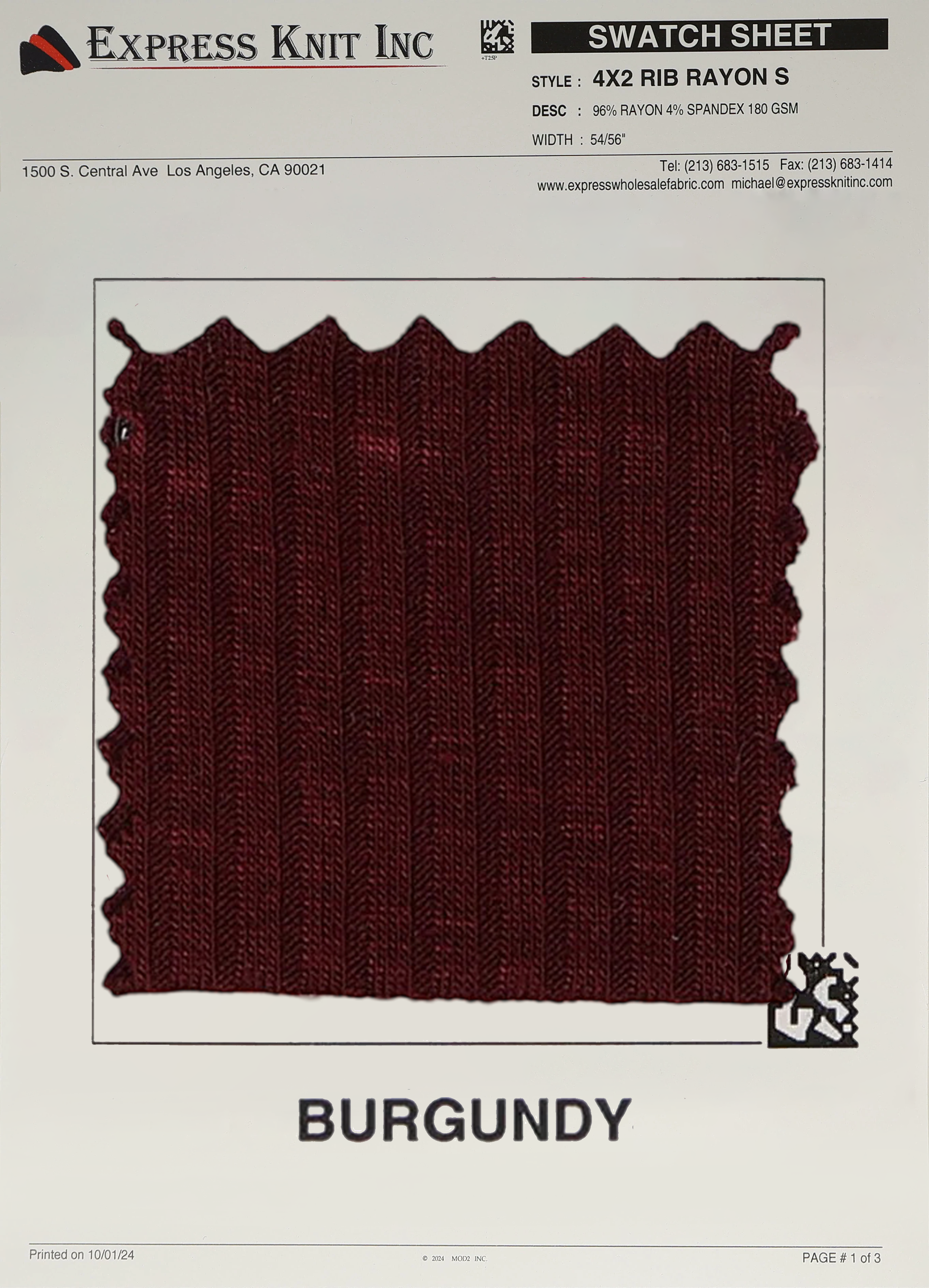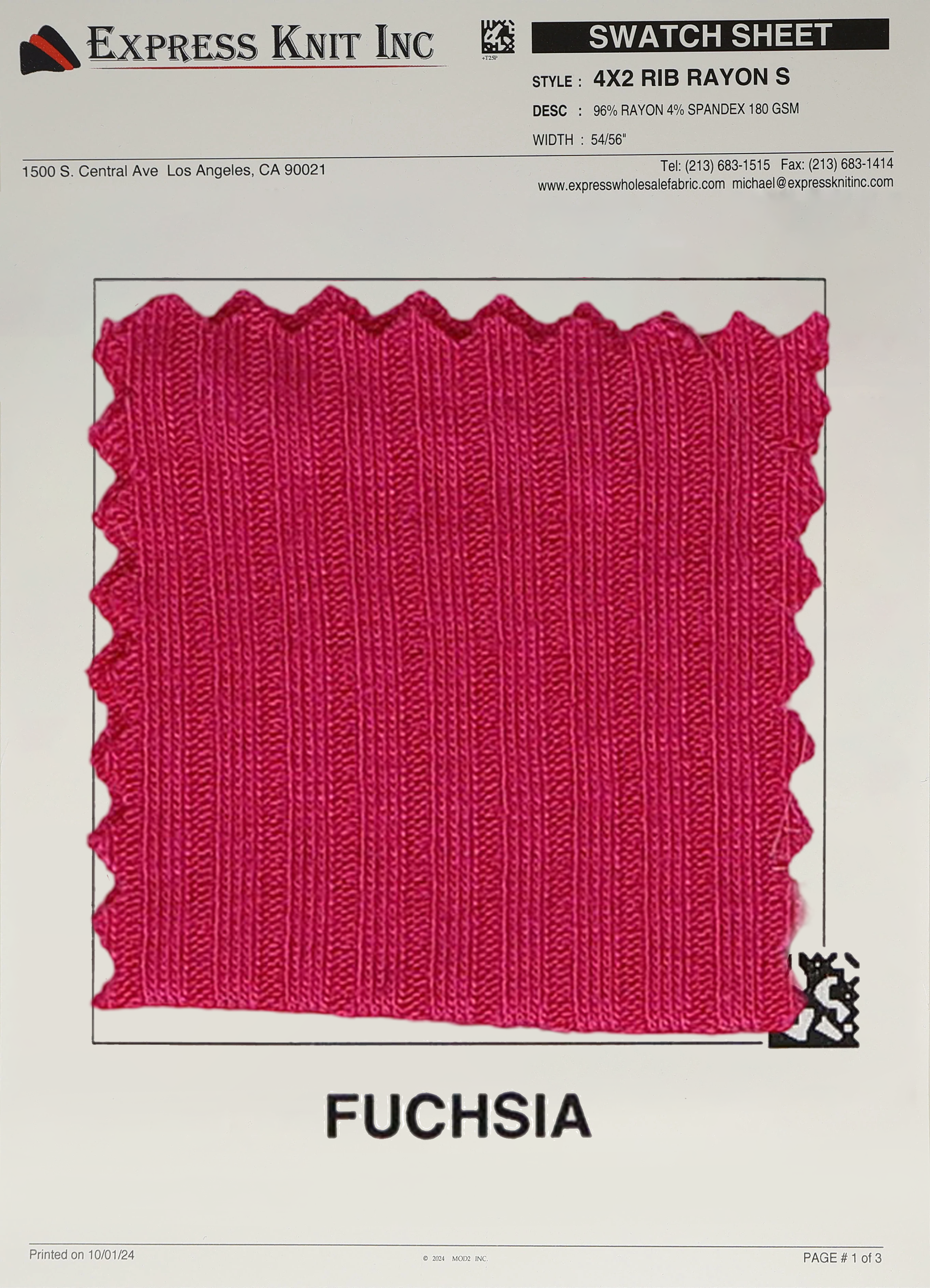 Elevate your inventory with our 4x2 Rib Rayon Spandex Knit Solid Fabric, crafted for luxurious softness, stretch, and style. With 96% Rayon and 4% Spandex, this fabric provides a lightweight, breathable feel at 180 GSM, ideal for creating comfortable and versatile garments. Its 4x2 rib texture adds depth and detail, while the 54-56 inch width makes it perfect for bulk orders and larger projects.