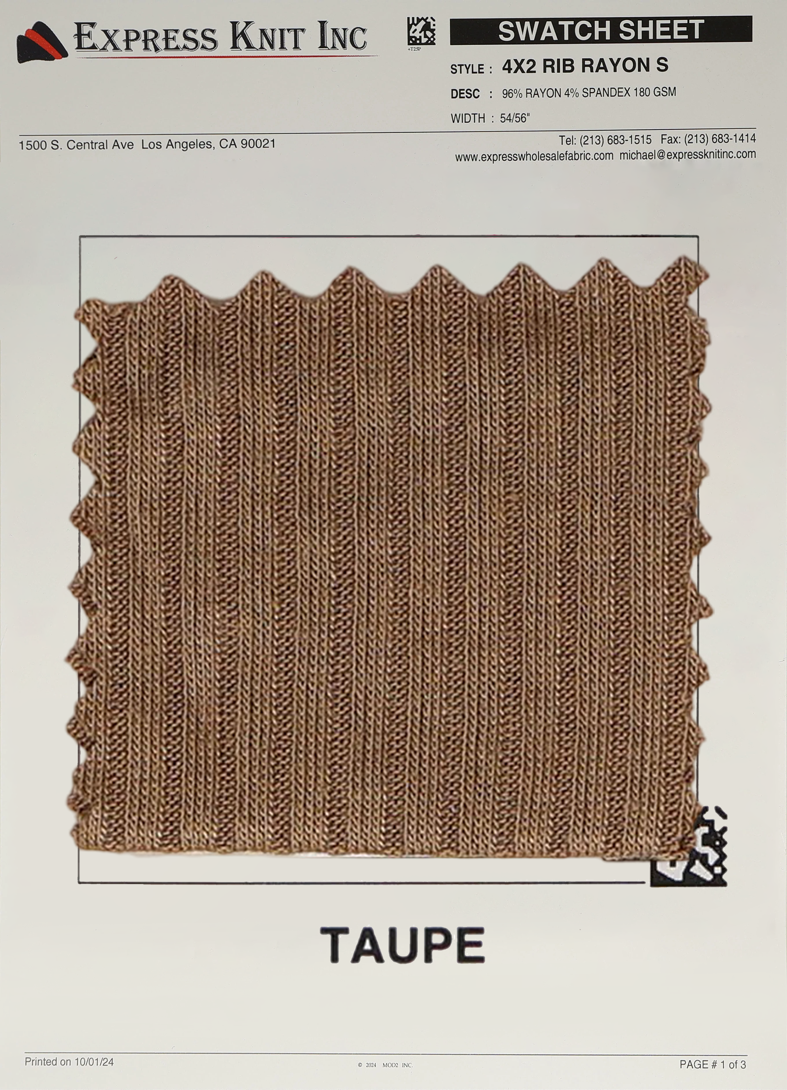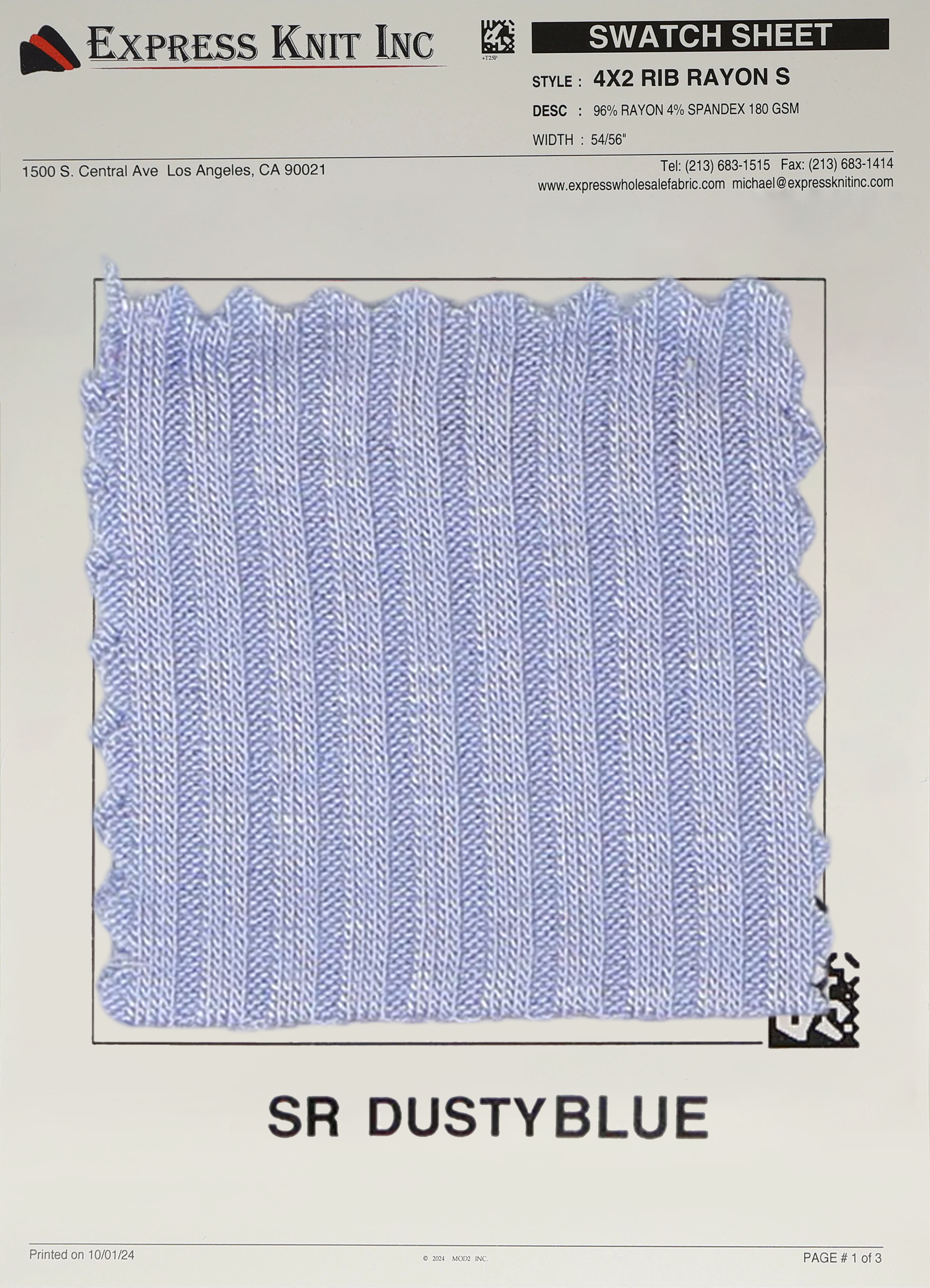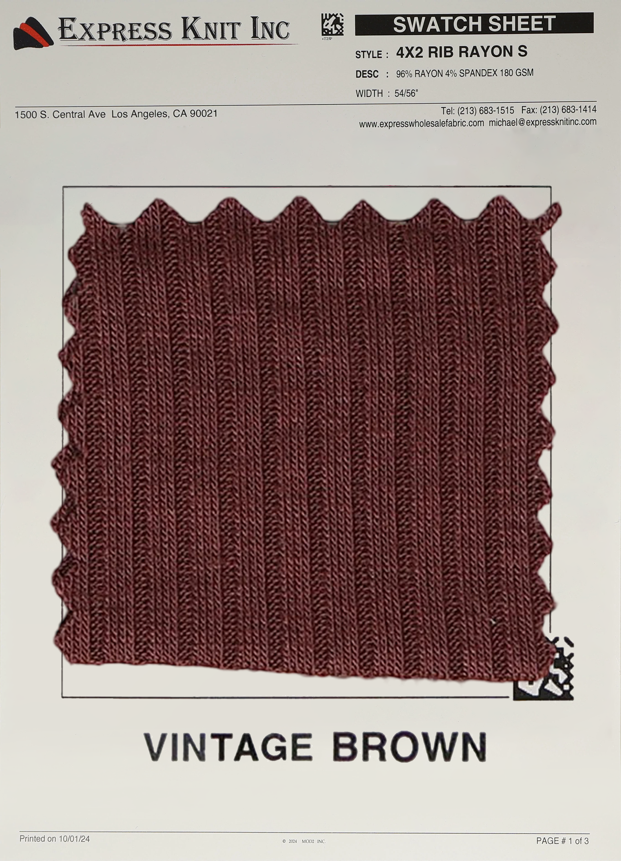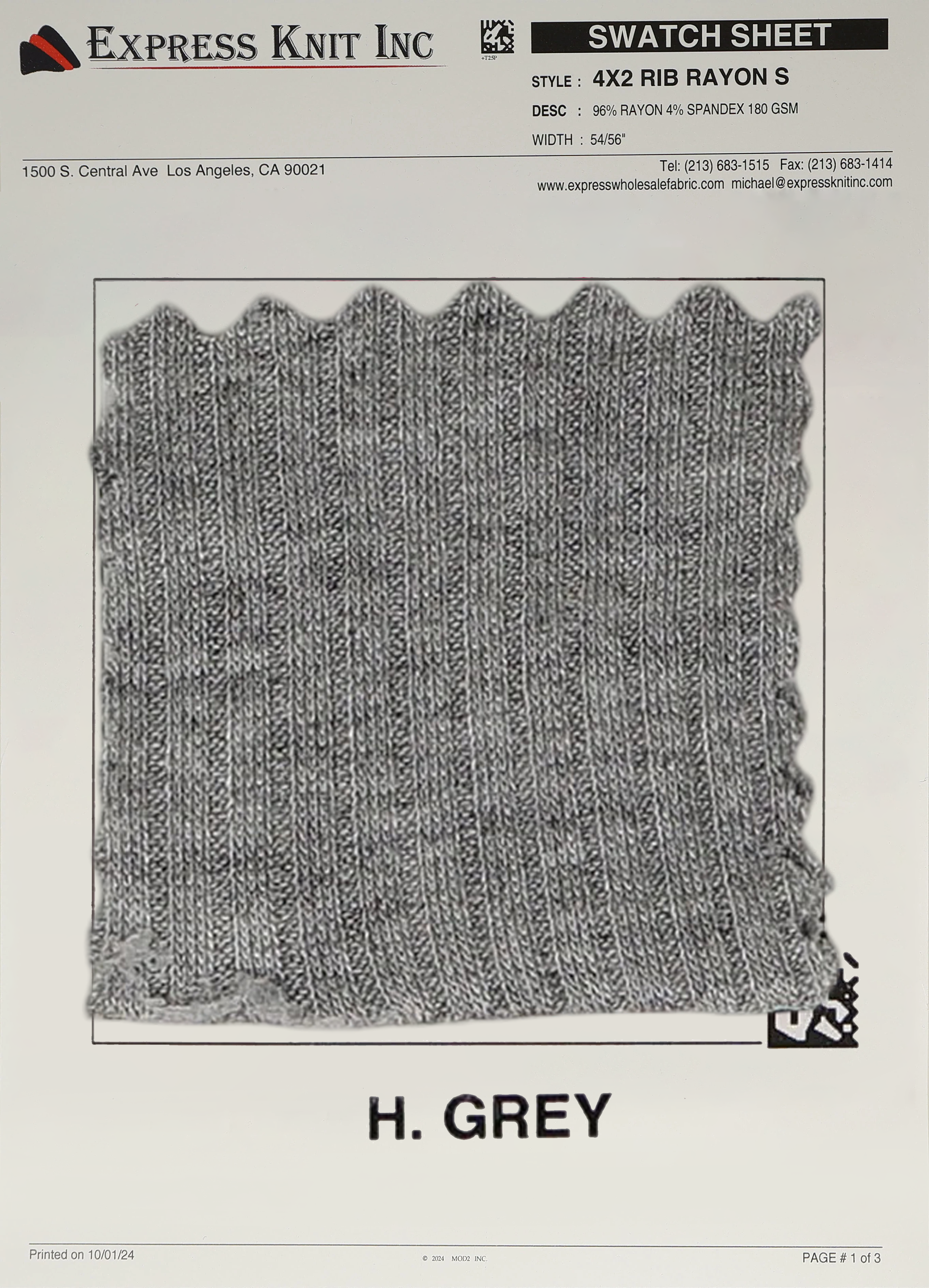 Elevate your inventory with our 4x2 Rib Rayon Spandex Knit Solid Fabric, crafted for luxurious softness, stretch, and style. With 96% Rayon and 4% Spandex, this fabric provides a lightweight, breathable feel at 180 GSM, ideal for creating comfortable and versatile garments. Its 4x2 rib texture adds depth and detail, while the 54-56 inch width makes it perfect for bulk orders and larger projects.