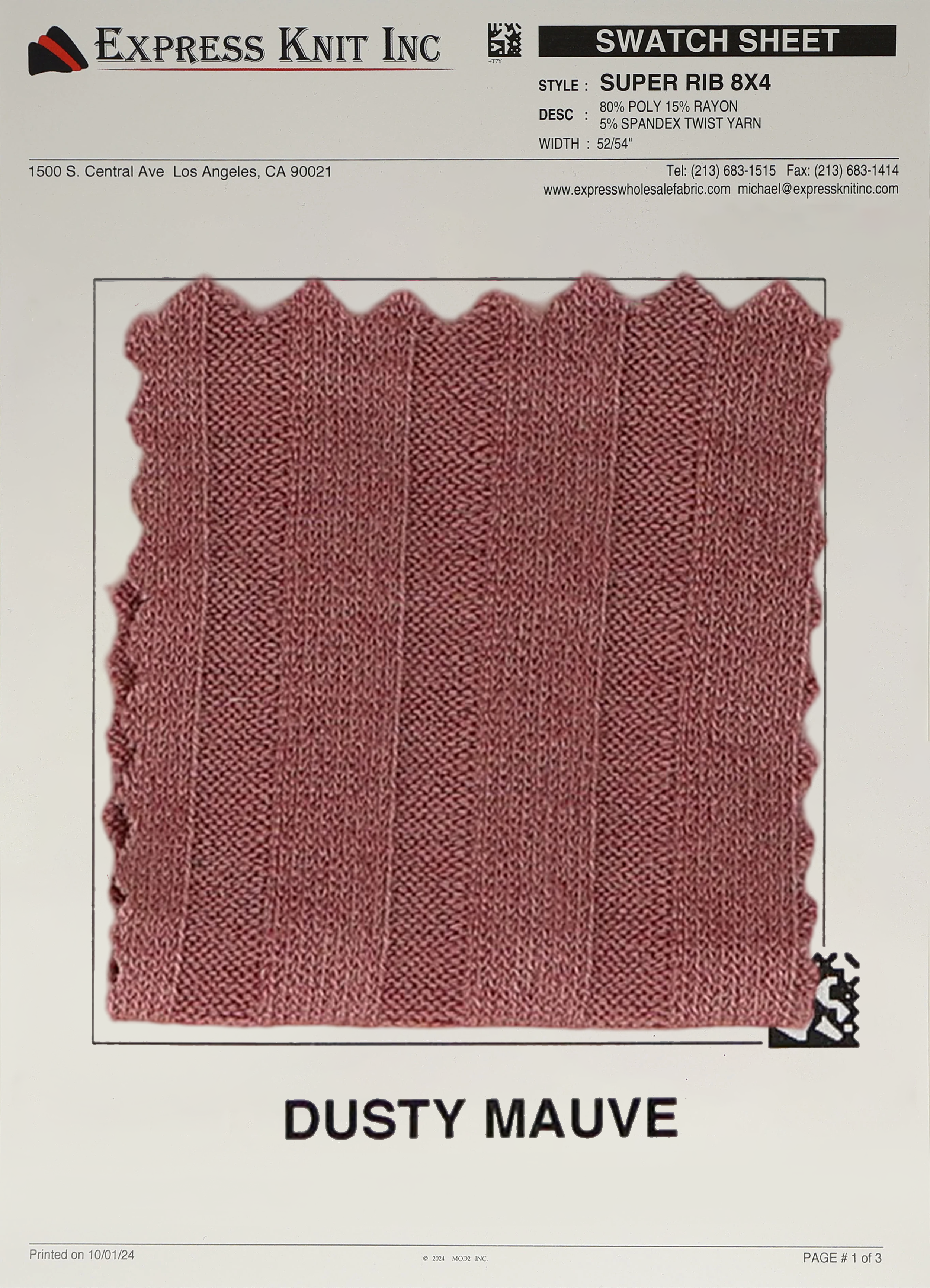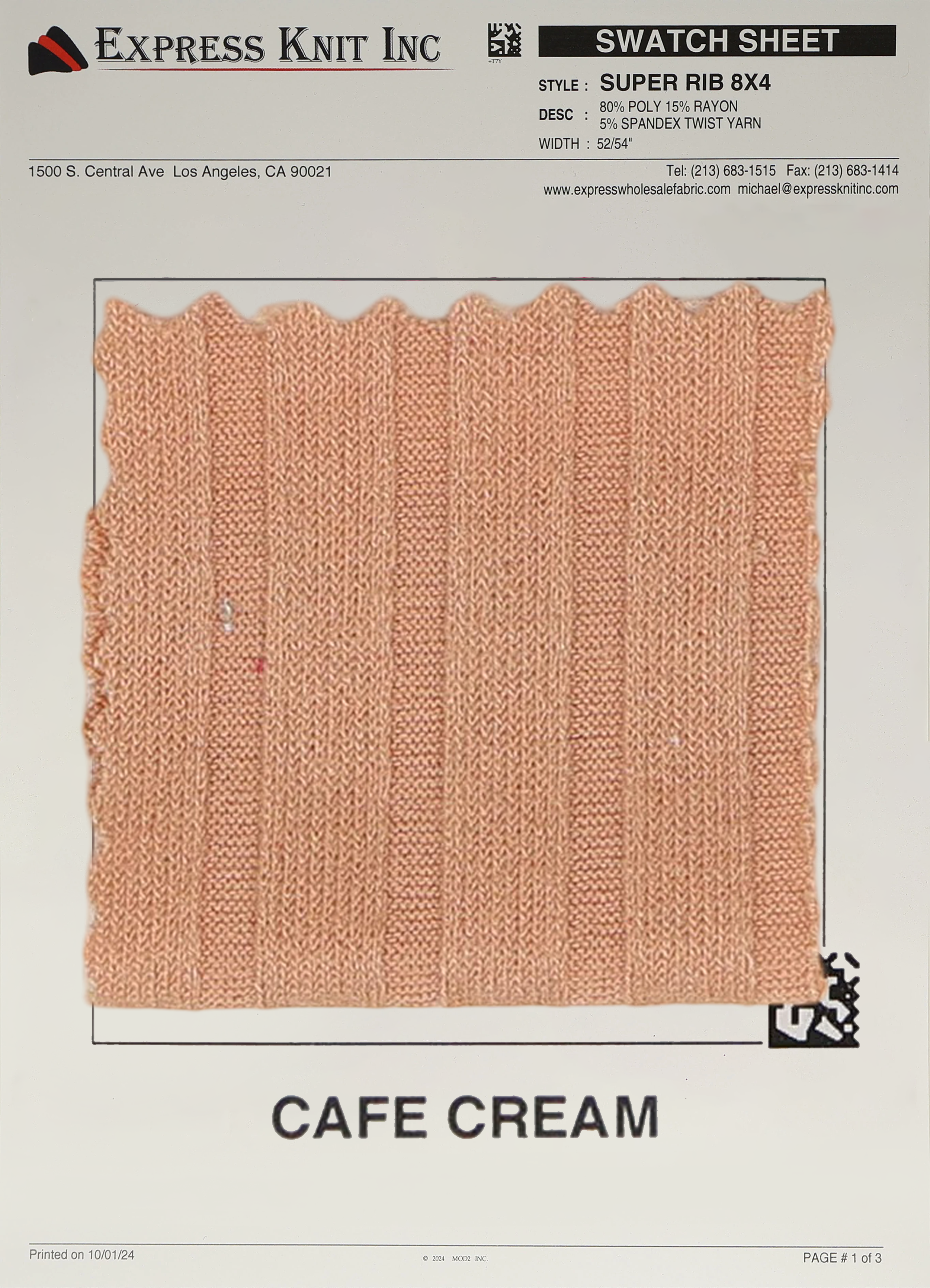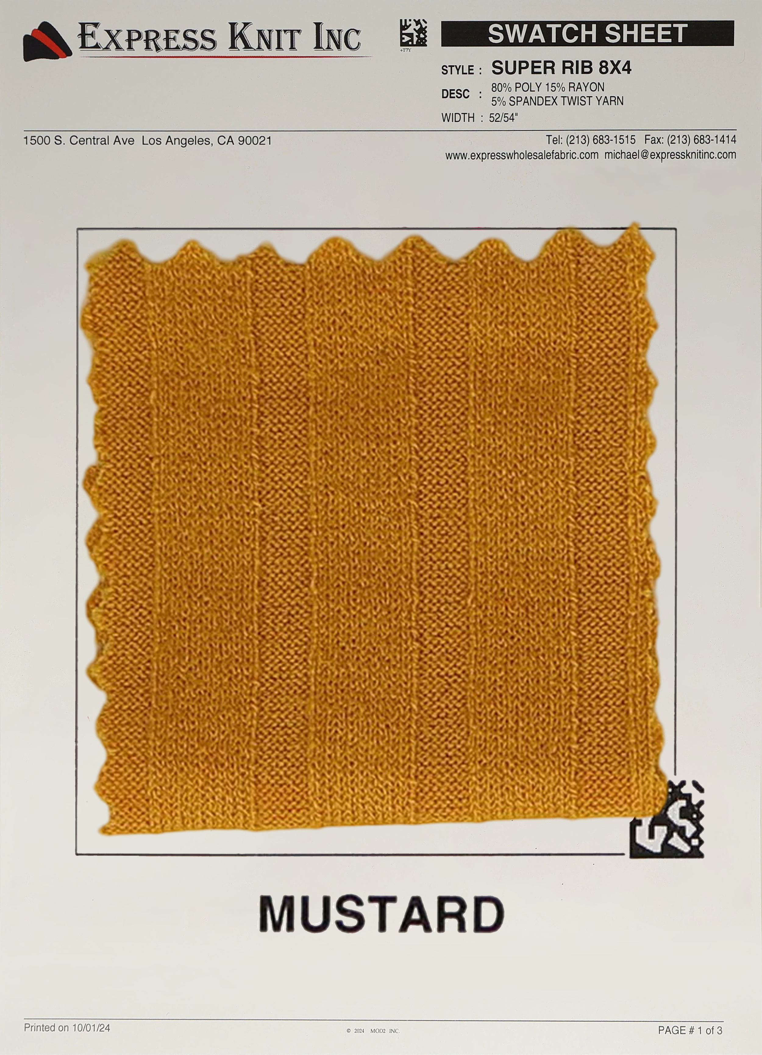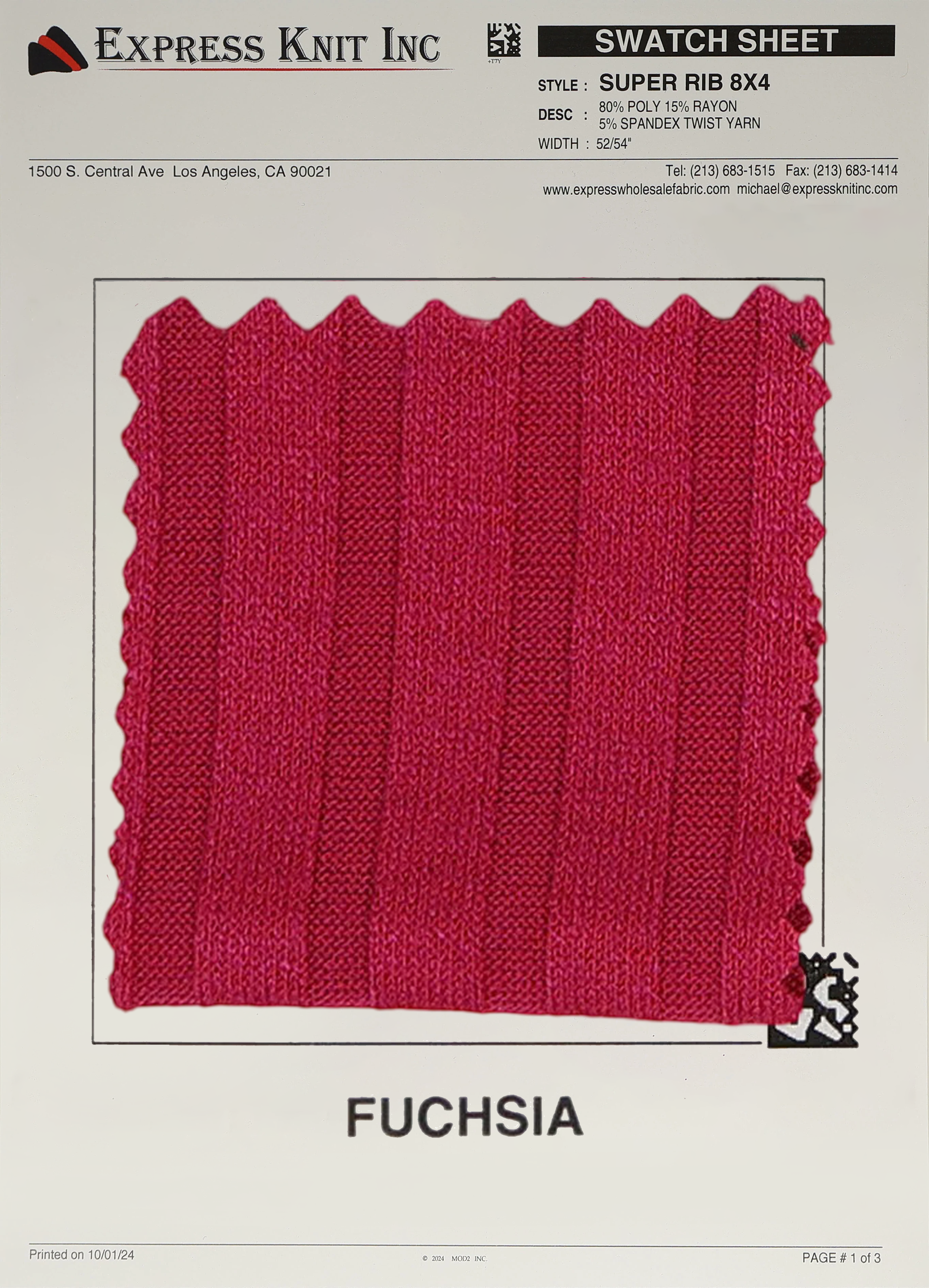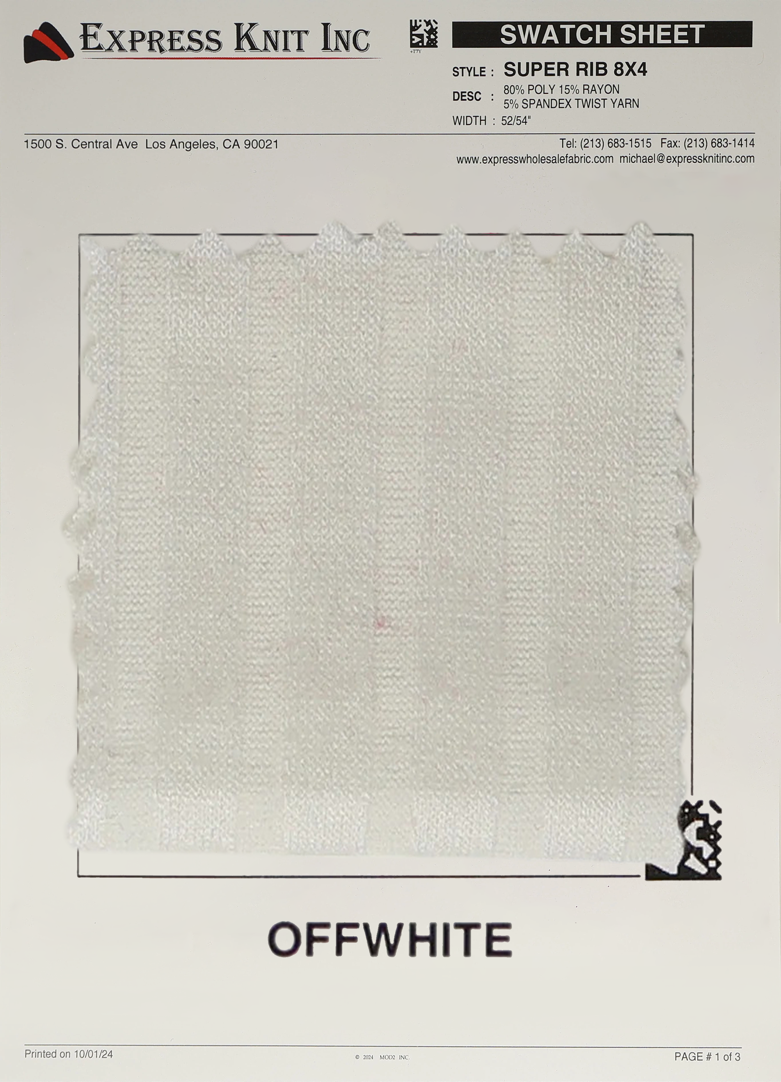 Elevate your designs with our Super Rib 8x4 Knit Fabric, crafted from 80% Polyester, 15% Rayon, and 5% Spandex Twist Yarn. With a 240 GSM weight, it offers structure and flexibility, while the 8x4 rib pattern adds a modern, textured finish. The 52-54 inch width ensures efficient usage, making it perfect for bulk orders.