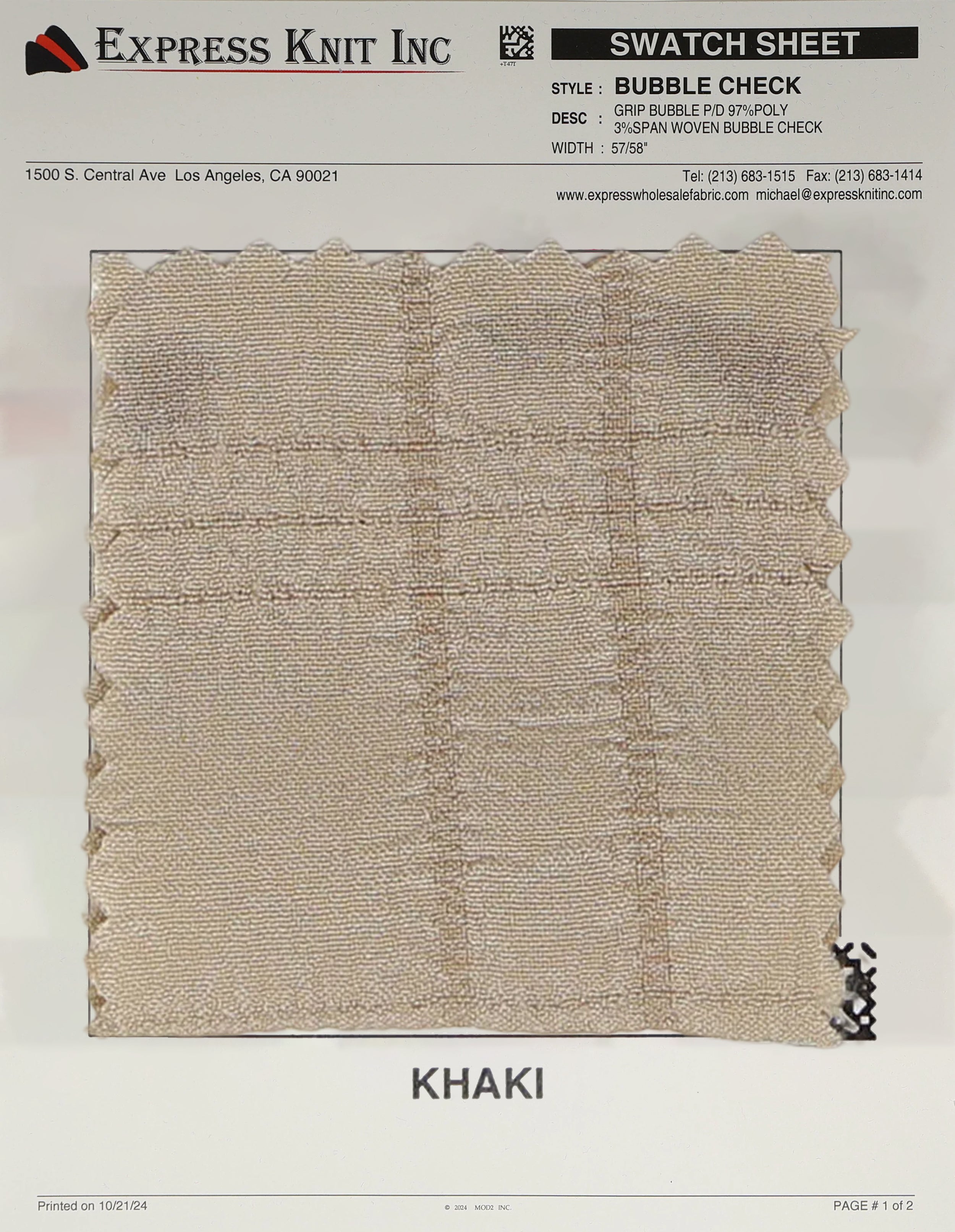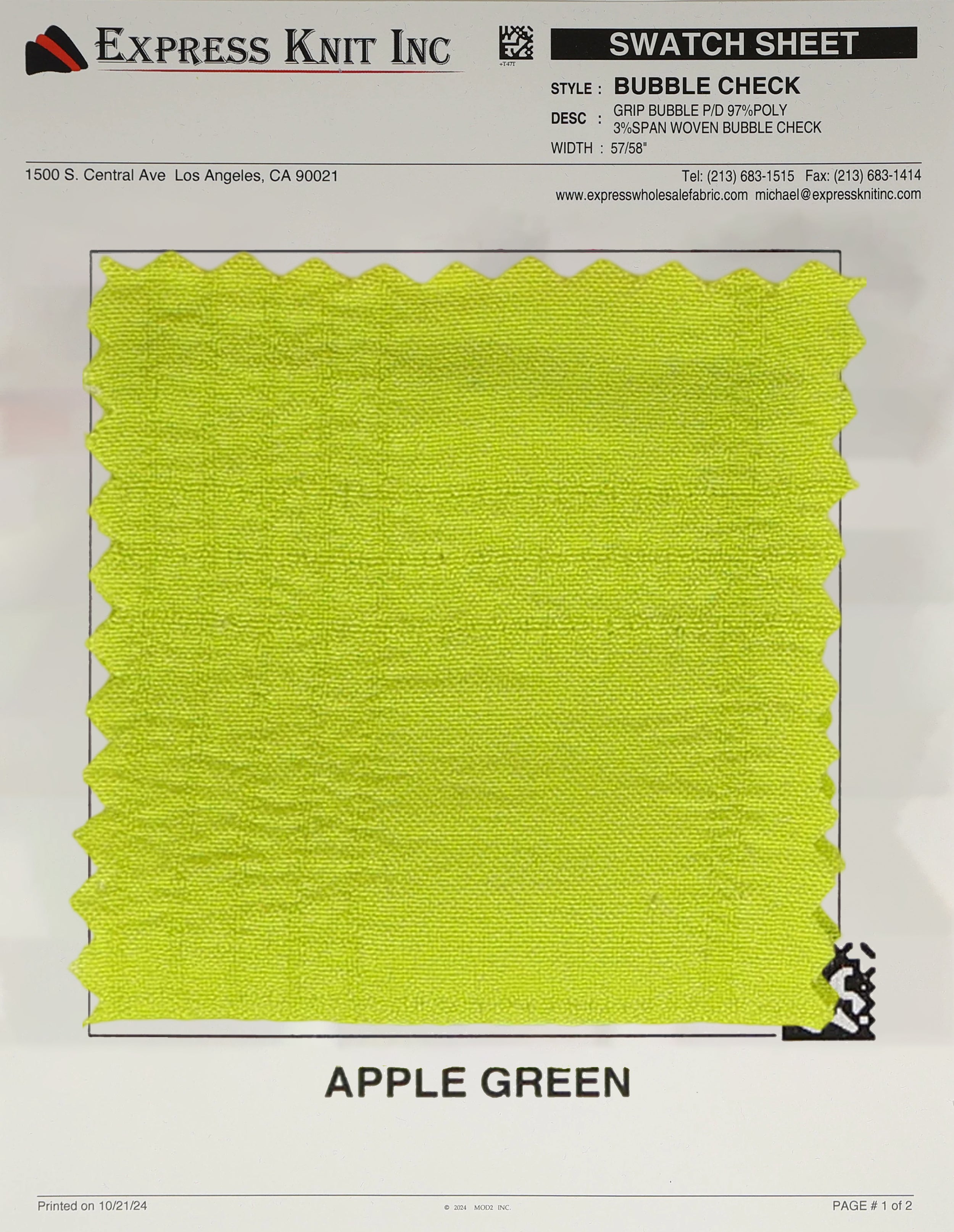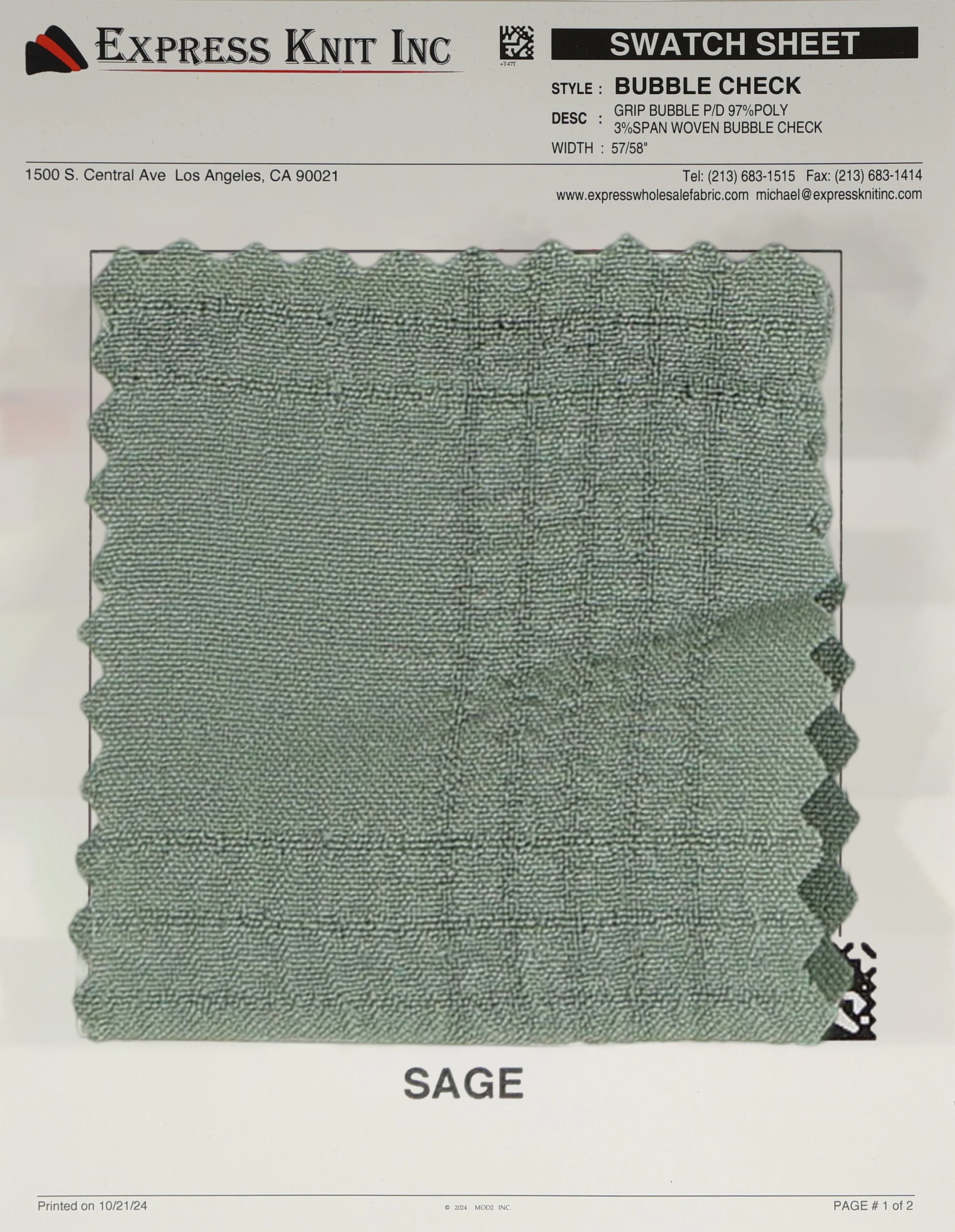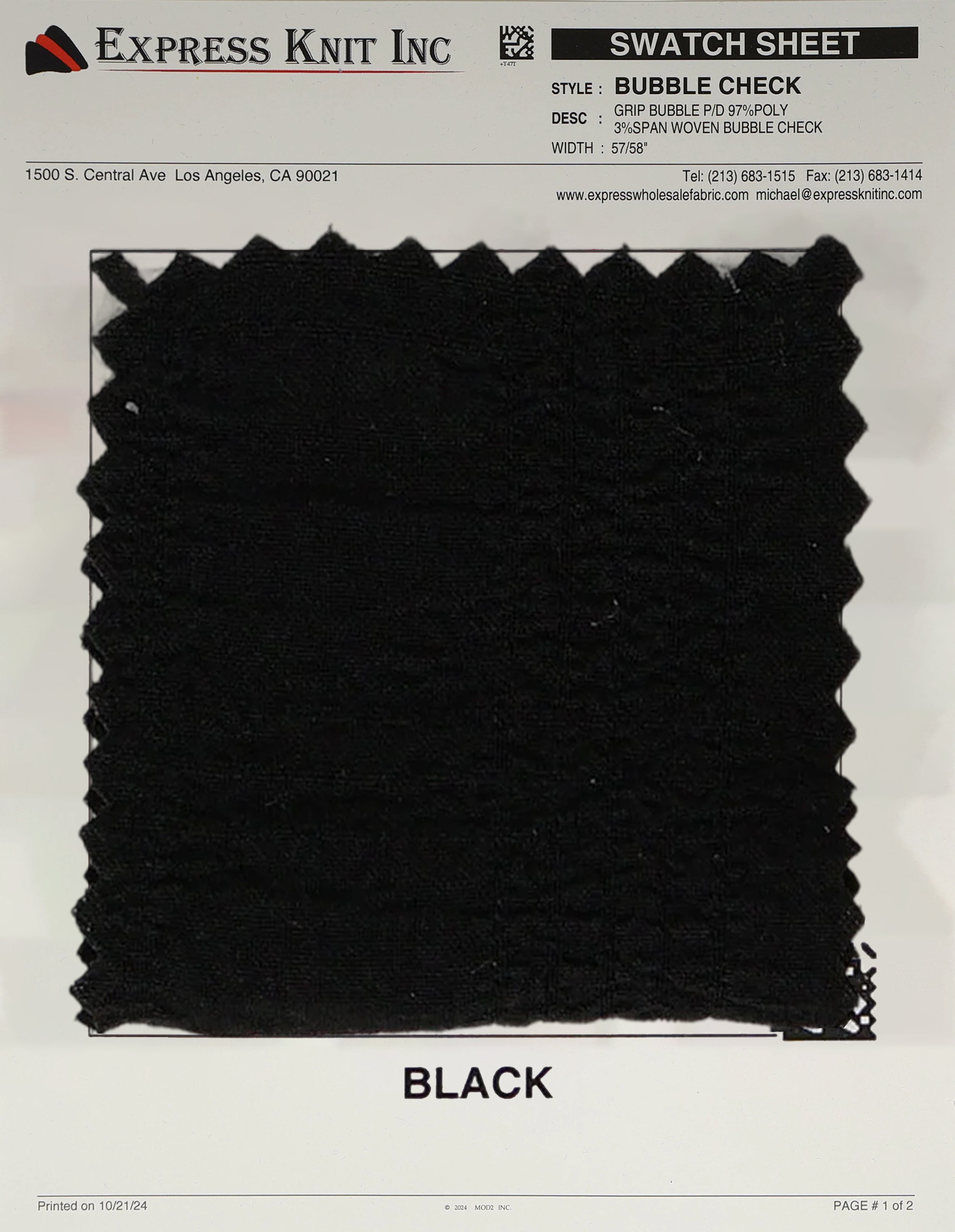 Our Bubble Check Fabric, available at wholesale pricing, combines a classic check pattern with a textured, bubble-like finish, adding a stylish twist to any design. Crafted from a durable polyester-spandex blend, this fabric offers a soft hand feel with a touch of stretch, enhancing comfort while retaining structure. With a 57-58 inch width, this fabric is efficient for bulk projects, making it an excellent choice for designers and brands looking for quality and style in a woven fabric.