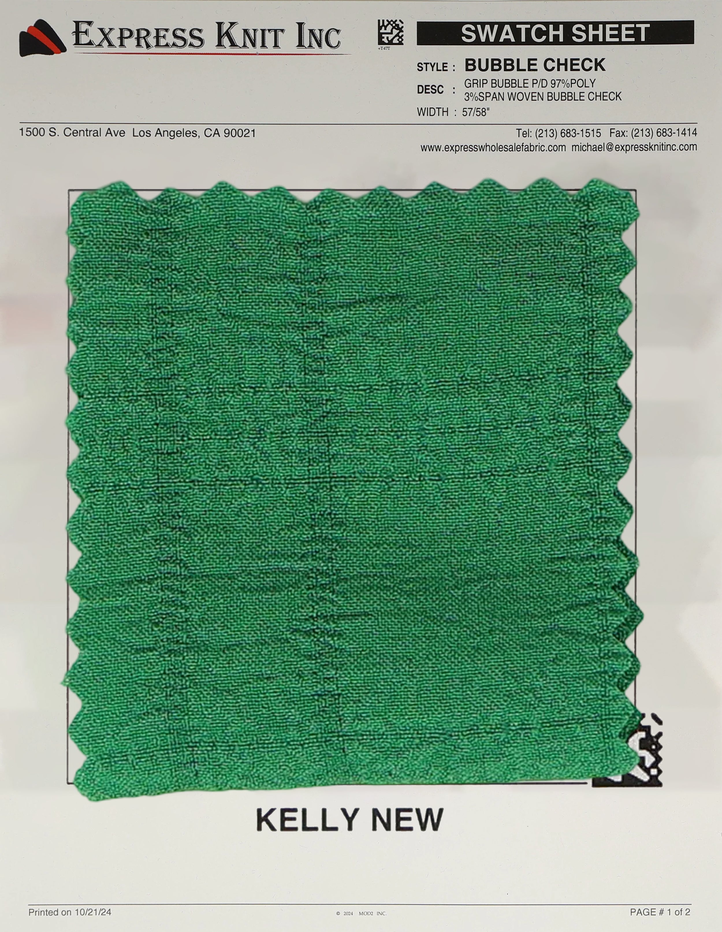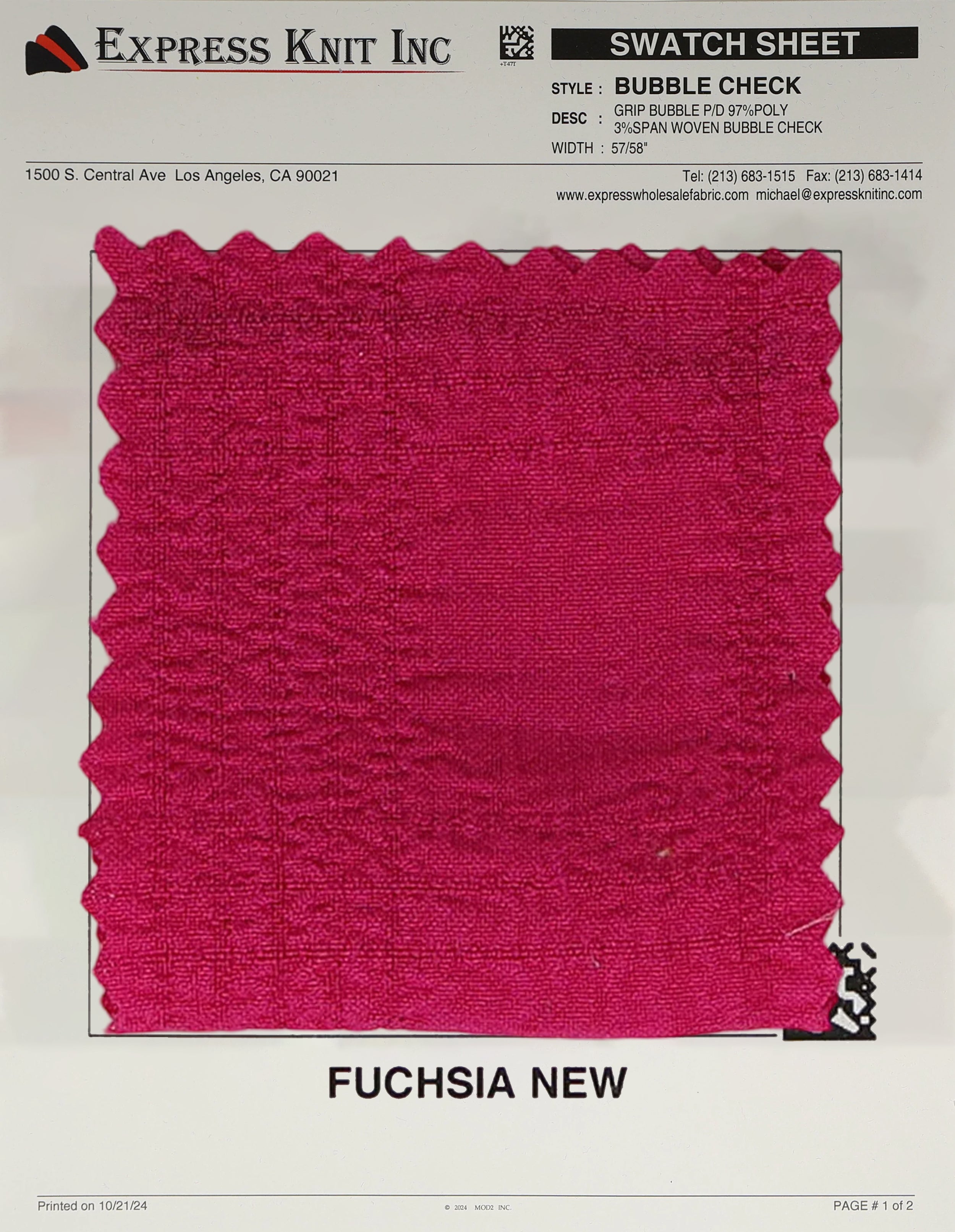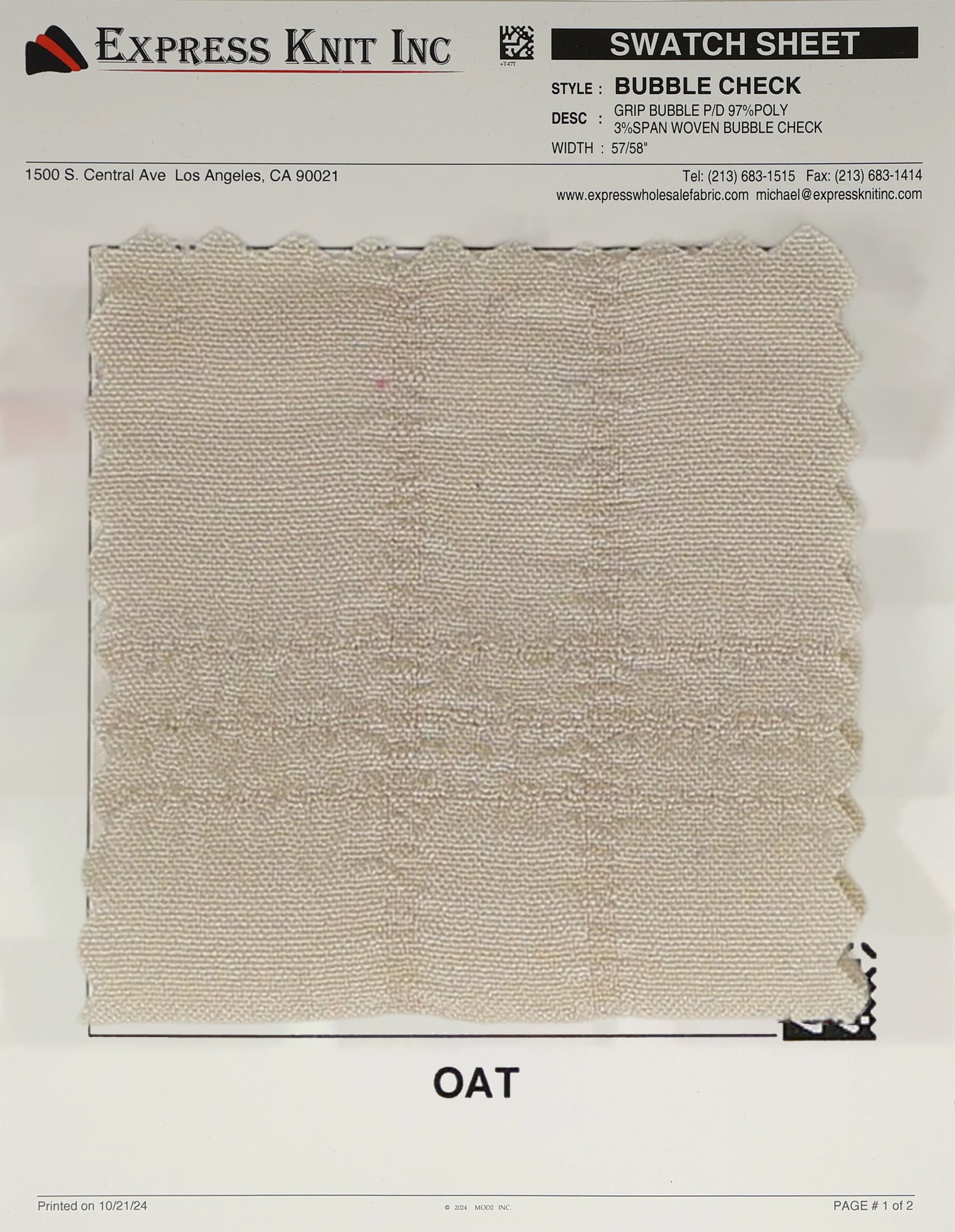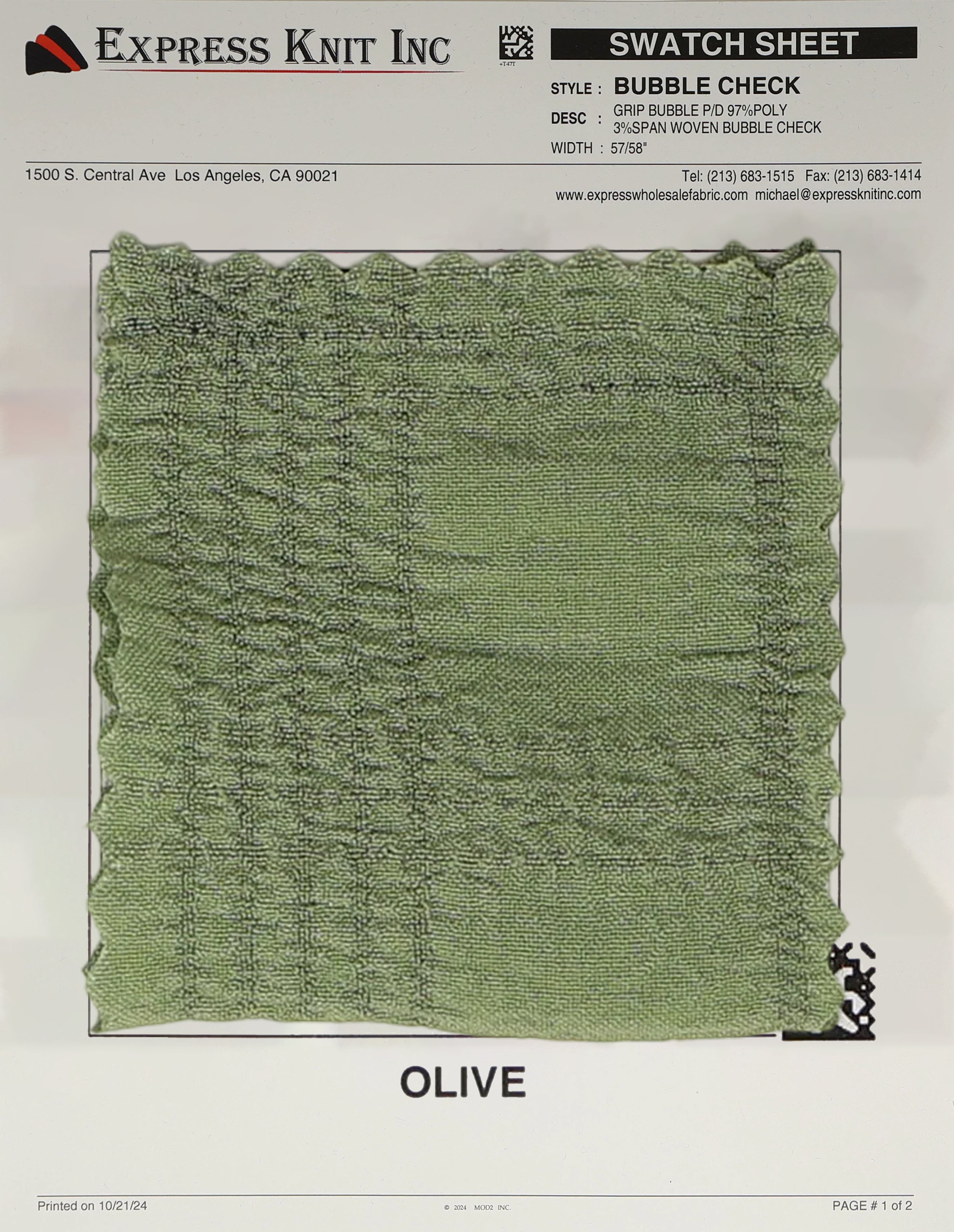 Our Bubble Check Fabric, available at wholesale pricing, combines a classic check pattern with a textured, bubble-like finish, adding a stylish twist to any design. Crafted from a durable polyester-spandex blend, this fabric offers a soft hand feel with a touch of stretch, enhancing comfort while retaining structure. With a 57-58 inch width, this fabric is efficient for bulk projects, making it an excellent choice for designers and brands looking for quality and style in a woven fabric.