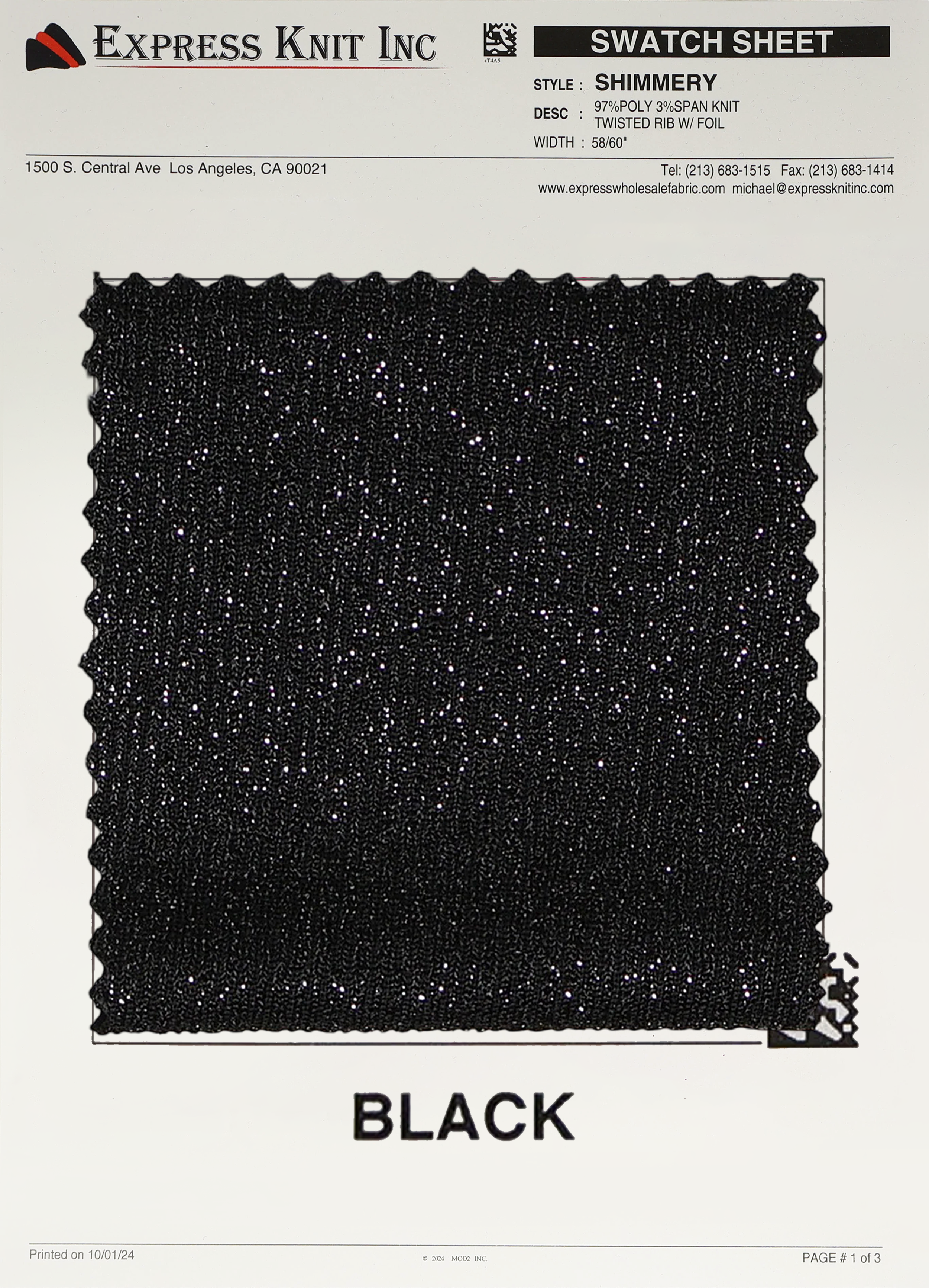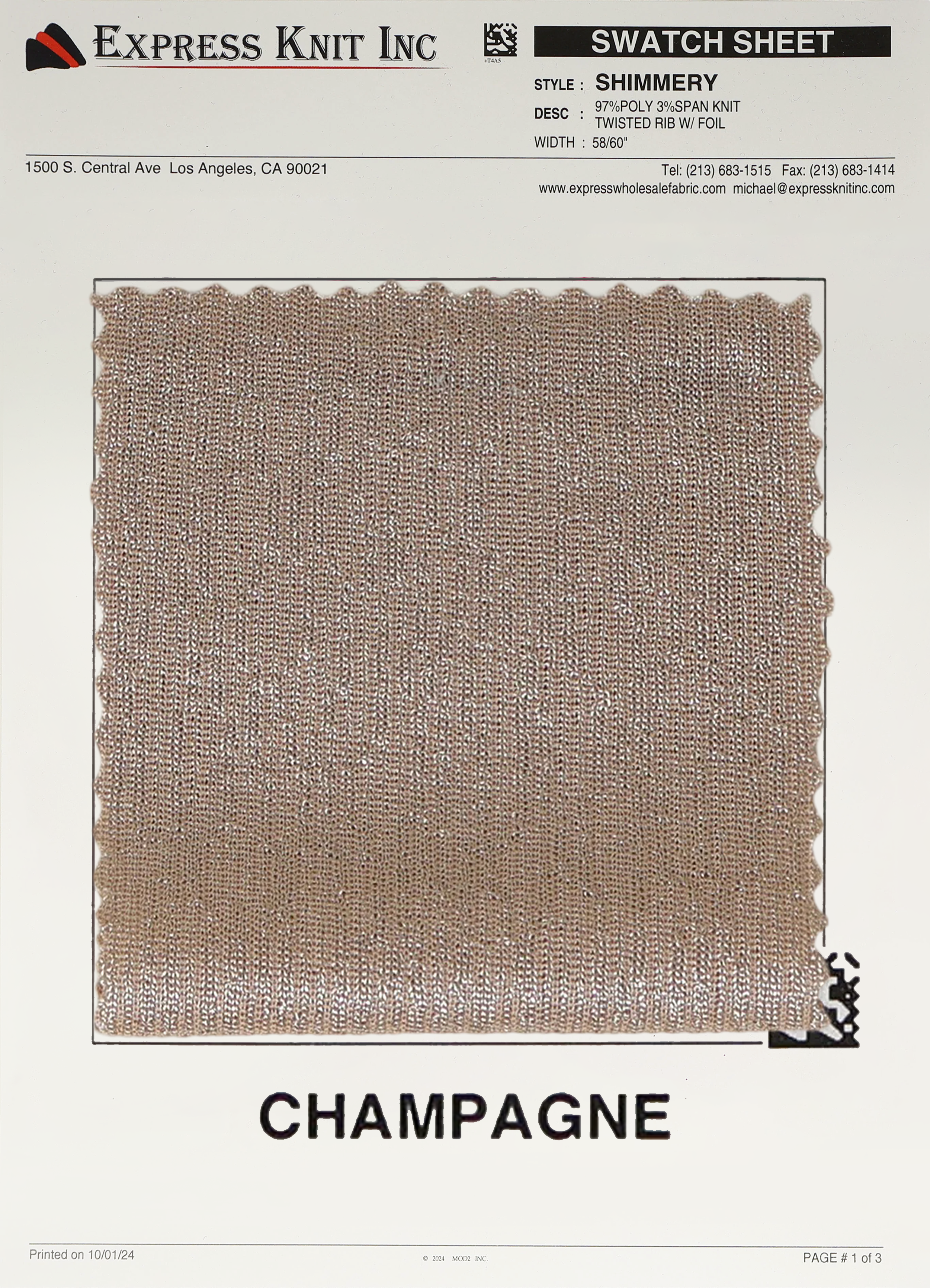 Add sparkle and sophistication to your collection with our Shimmery Fabric. This stunning fabric is crafted from a blend of 97% polyester and 3% spandex, featuring a unique twisted ribbed knit with a foil finish that creates a shimmering effect across the surface. The foil overlay adds a dazzling shine, making it perfect for glamorous designs and statement pieces. With a versatile width of 58/60 inches, this fabric is ideal for fashion-forward garments that require a touch of sparkle.