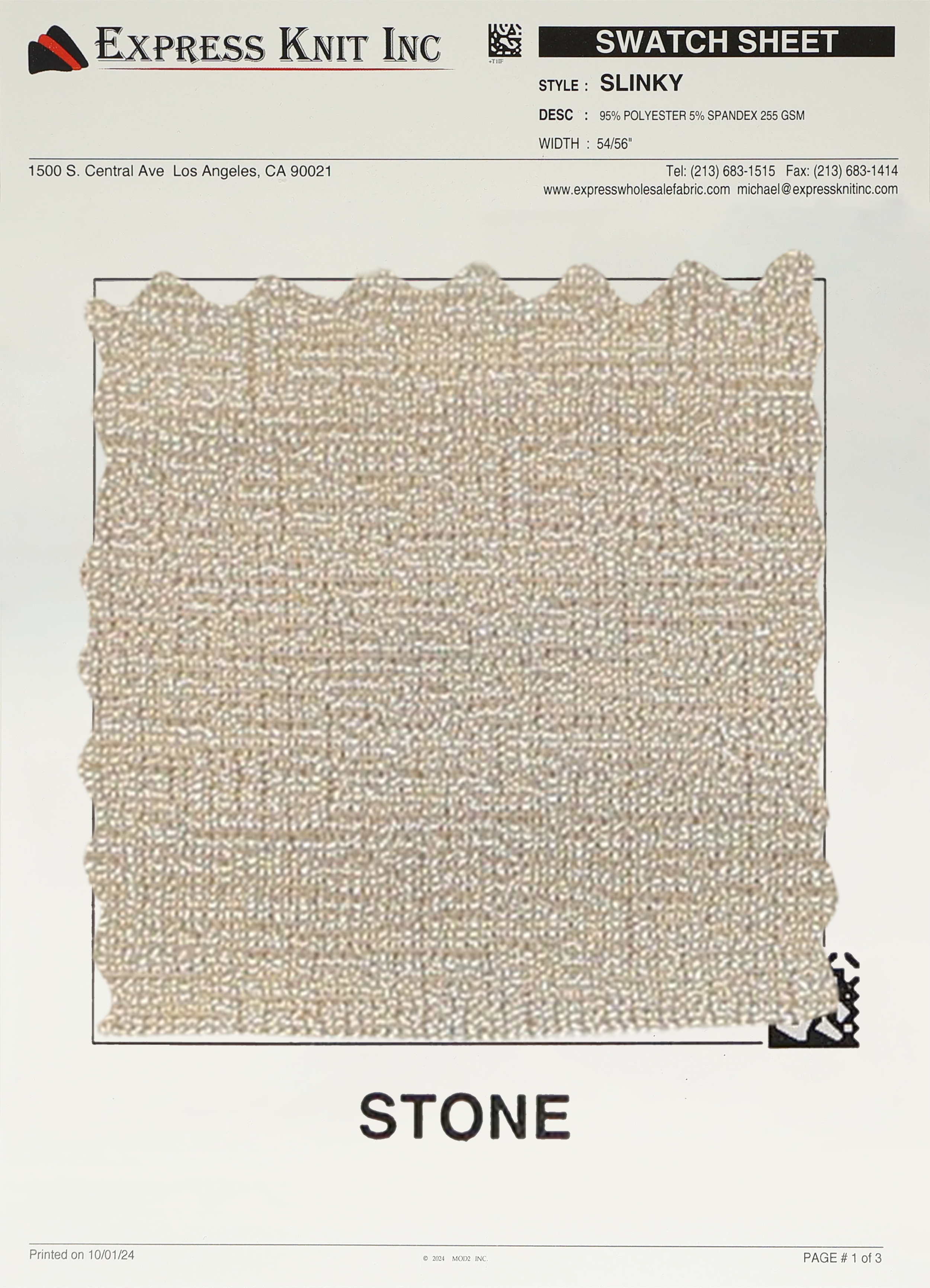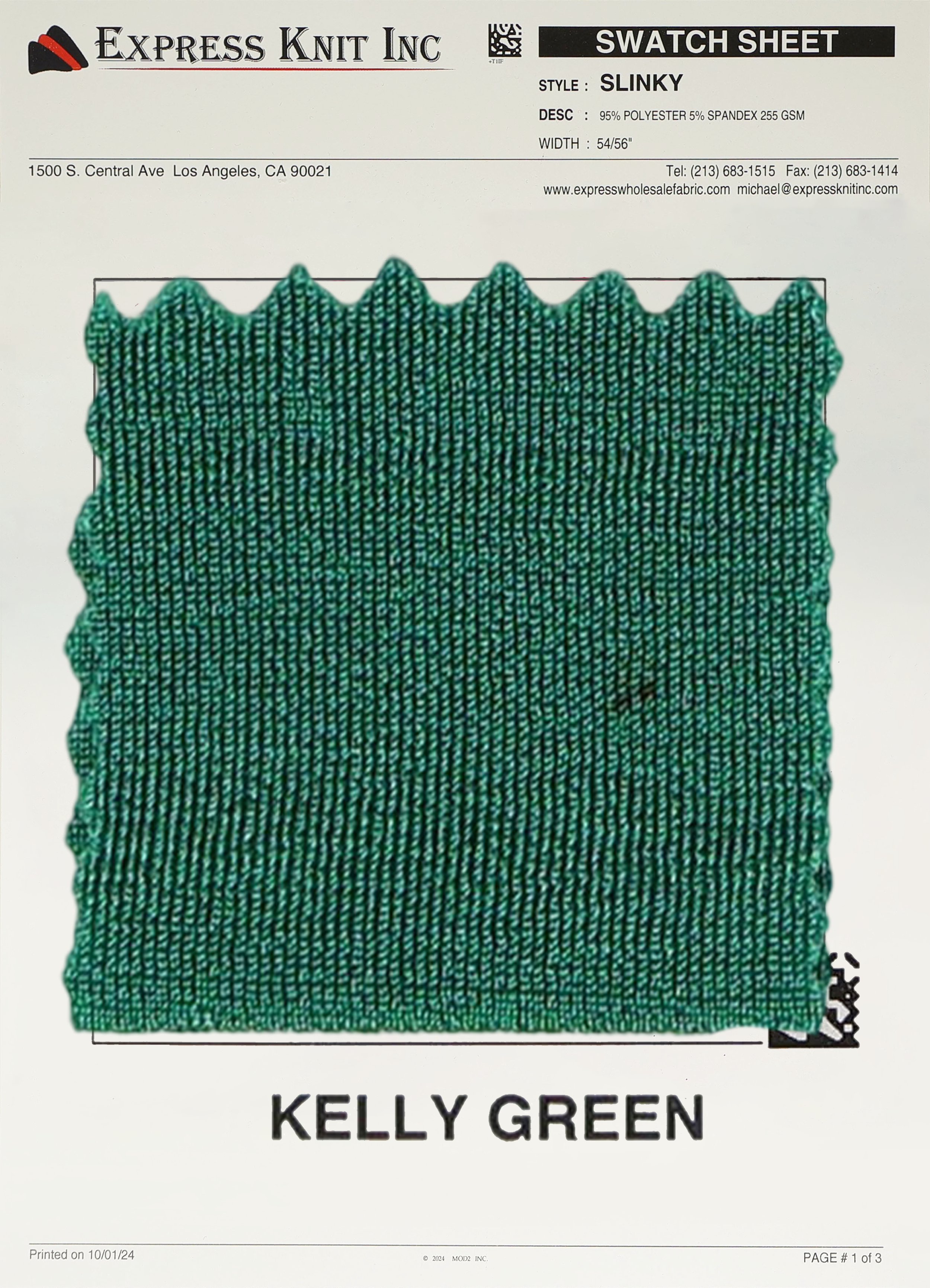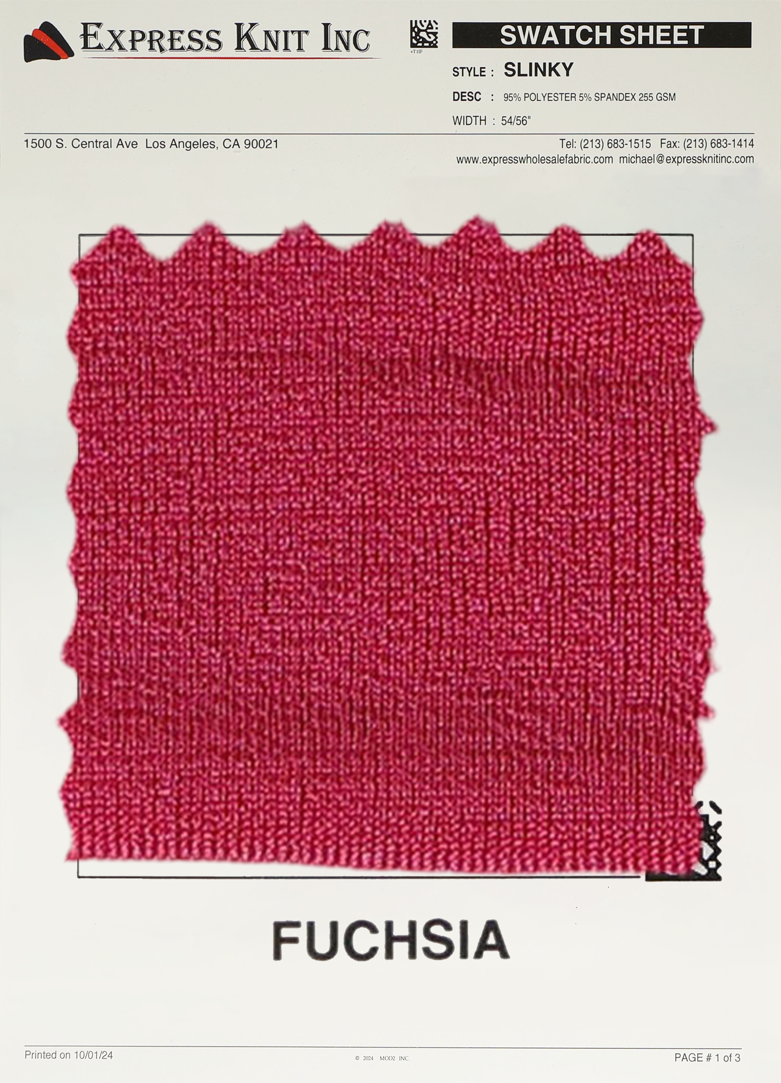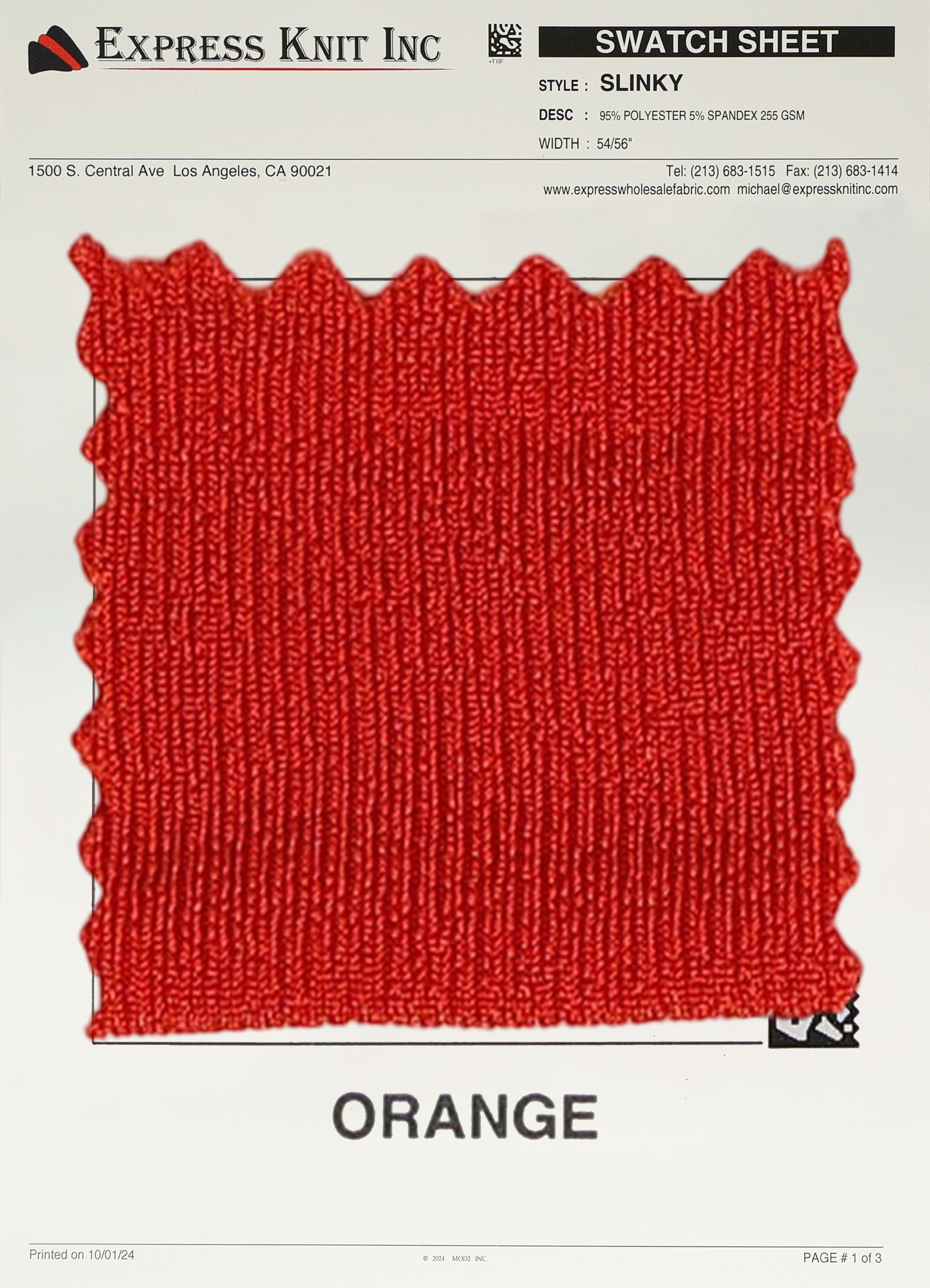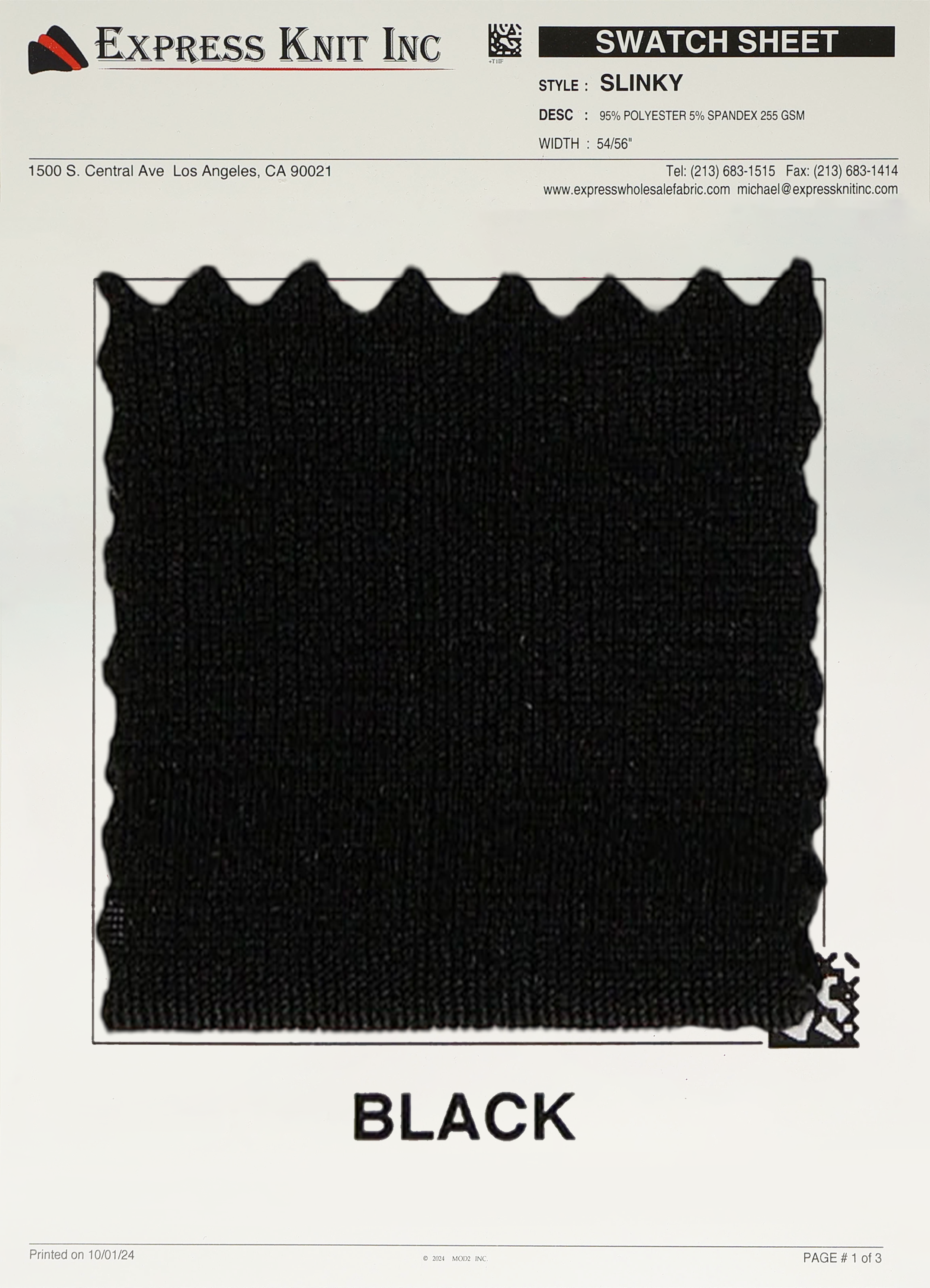 Our Slinky Fabric, available at wholesale pricing, offers an ultra-smooth, flowing texture with a luxurious drape that elegantly skims the body. Made from a durable polyester-spandex blend, this fabric features a 2-way stretch, providing comfortable flexibility while retaining shape. With a heavier weight of 255 GSM, Slinky Fabric has a substantial feel that’s perfect for creating garments with structure, movement, and fluidity. Its 54-56 inch width makes it efficient for large-scale projects, making it a versatile choice for designers and brands.