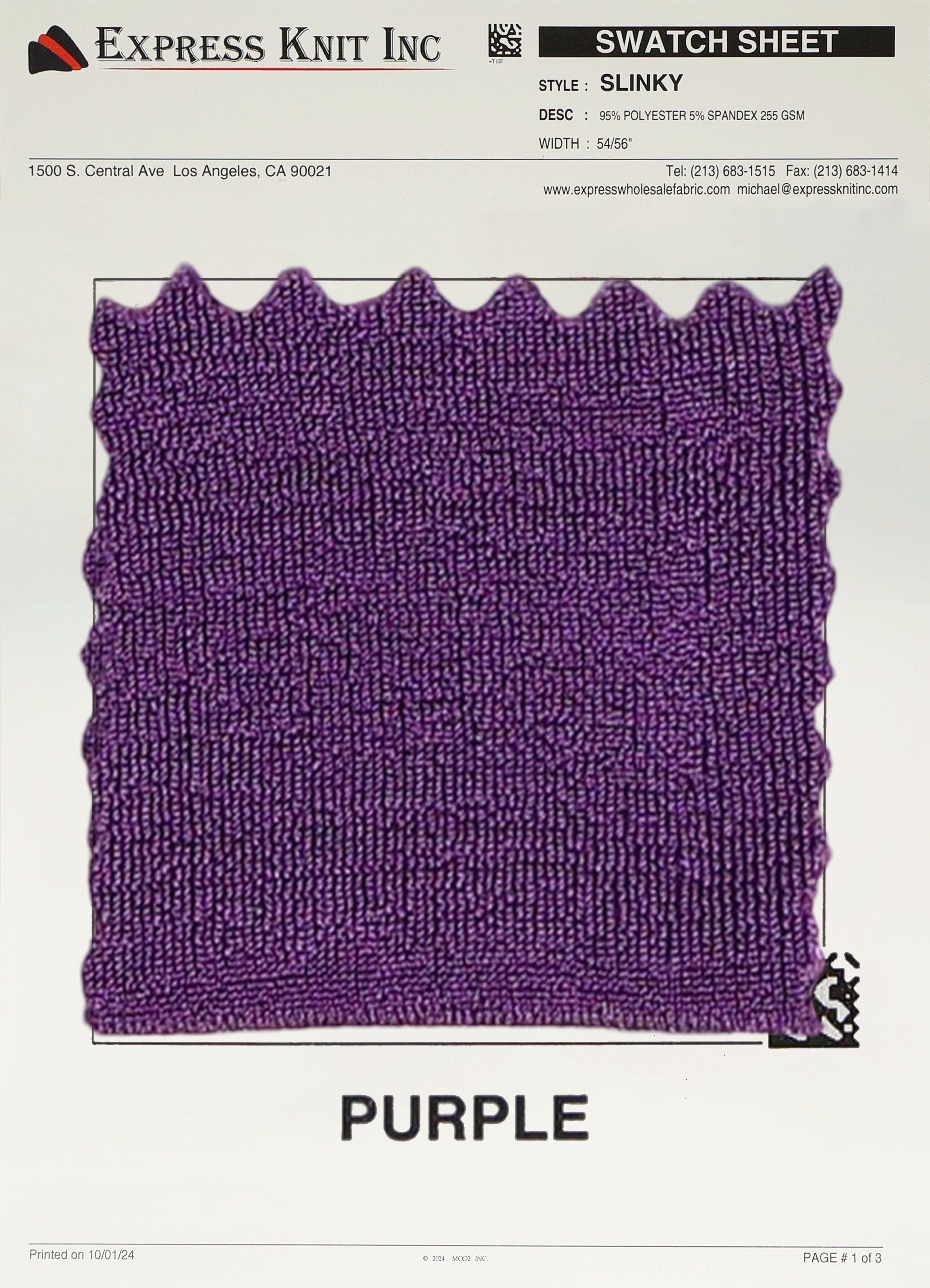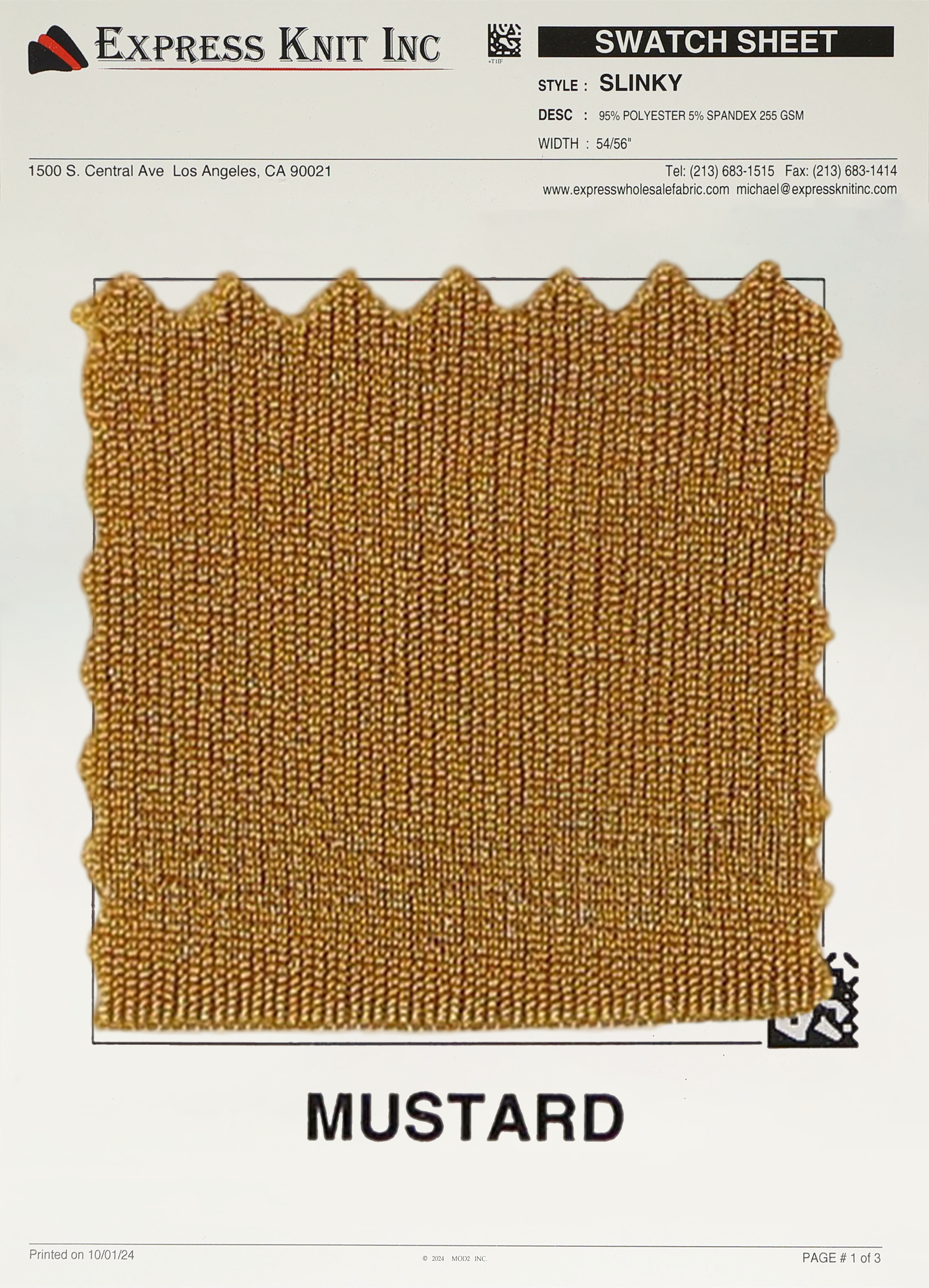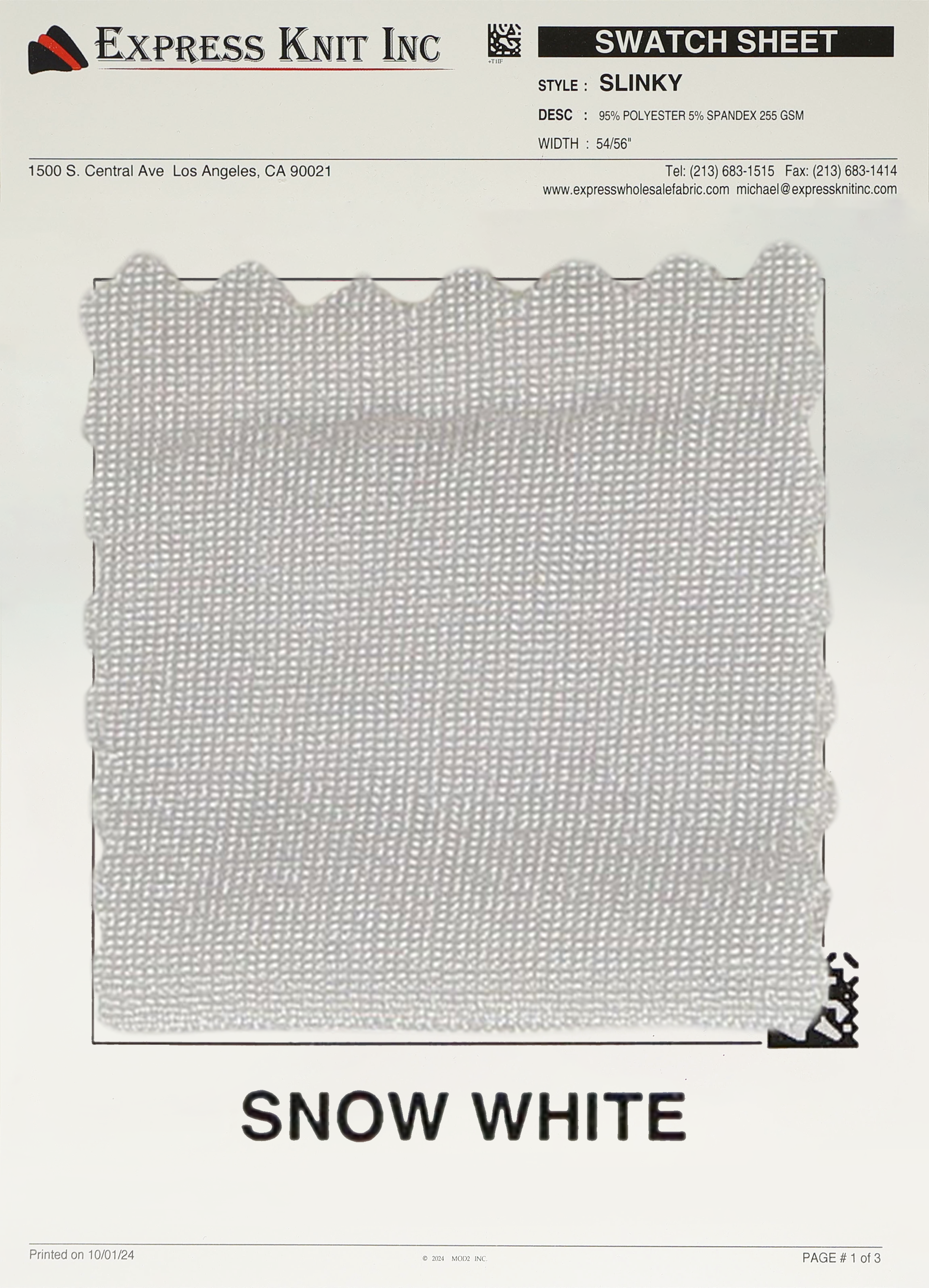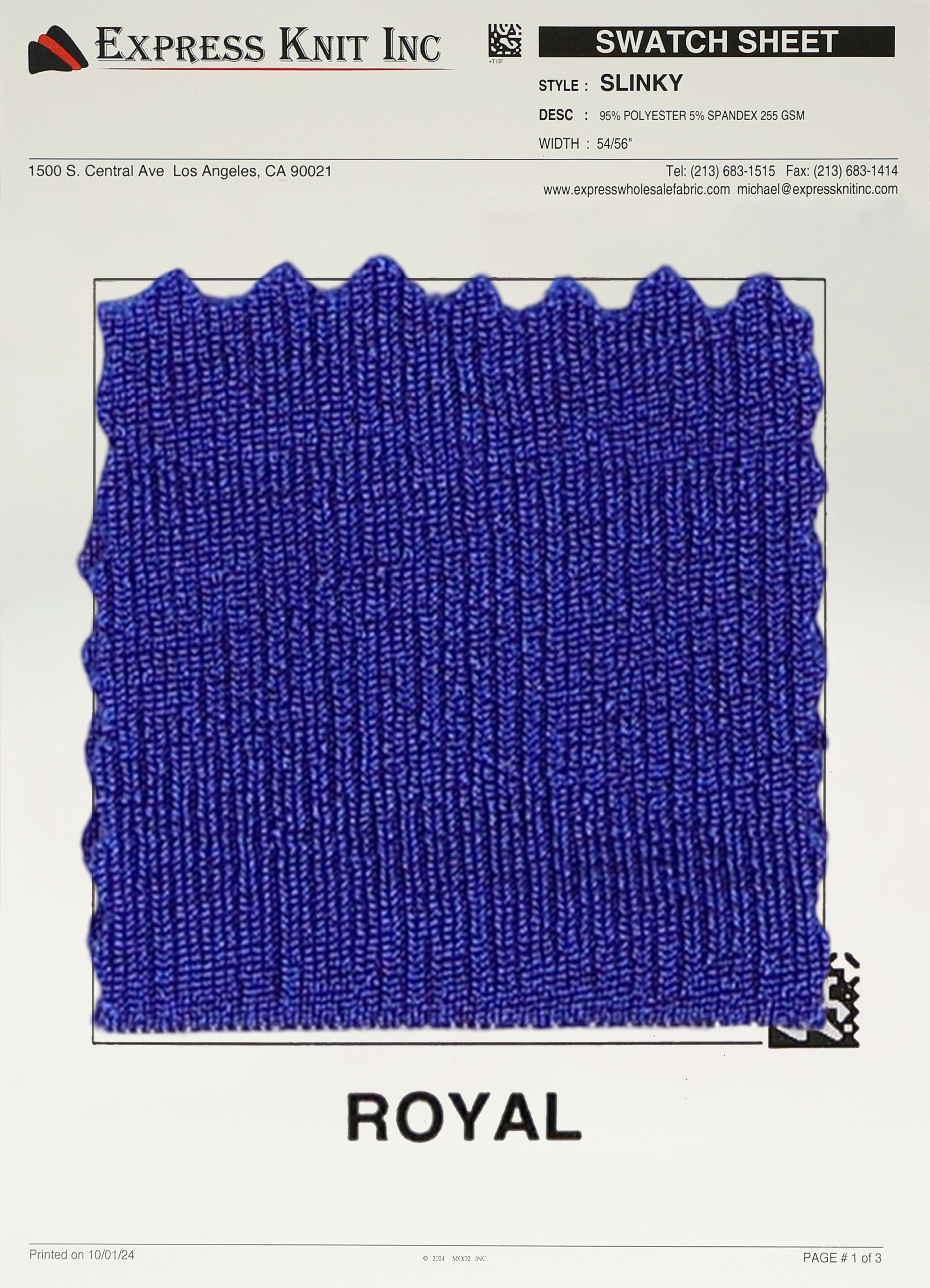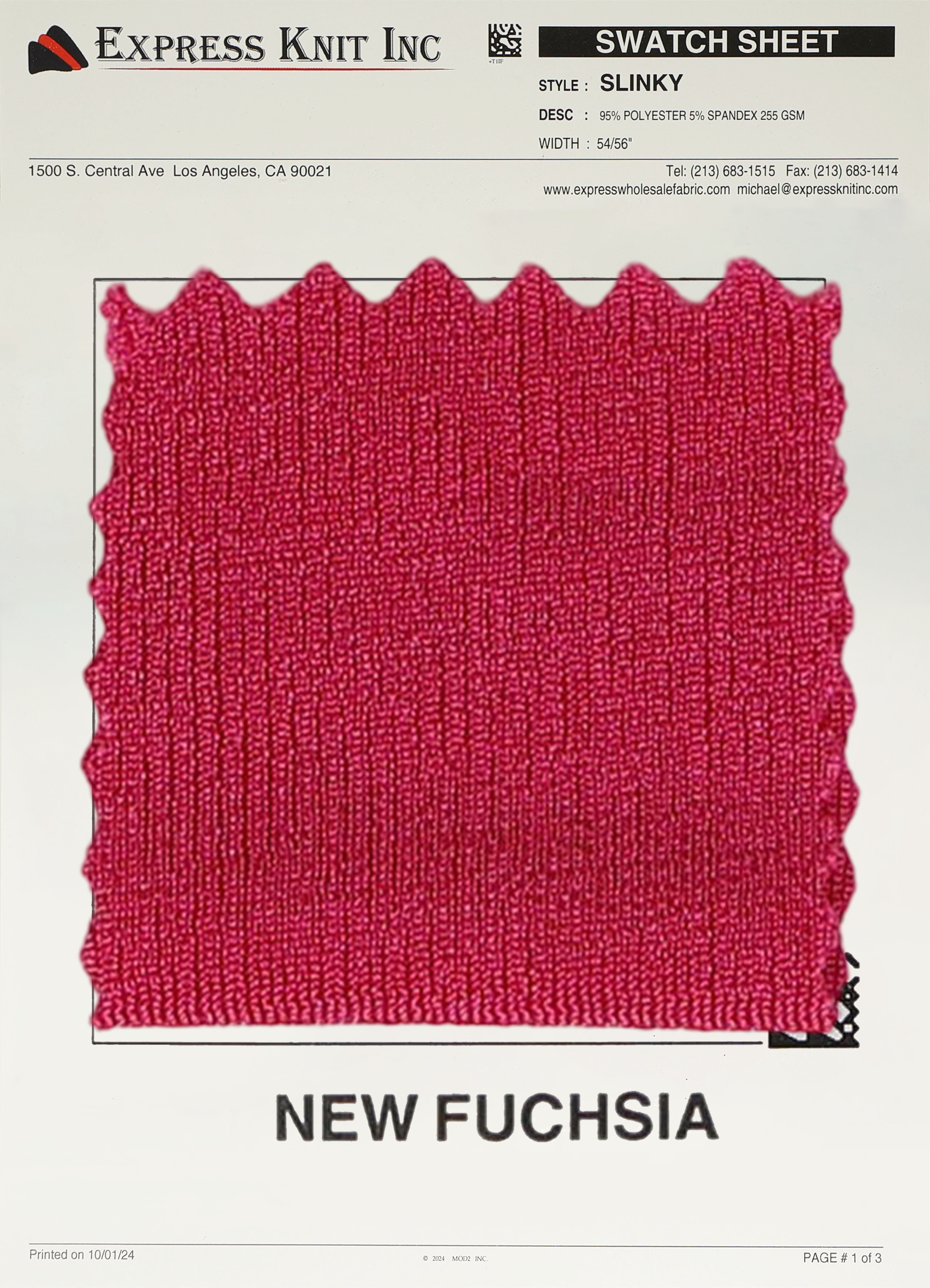 Our Slinky Fabric, available at wholesale pricing, offers an ultra-smooth, flowing texture with a luxurious drape that elegantly skims the body. Made from a durable polyester-spandex blend, this fabric features a 2-way stretch, providing comfortable flexibility while retaining shape. With a heavier weight of 255 GSM, Slinky Fabric has a substantial feel that’s perfect for creating garments with structure, movement, and fluidity. Its 54-56 inch width makes it efficient for large-scale projects, making it a versatile choice for designers and brands.