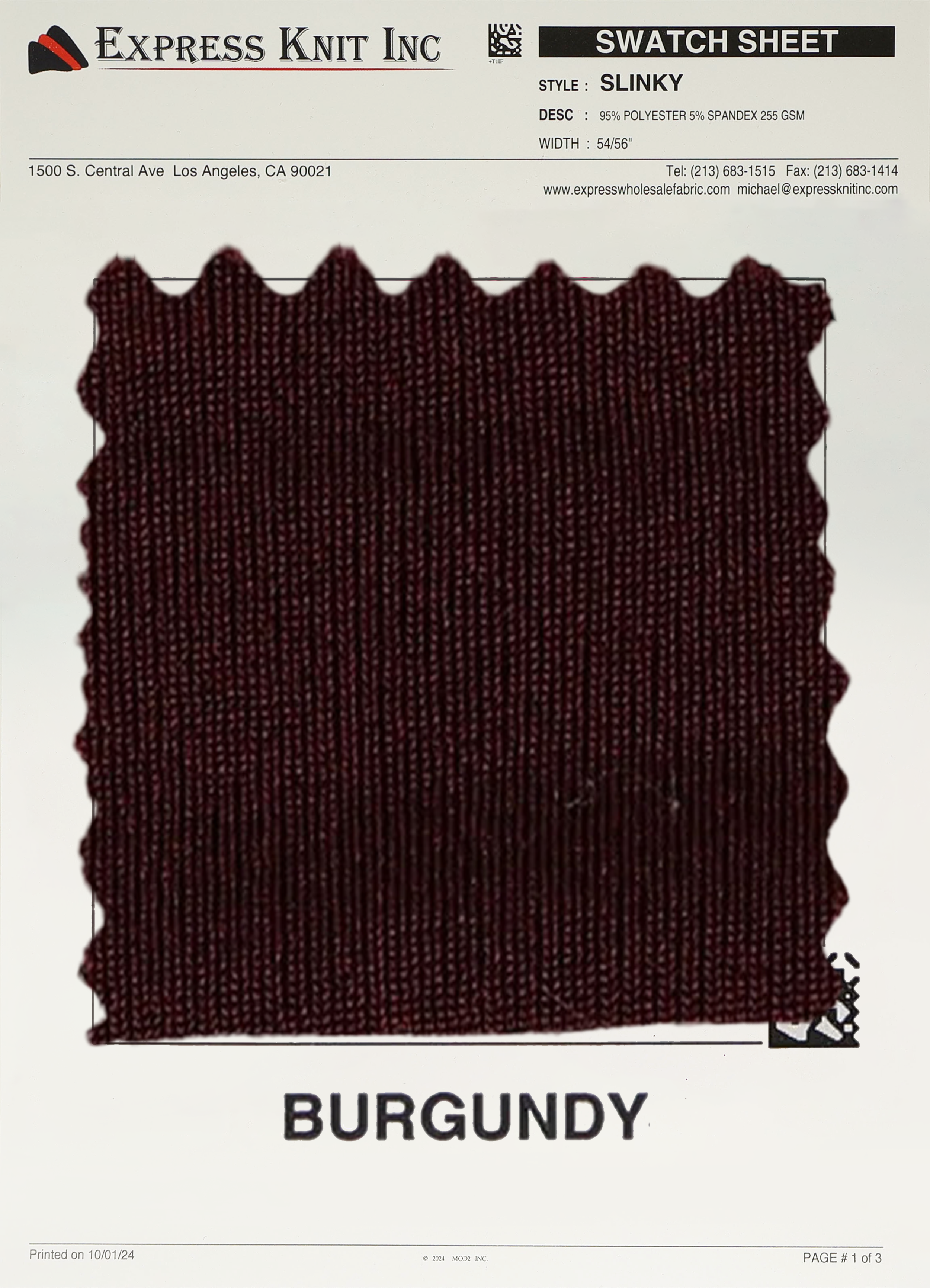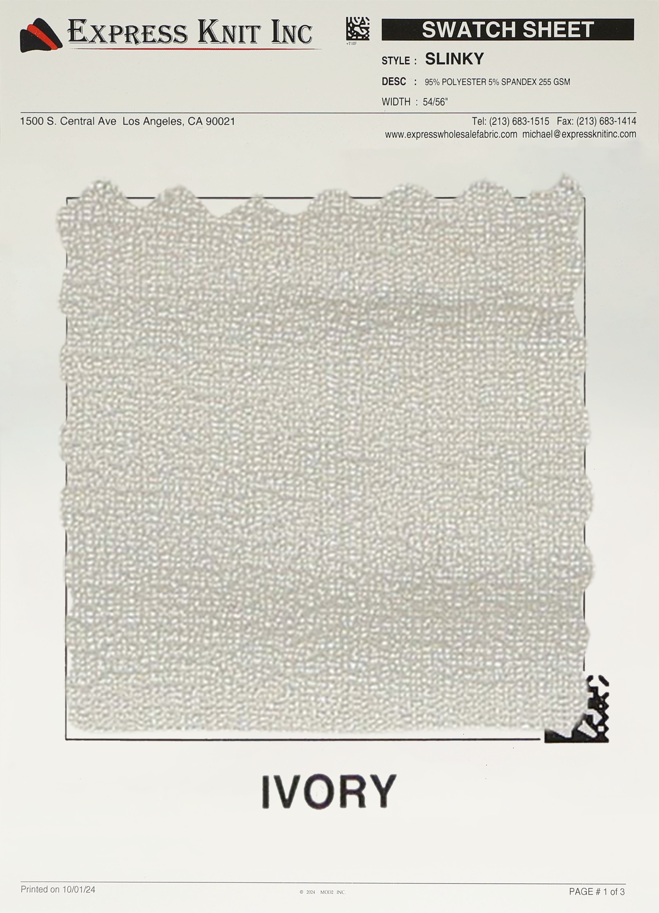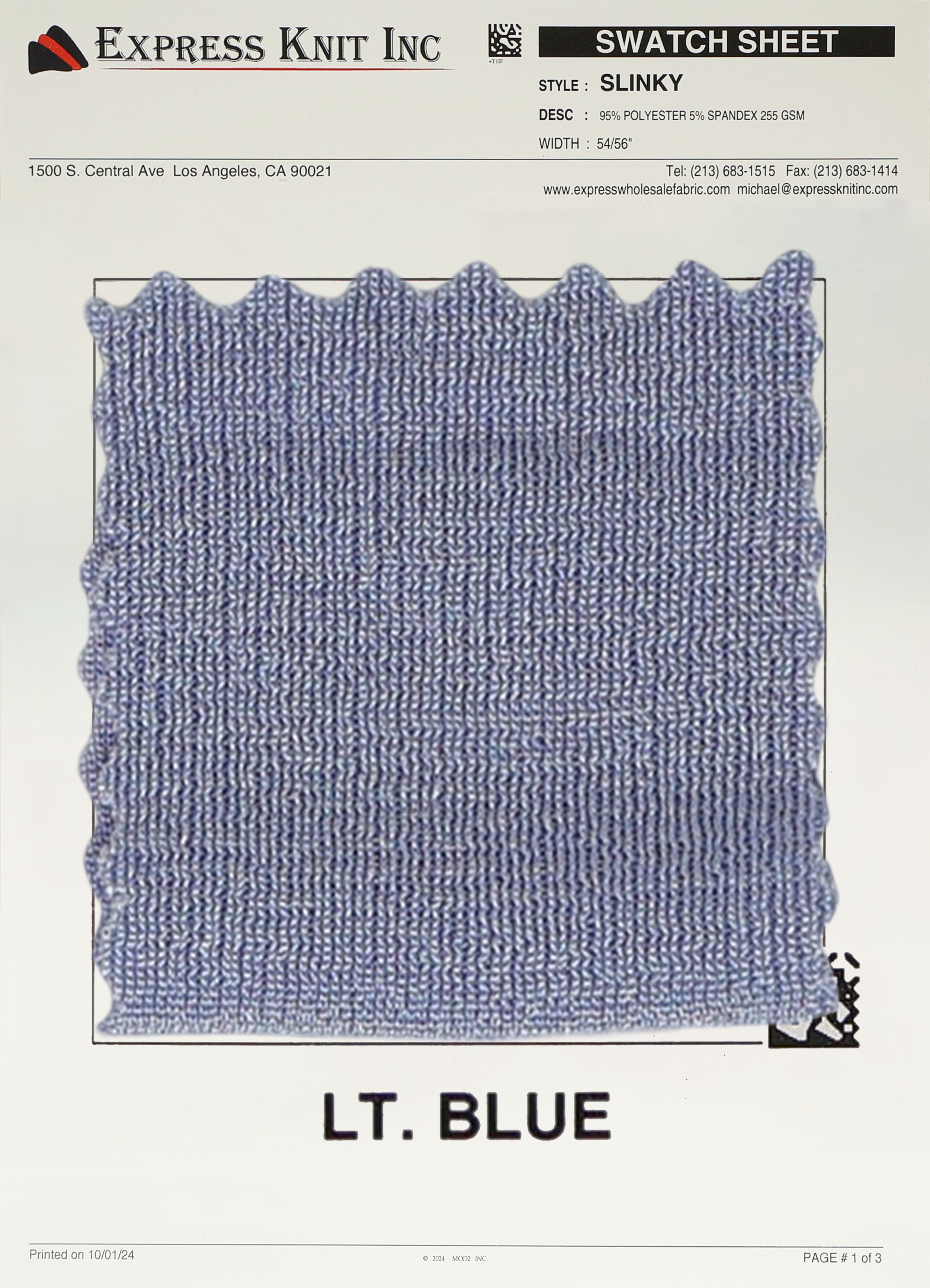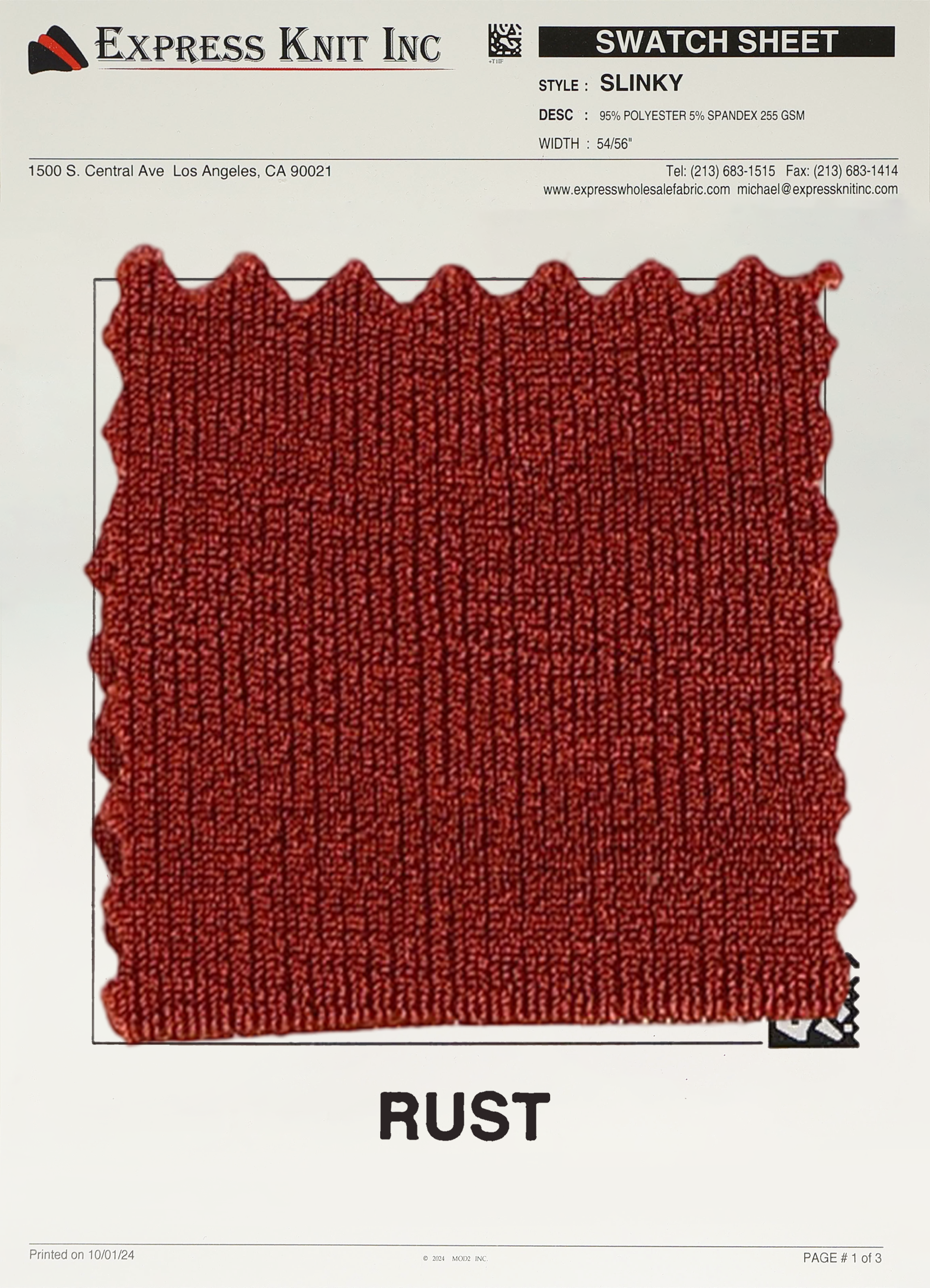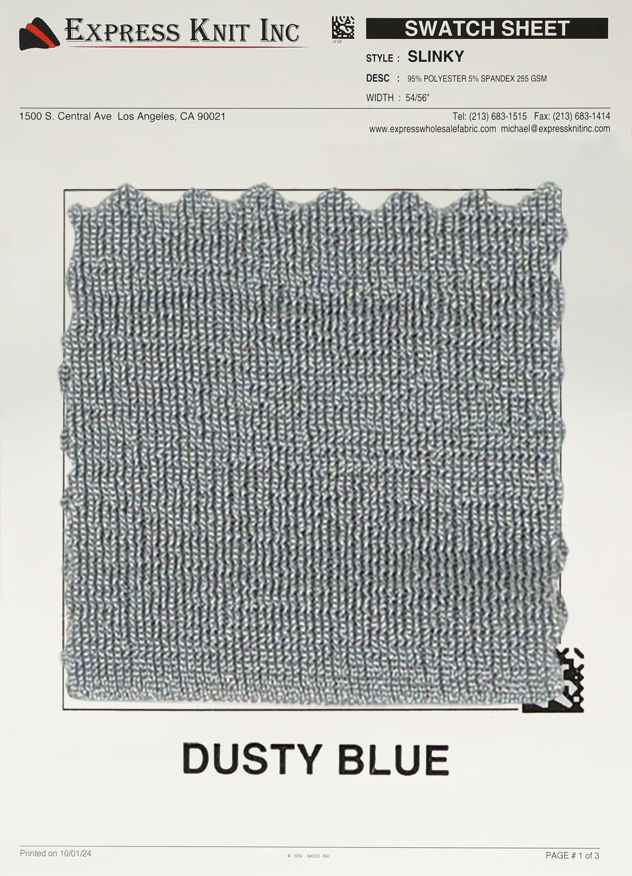 Our Slinky Fabric, available at wholesale pricing, offers an ultra-smooth, flowing texture with a luxurious drape that elegantly skims the body. Made from a durable polyester-spandex blend, this fabric features a 2-way stretch, providing comfortable flexibility while retaining shape. With a heavier weight of 255 GSM, Slinky Fabric has a substantial feel that’s perfect for creating garments with structure, movement, and fluidity. Its 54-56 inch width makes it efficient for large-scale projects, making it a versatile choice for designers and brands.