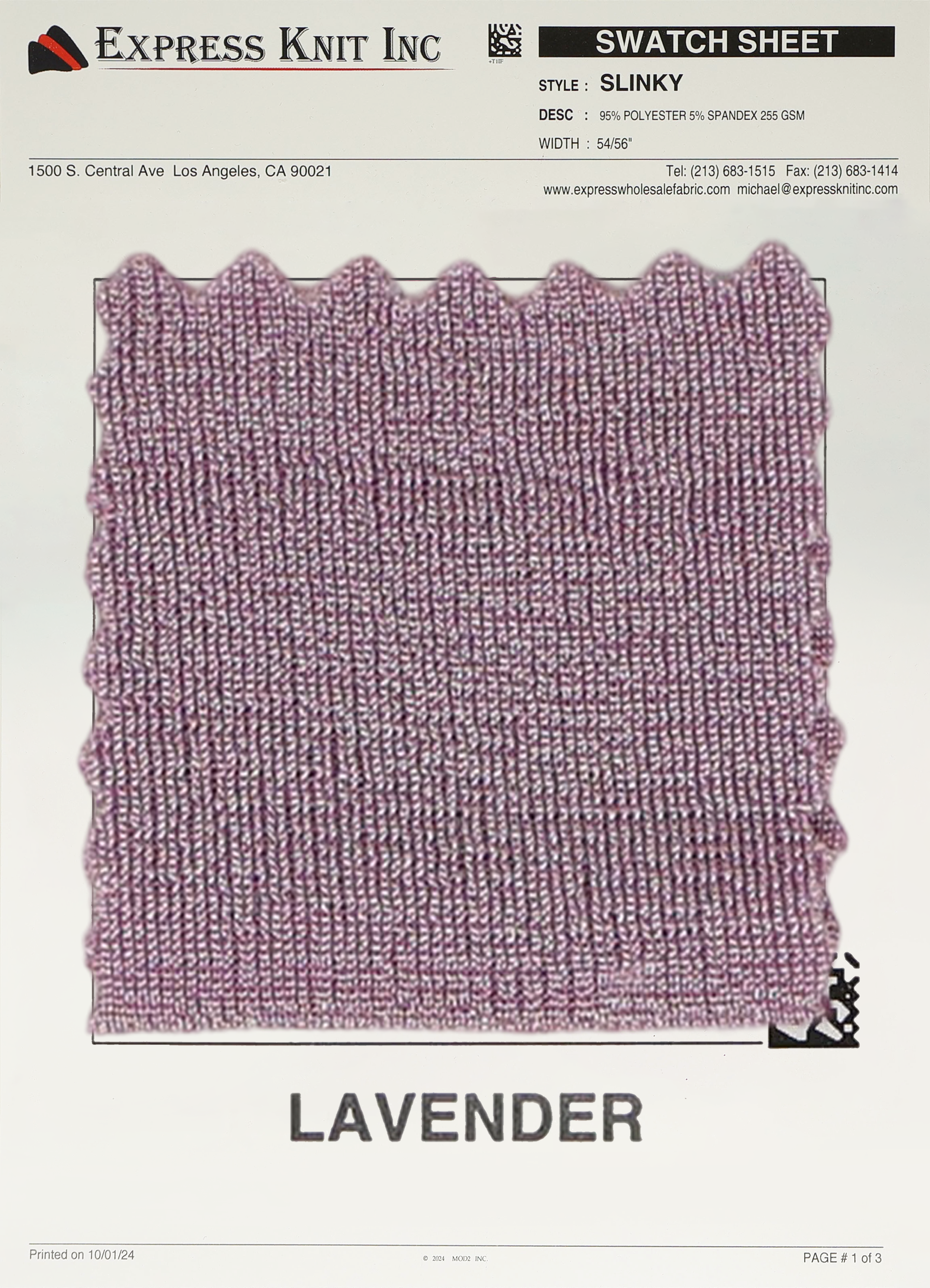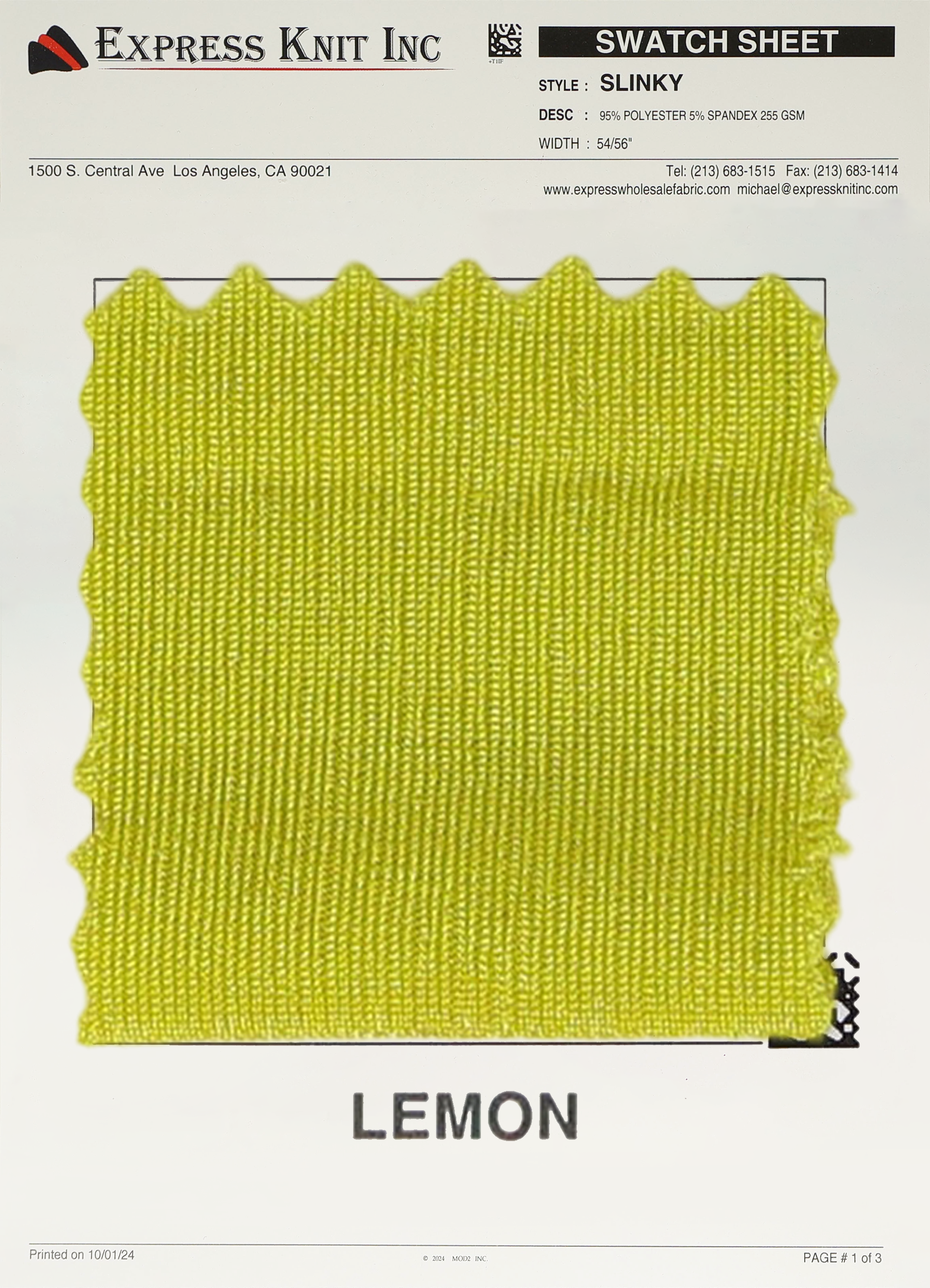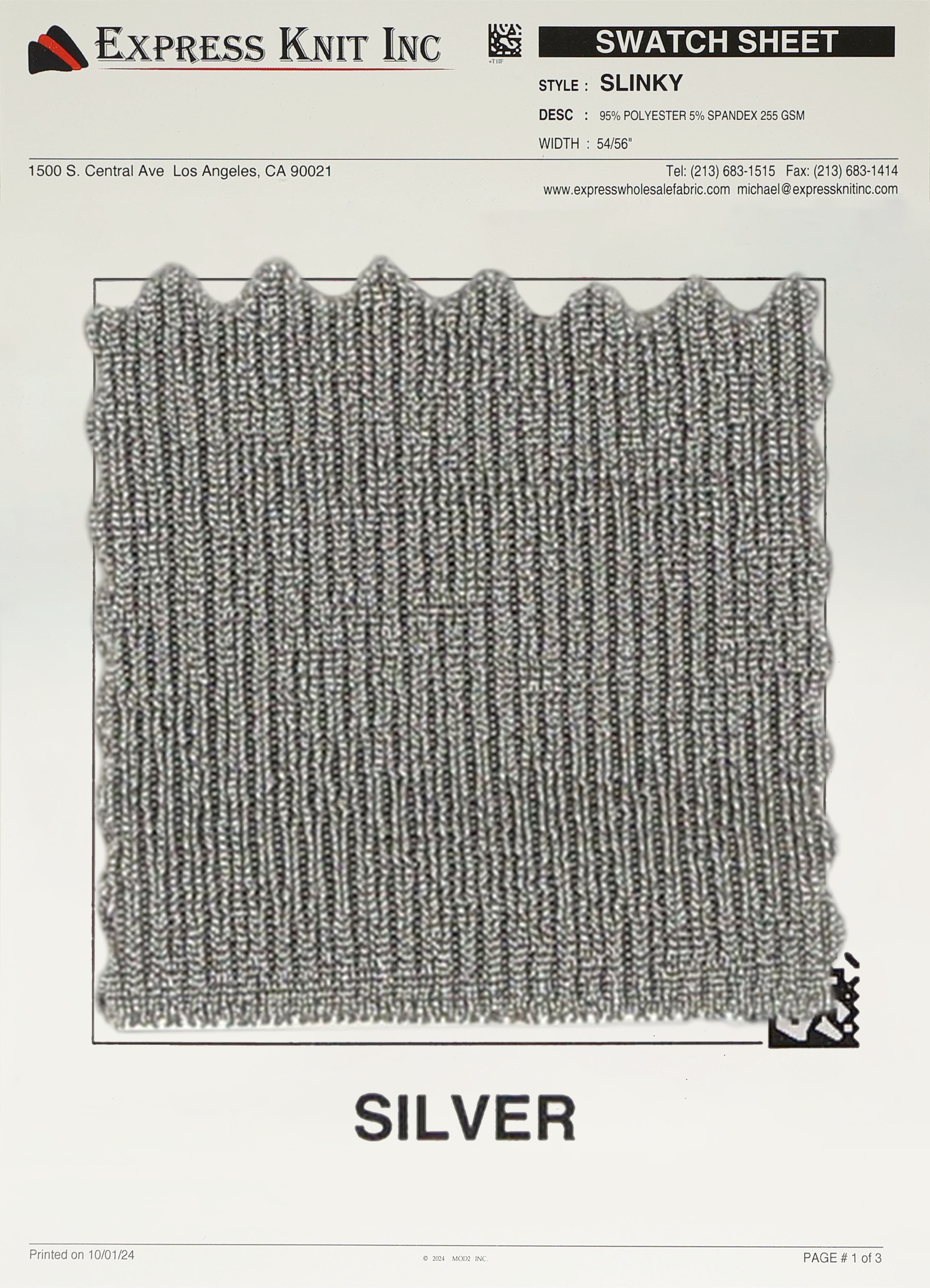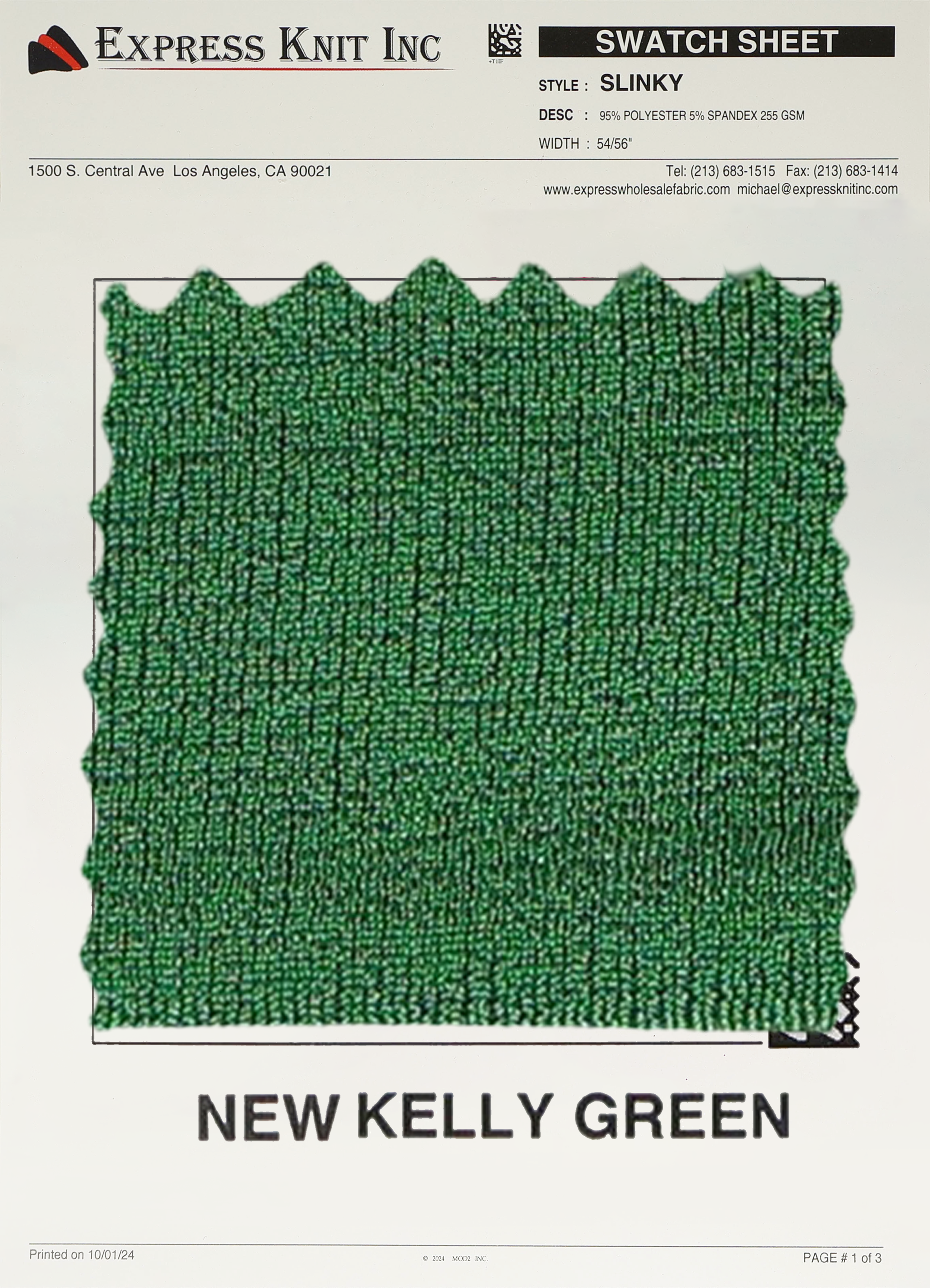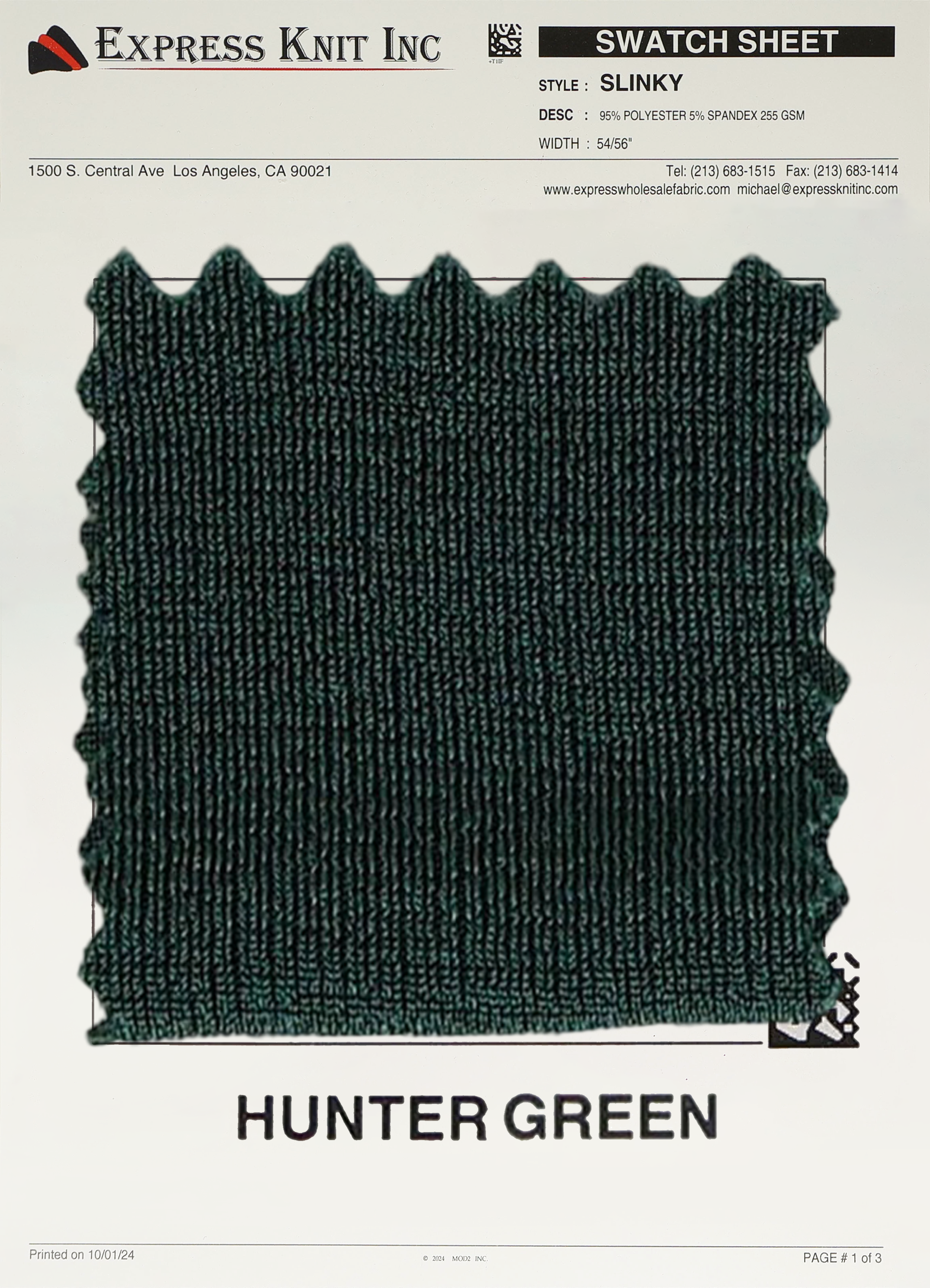 Our Slinky Fabric, available at wholesale pricing, offers an ultra-smooth, flowing texture with a luxurious drape that elegantly skims the body. Made from a durable polyester-spandex blend, this fabric features a 2-way stretch, providing comfortable flexibility while retaining shape. With a heavier weight of 255 GSM, Slinky Fabric has a substantial feel that’s perfect for creating garments with structure, movement, and fluidity. Its 54-56 inch width makes it efficient for large-scale projects, making it a versatile choice for designers and brands.