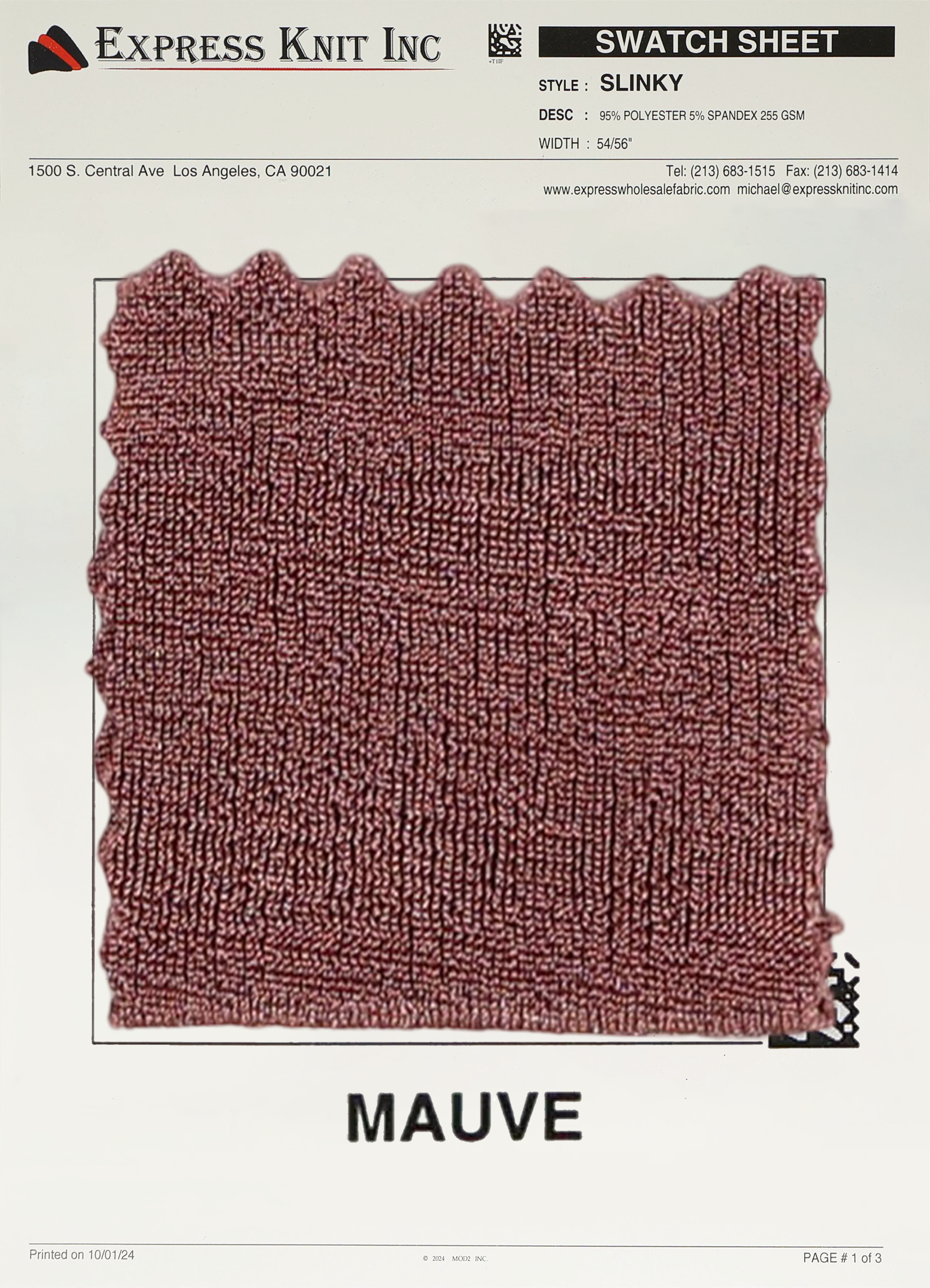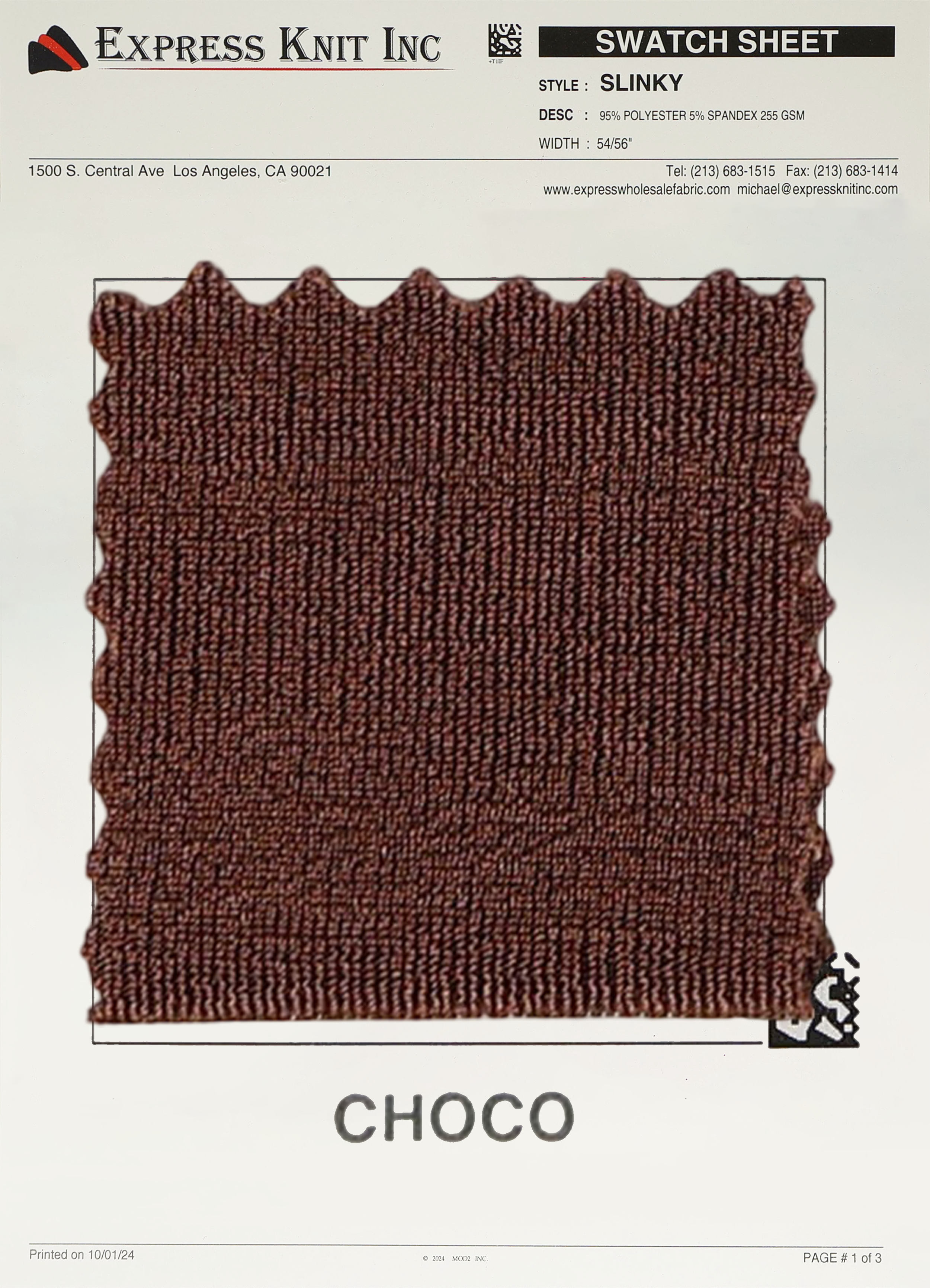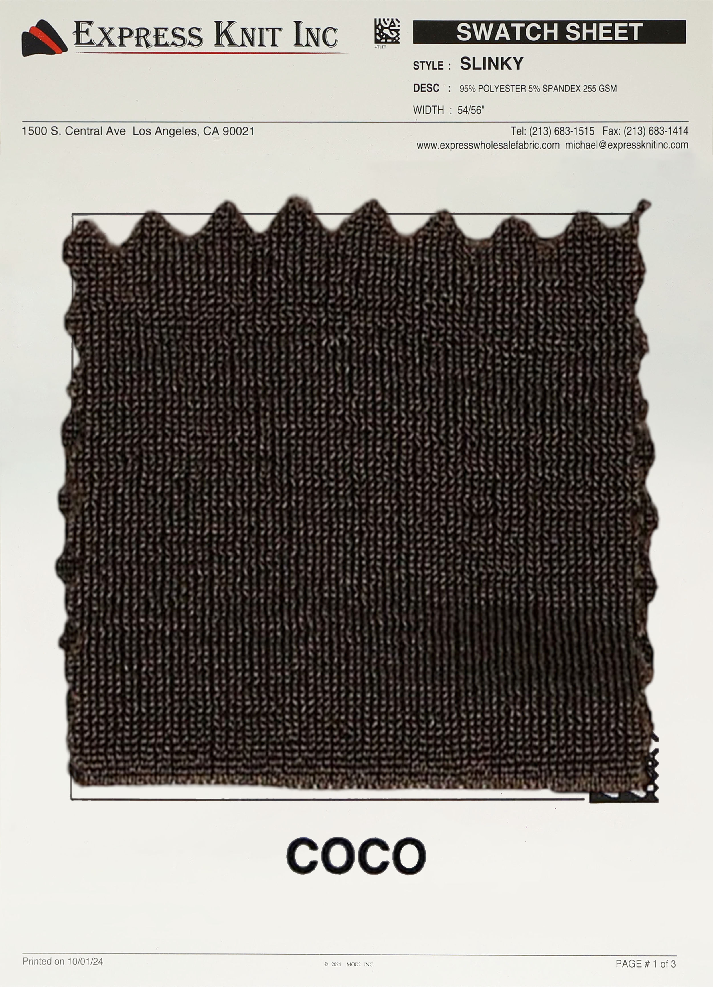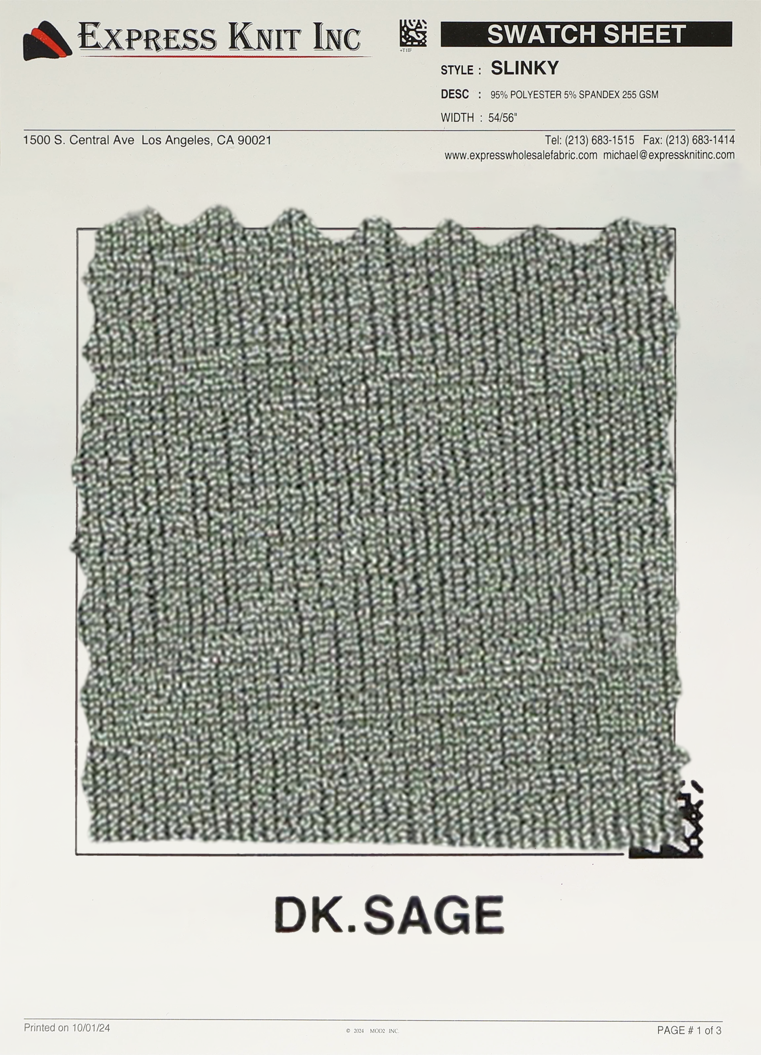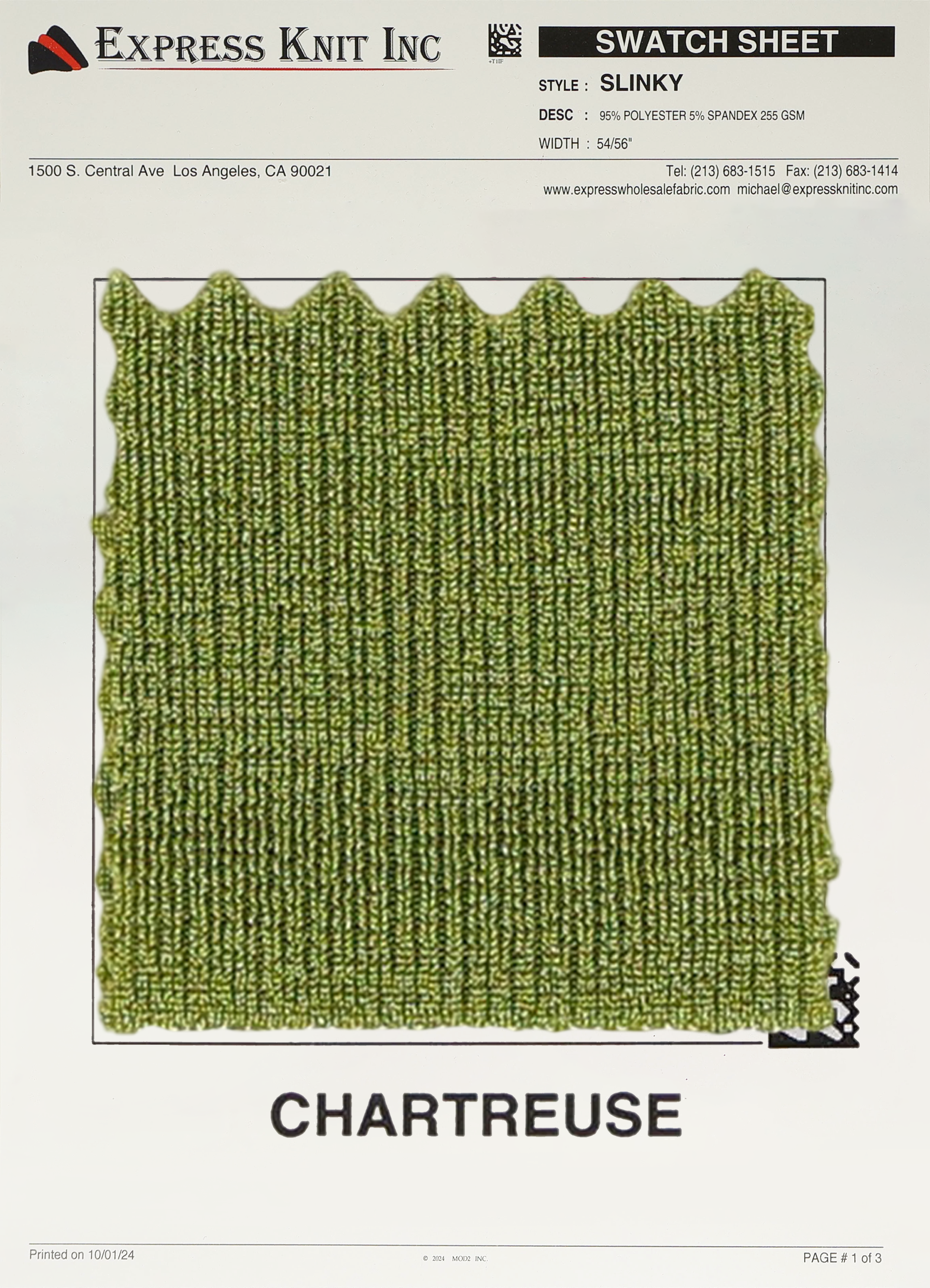 Our Slinky Fabric, available at wholesale pricing, offers an ultra-smooth, flowing texture with a luxurious drape that elegantly skims the body. Made from a durable polyester-spandex blend, this fabric features a 2-way stretch, providing comfortable flexibility while retaining shape. With a heavier weight of 255 GSM, Slinky Fabric has a substantial feel that’s perfect for creating garments with structure, movement, and fluidity. Its 54-56 inch width makes it efficient for large-scale projects, making it a versatile choice for designers and brands.